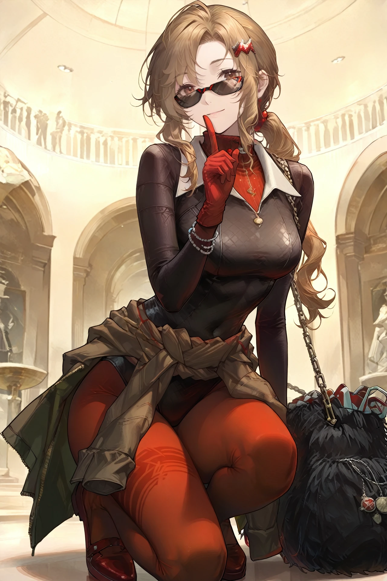melania \(reverse:1999\), melania-thief, blonde hair, long hair, hair ornament, ponytail, brown eyes, sidelocks, sunglasses, red gloves, black leotard, long sleeves, collared leotard, turtleneck sweater, red sweater, jacket around waist, red pantyhose, red footwear,