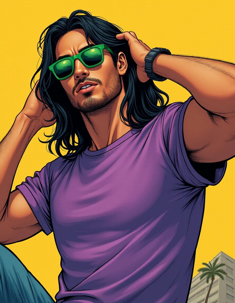 1boy, black hair, ((medium hair)), brown eyes, green sunglasses, ((tanned skin)), beard stubble, purple t-shirt