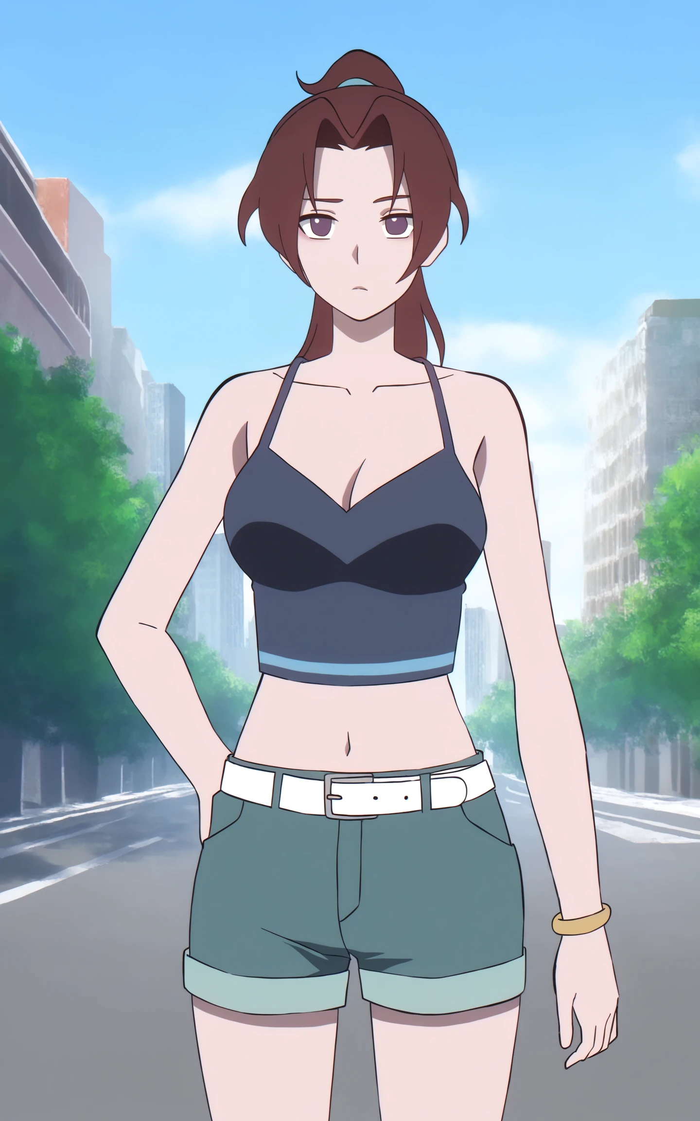 ptonq outfit, crop top, tank top, camisole, midriff, shorts, belt, bracelet, sneakers