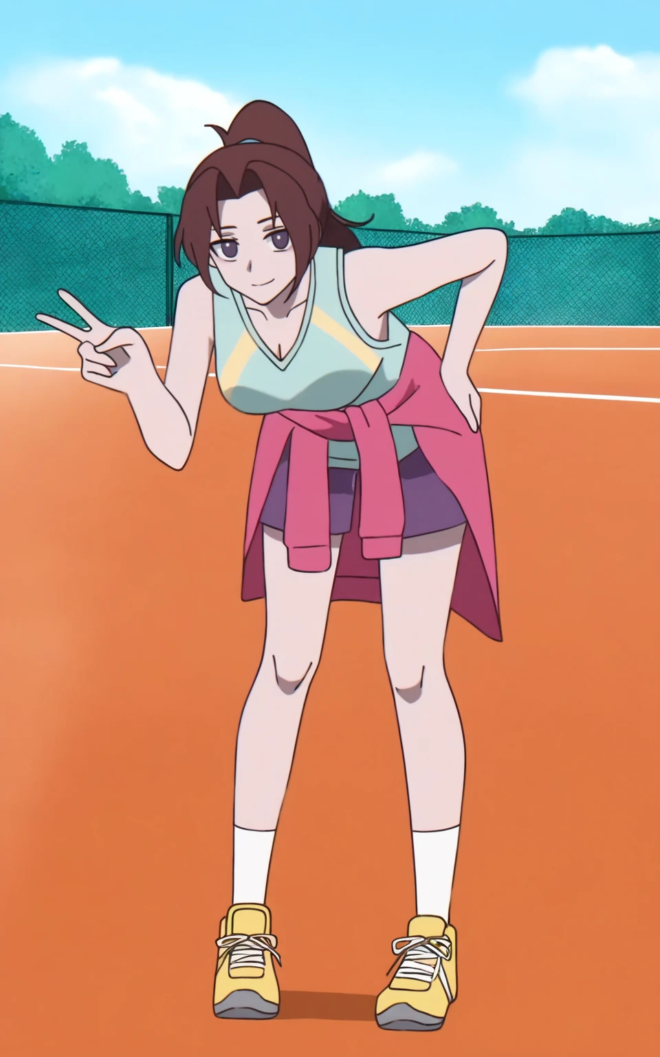 fenseq outfit, shirt, sleeveless shirt, tank top, shorts, purple shorts, clothes around waist, shoes, yellow footwear, socks