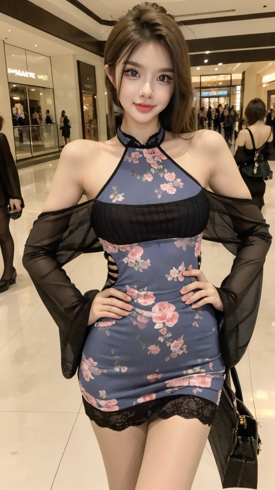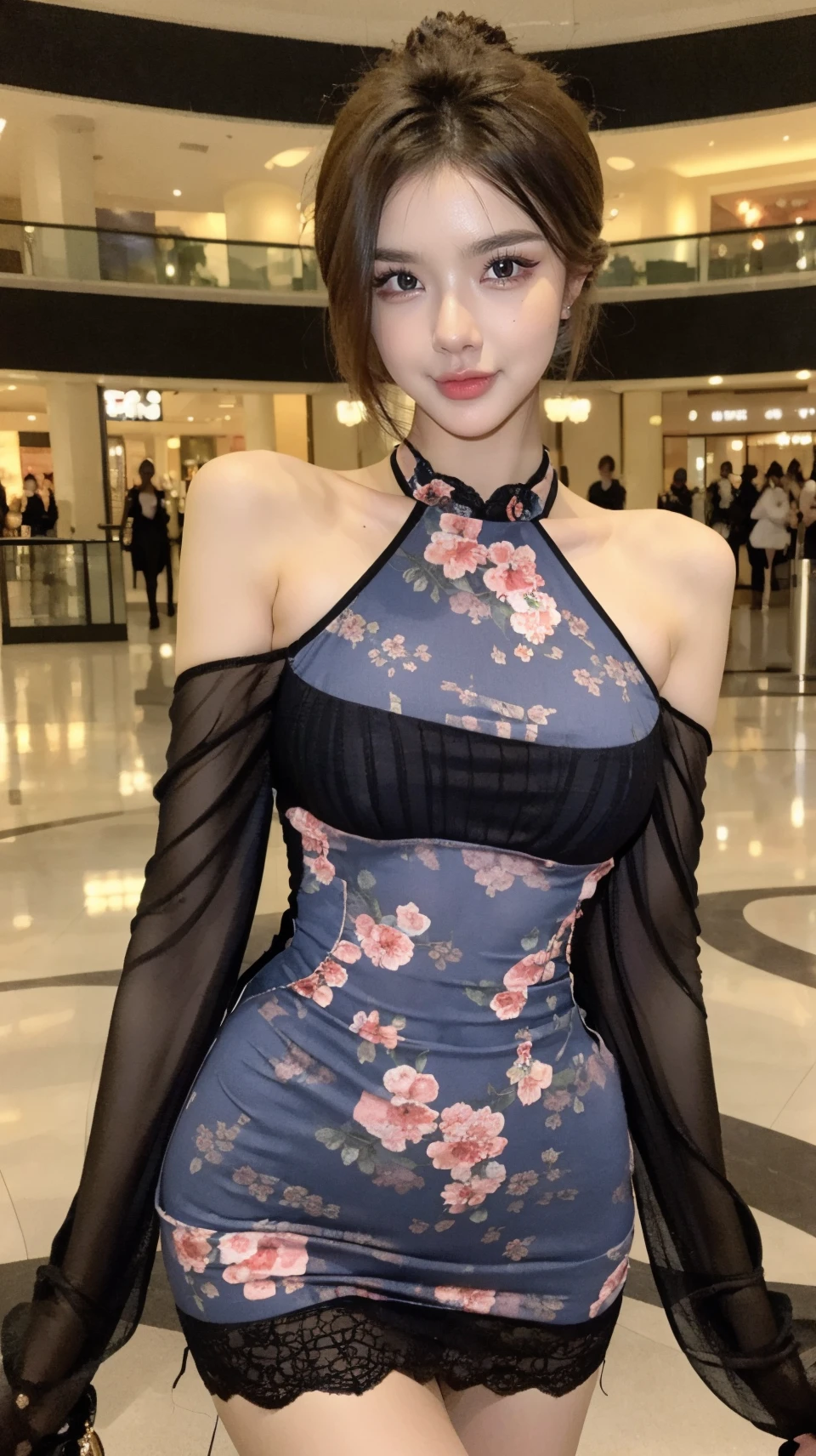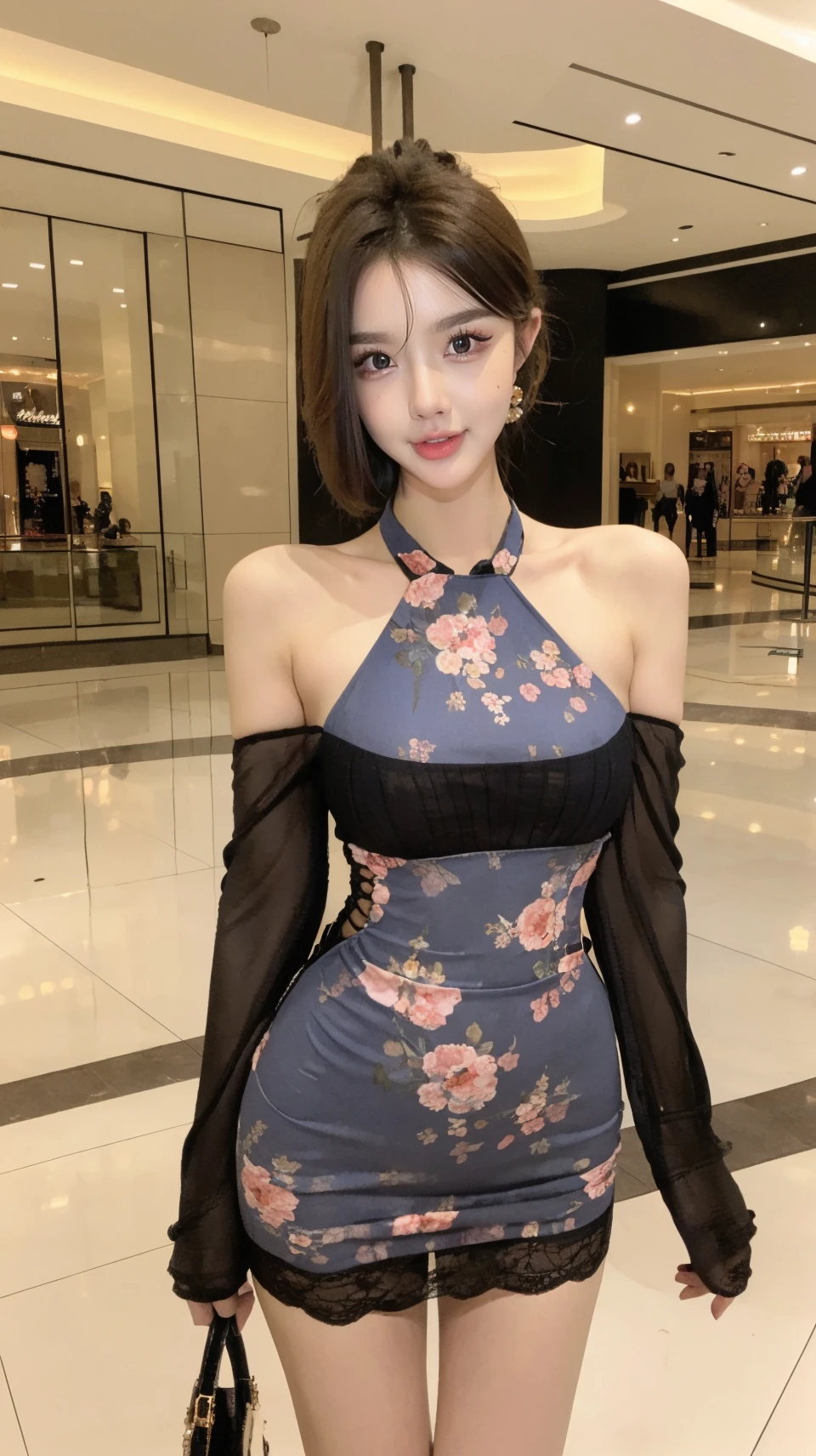 MIS,dress,floral print,bare shoulders,black sleeves,
