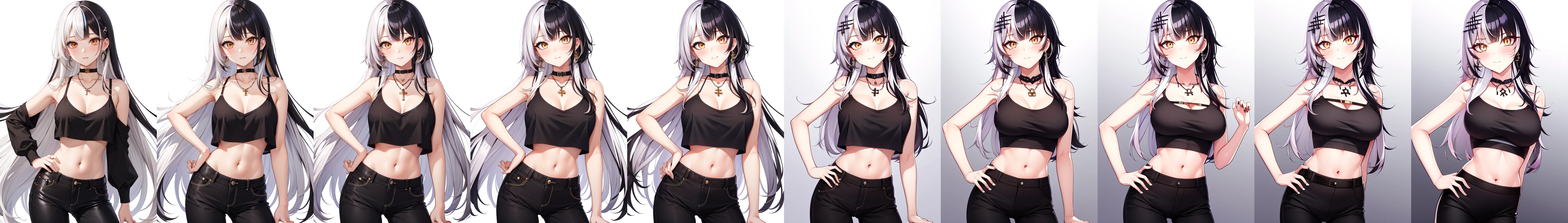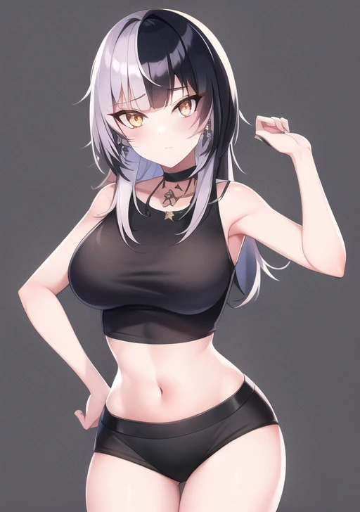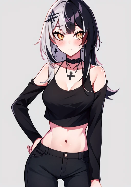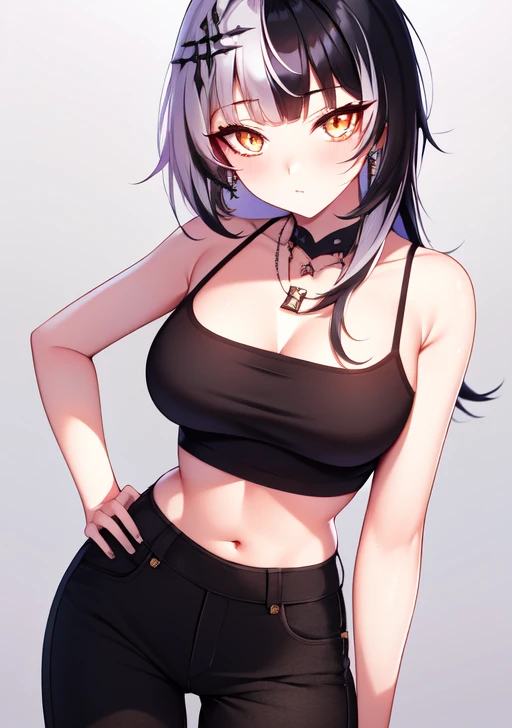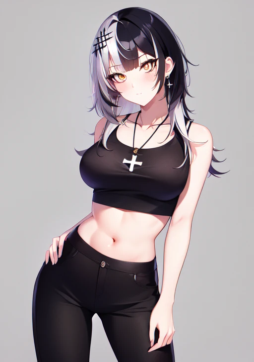 prompt used : shiori_novella, 1girl, solo, long hair, breasts, looking at viewer, blush, bangs, simple background, shirt, black hair, hair ornament, white background, navel, bare shoulders, jewelry, medium breasts, closed mouth, collarbone, yellow eyes, white hair, grey hair, multicolored hair, cowboy shot, earrings, midriff, pants, necklace, stomach, two-tone hair, streaked hair, crop top, orange eyes, hand on hip, bare arms, black shirt, black pants, cross, cross necklace