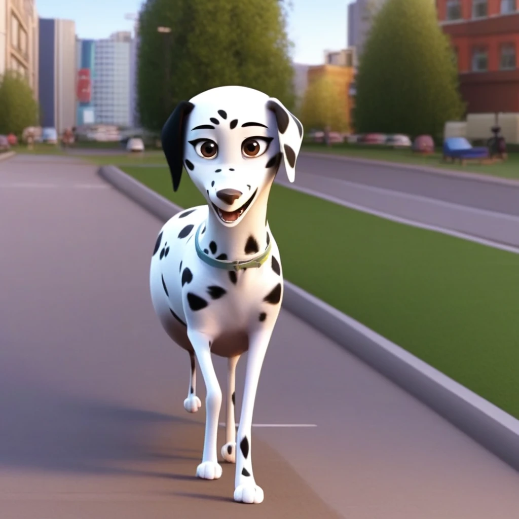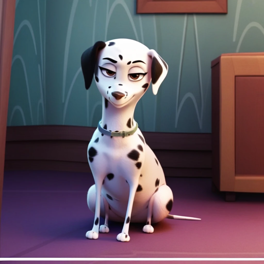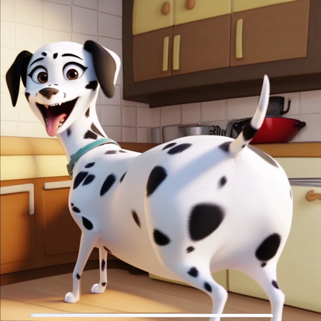 Prompt: EmberFH, dog, feral, Dalmatian, white fur, black spots, brown eyes, blue collar
