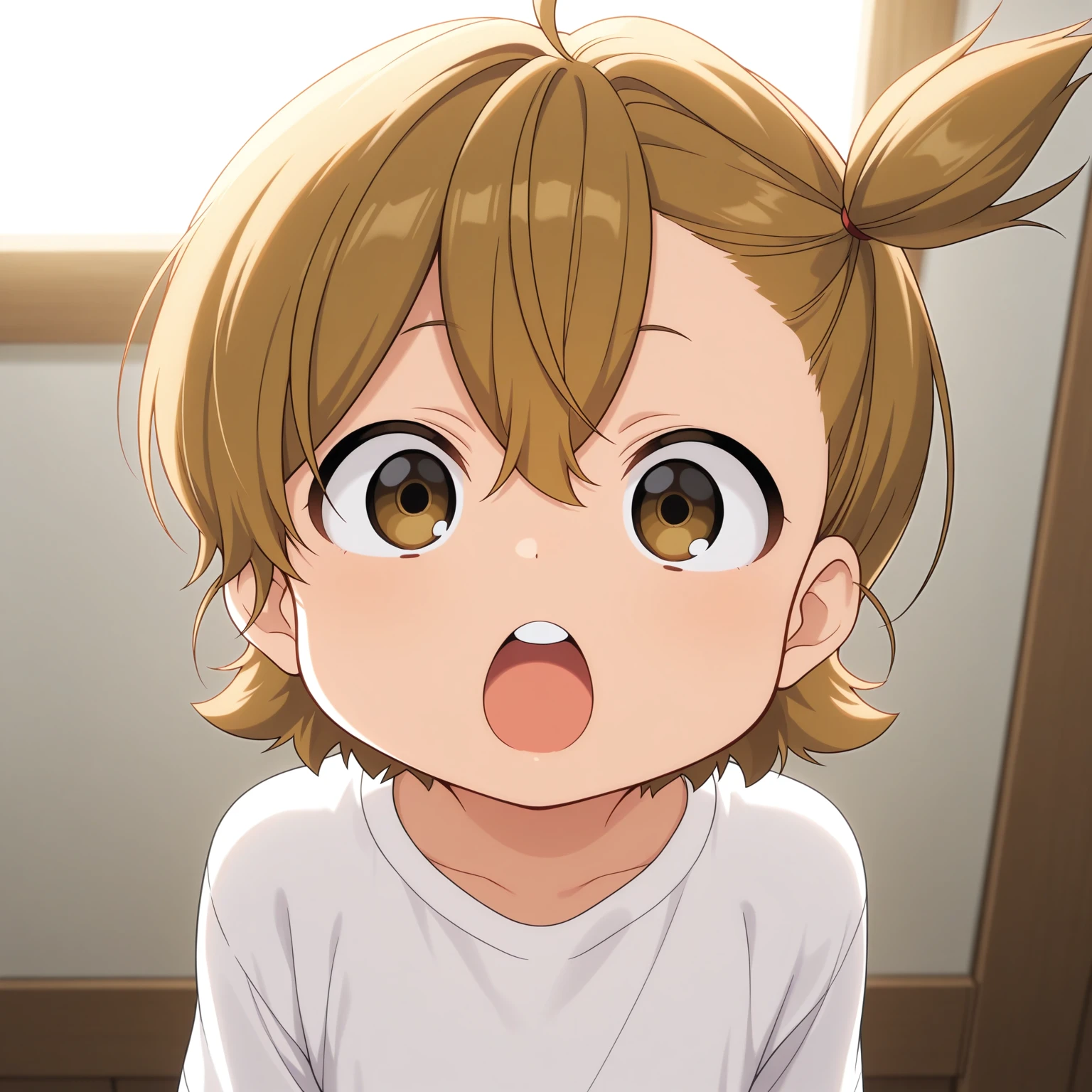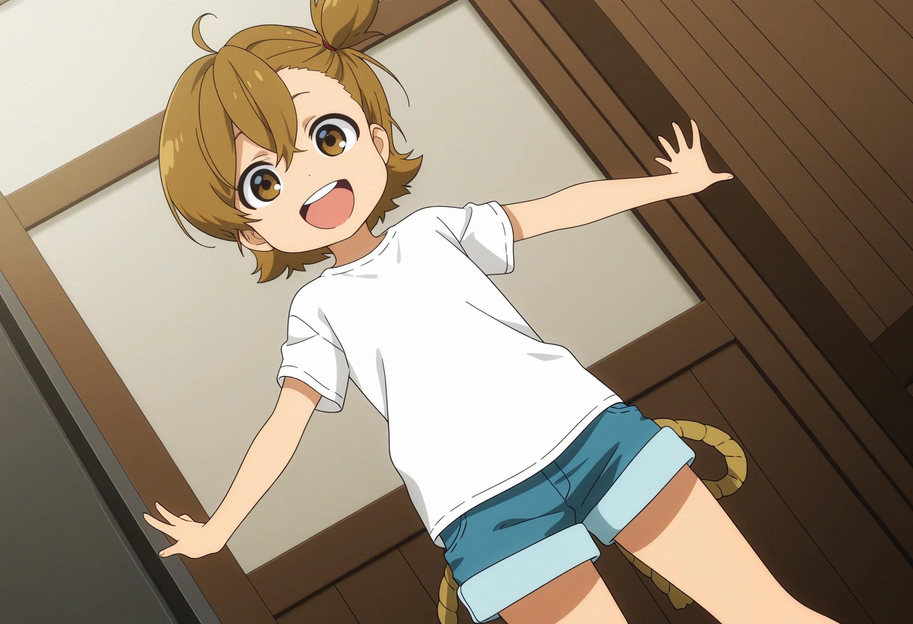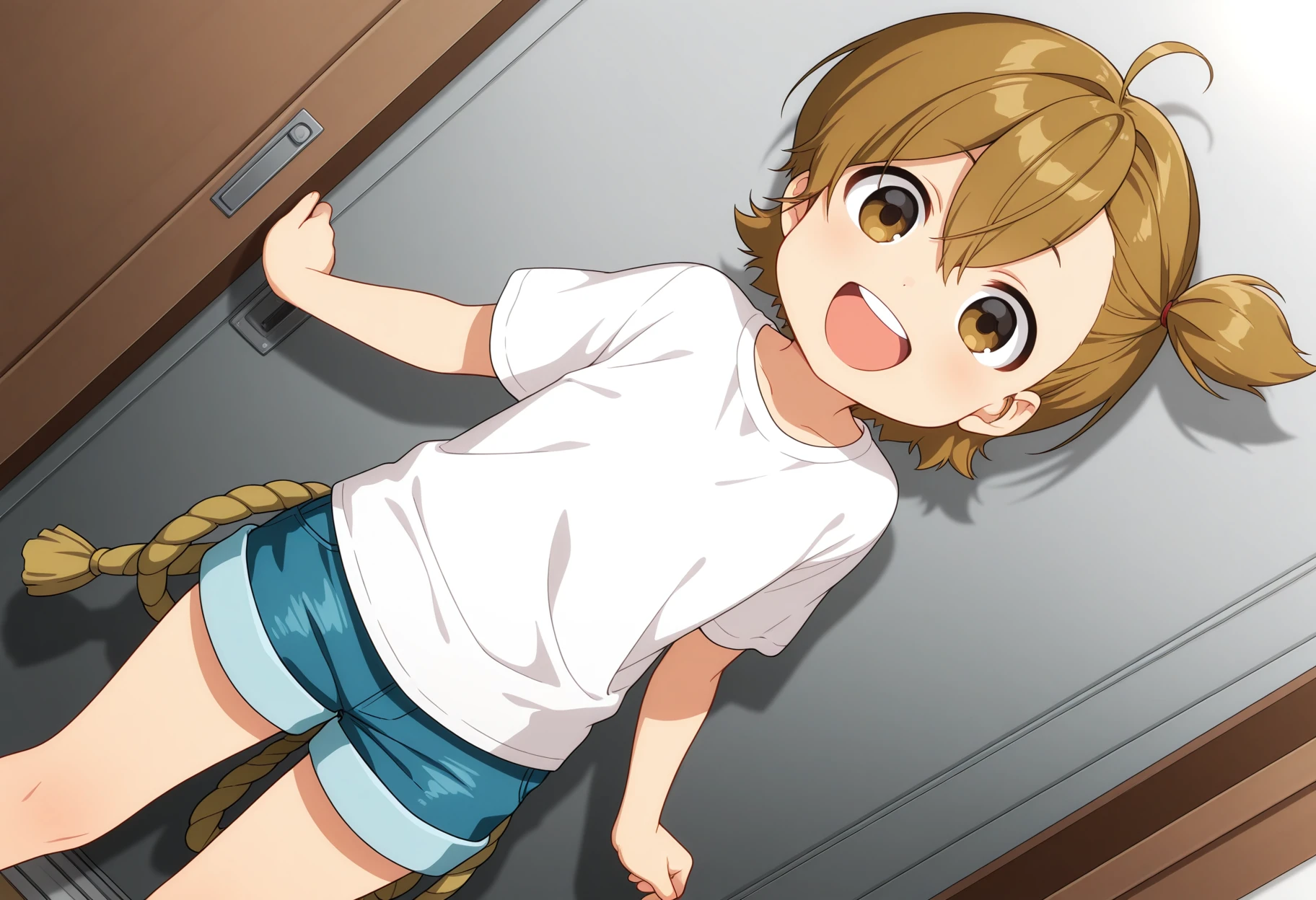 naru, brown eyes, short hair, brown hair, side ponytail, ahoge, white shirt, t-shirt, denim shorts, rope