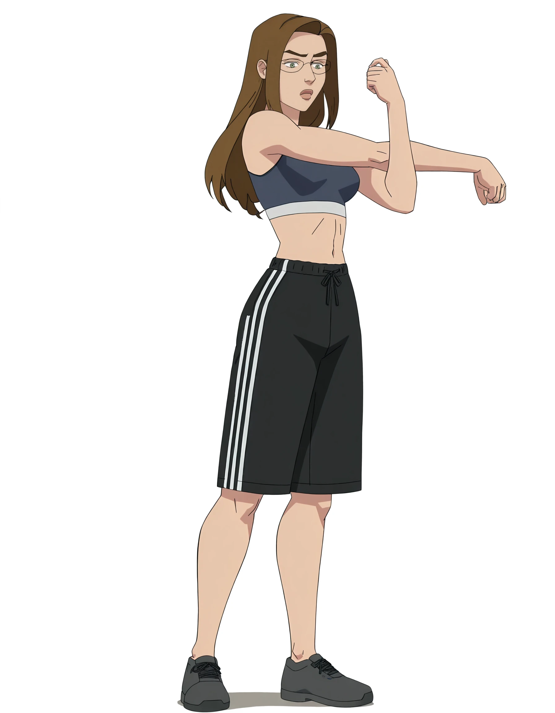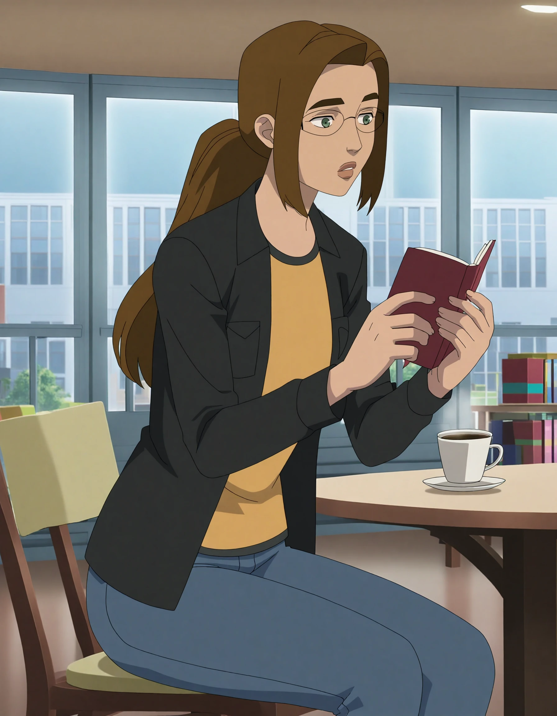 shrkr23, 1girl, glasses, green eyes, thick lips, brown hair, ponytail,