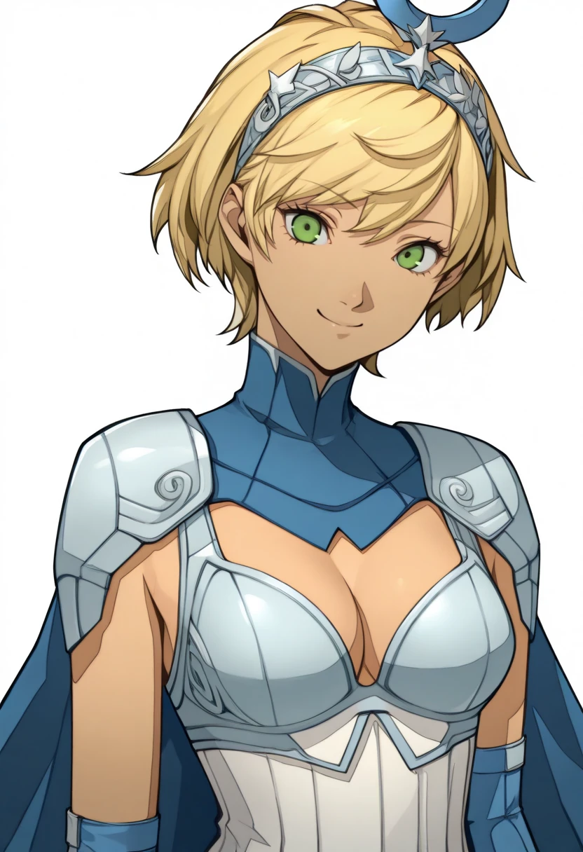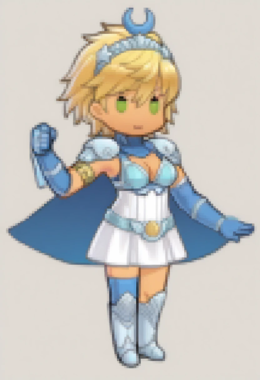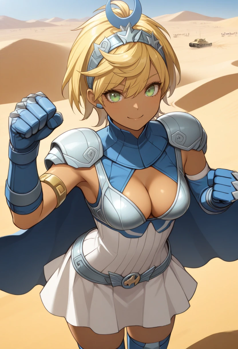 Tags: art3m1ssmtv, dark skin, blonde hair, short hair, green eyes, hair ornament, dress, cleavage, elbow gloves, cape, thighhighs, kneeboots,