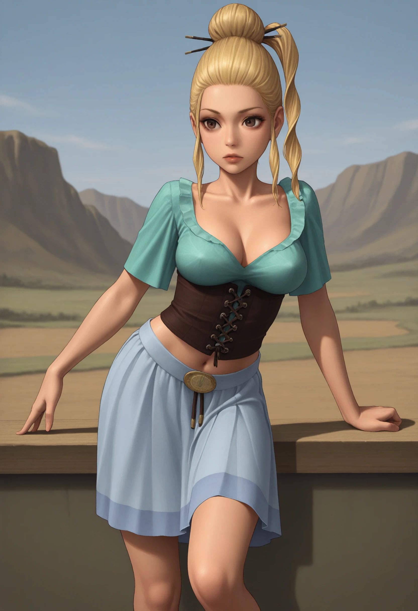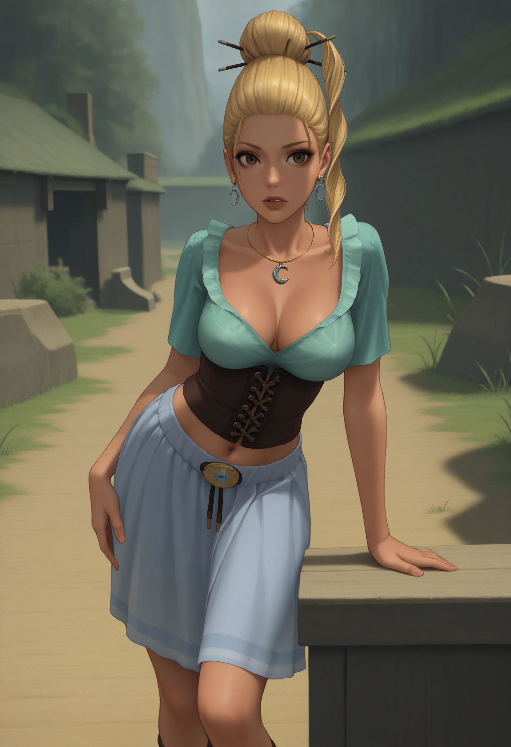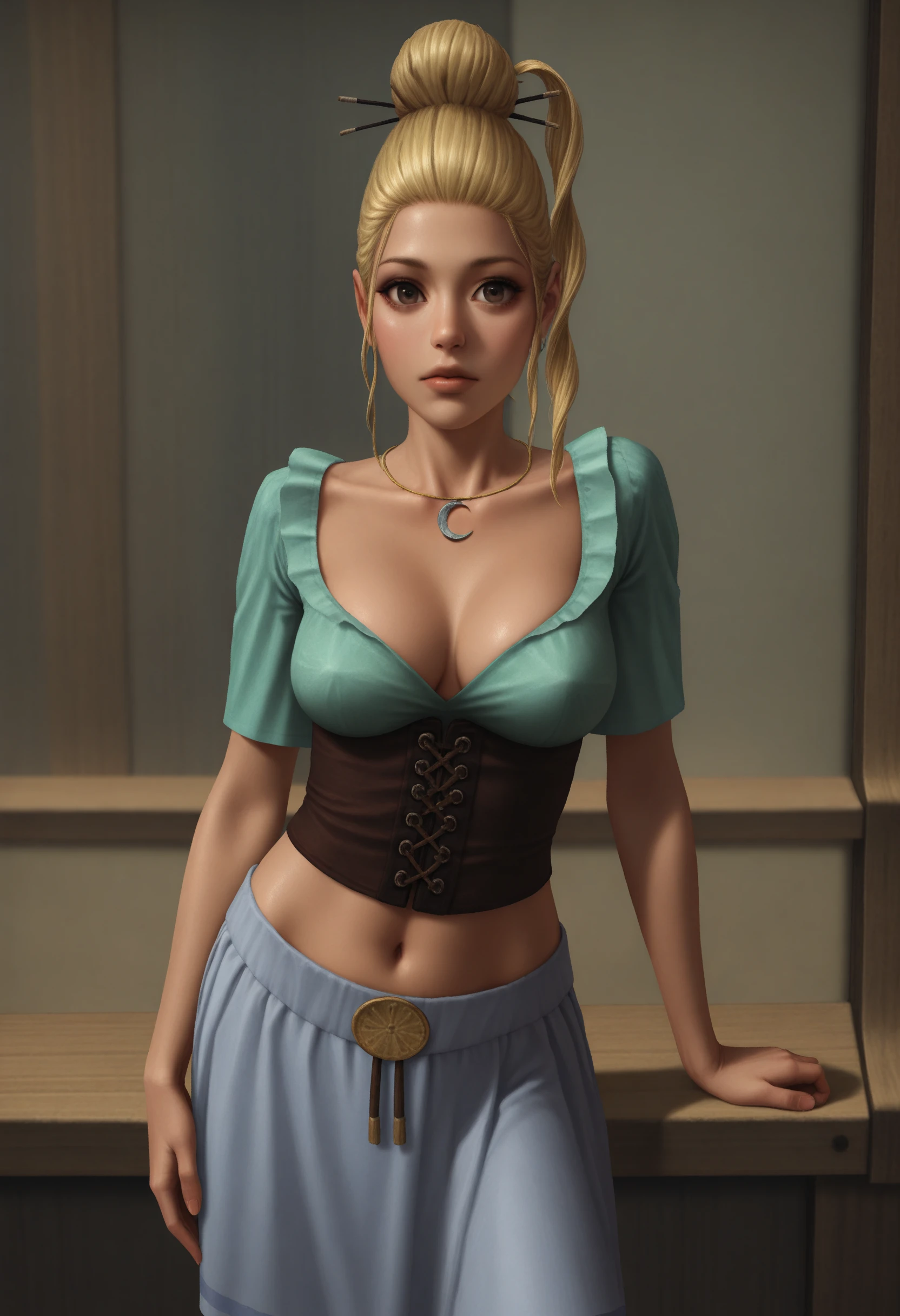 brown eyes, blonde hair, hair bun, hair stick, side ponytail, earrings, pendant collar, corset, peasant blouse, skirt