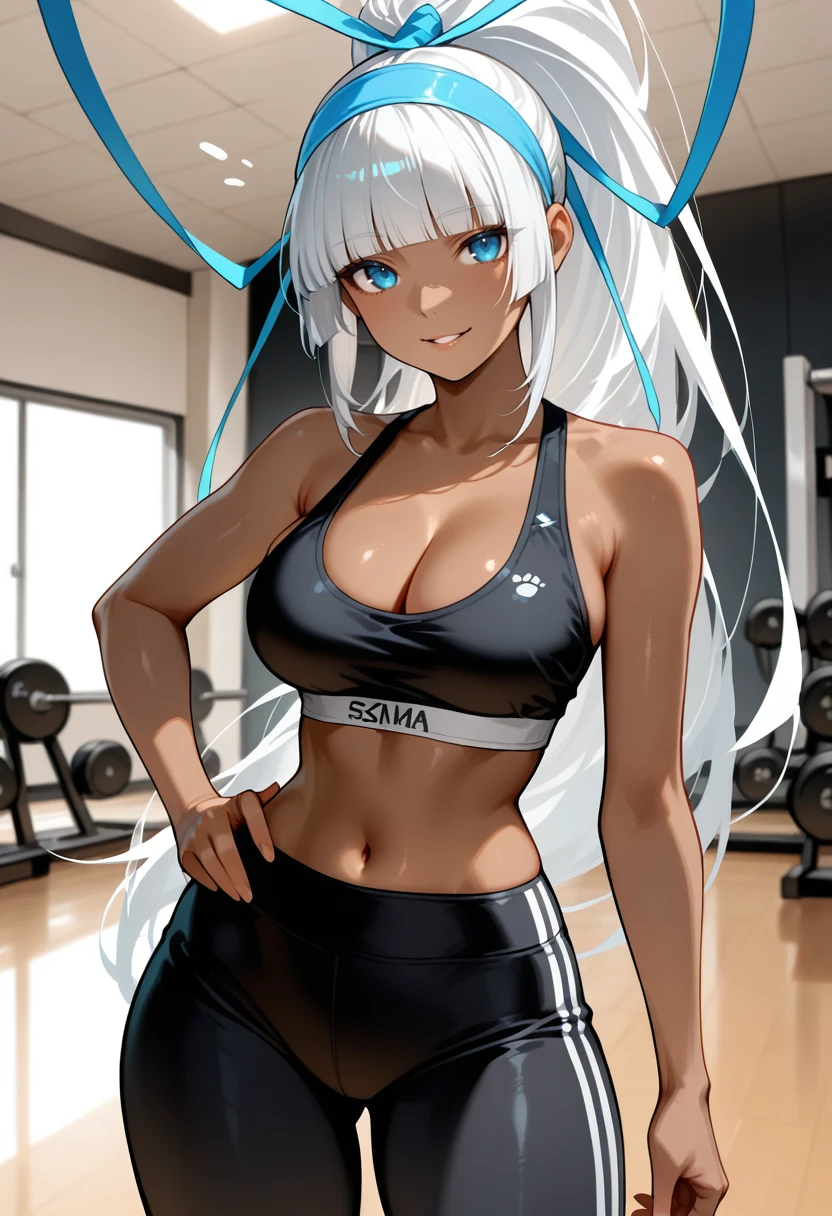 "SSMAKIJ,dark-skinned female, white hair, blunt bangs, long hair,high ponytail, hair ribbon, blue eyes, blue hairband, bandaged eye, white bikini, armlet, white sarong, blue glove, single glove, arm guards"