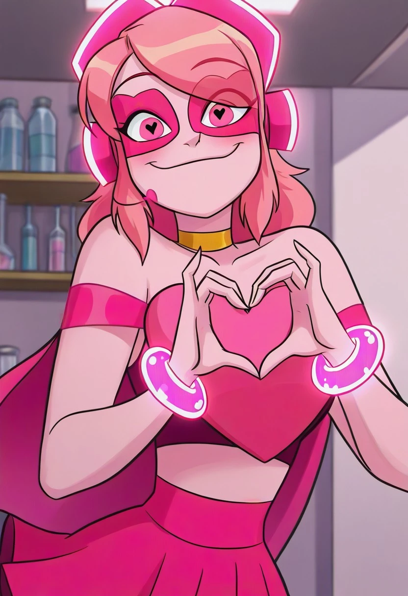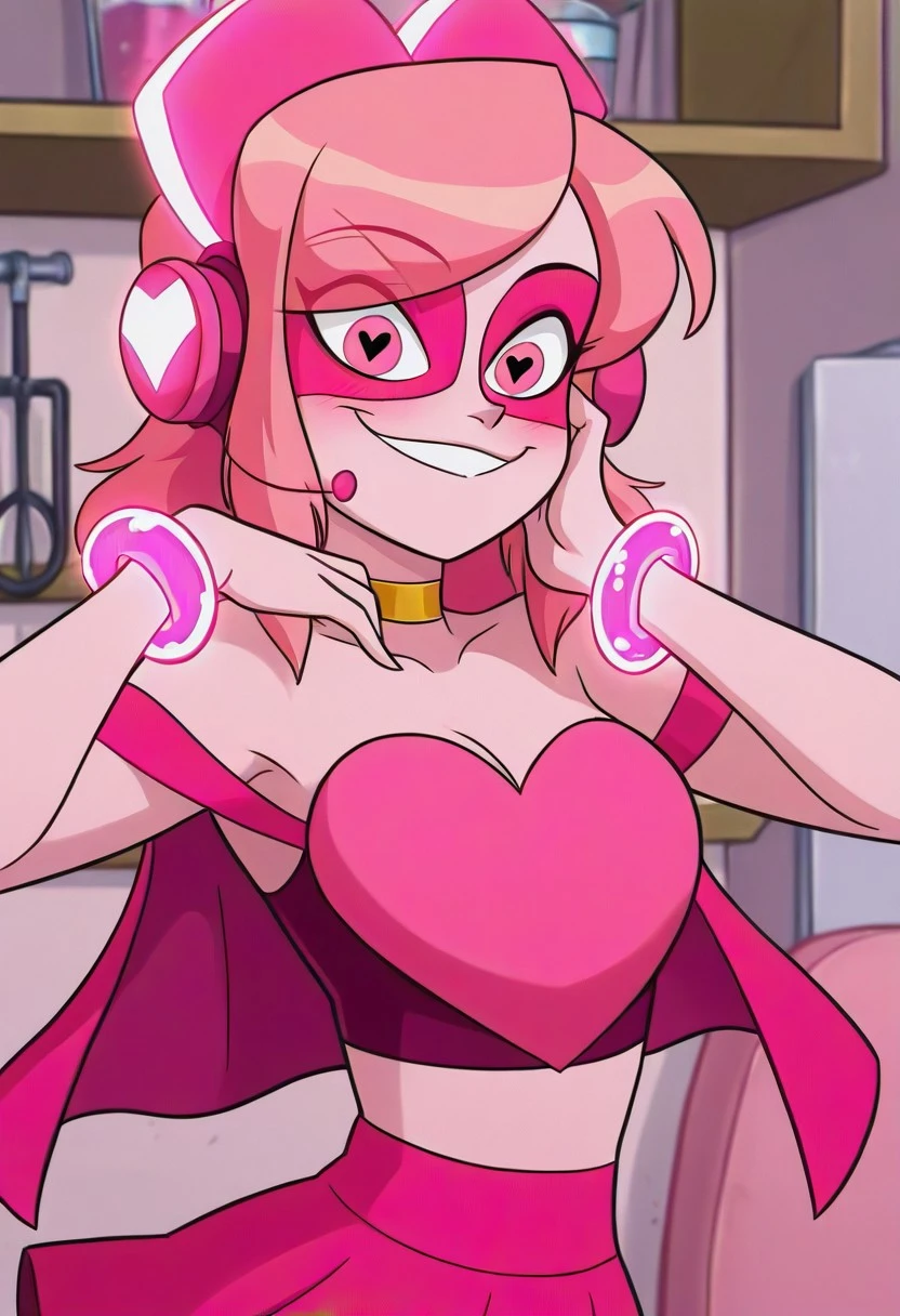 missheev1, 1girl,pink skin, medium hair, pink hair, pink eyes, pink eyes mask, pink headset, golden choker,heart-shaped pupils,