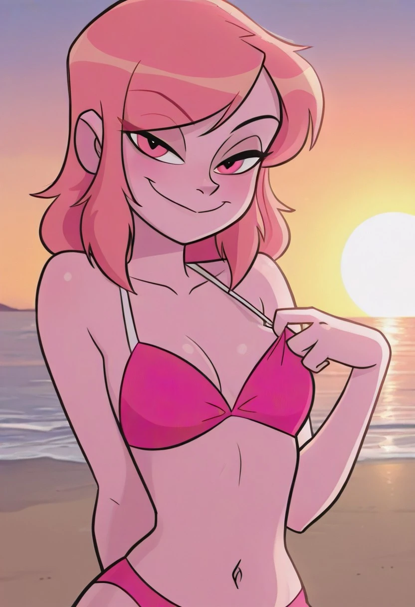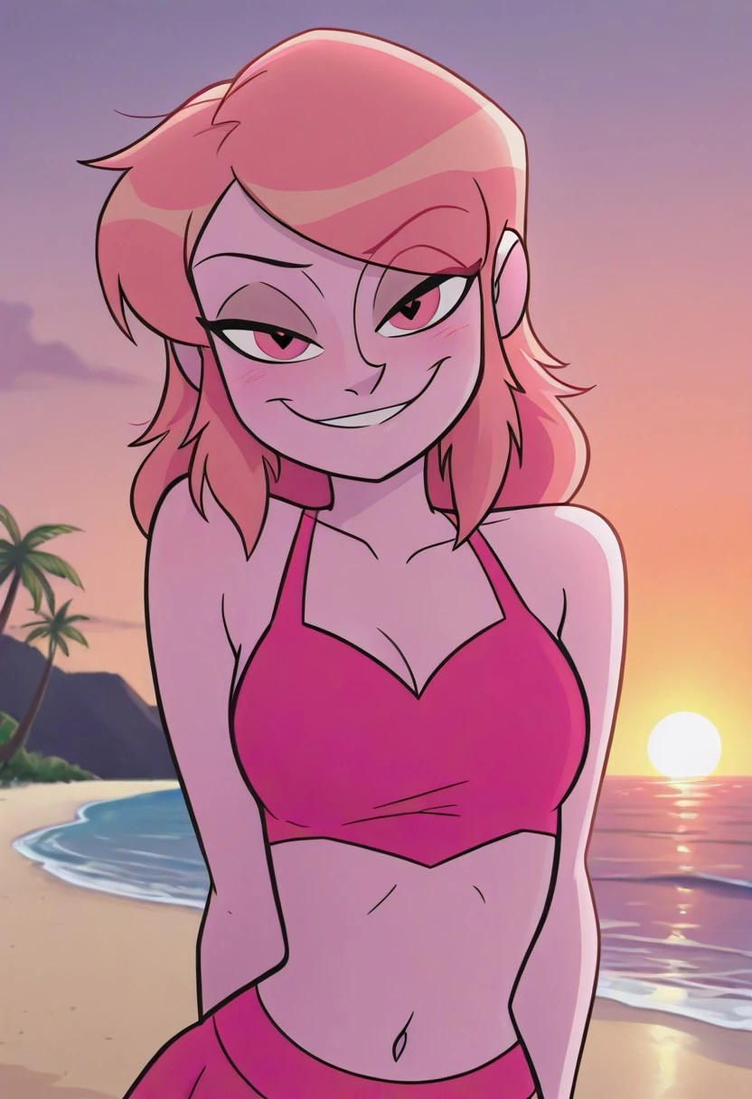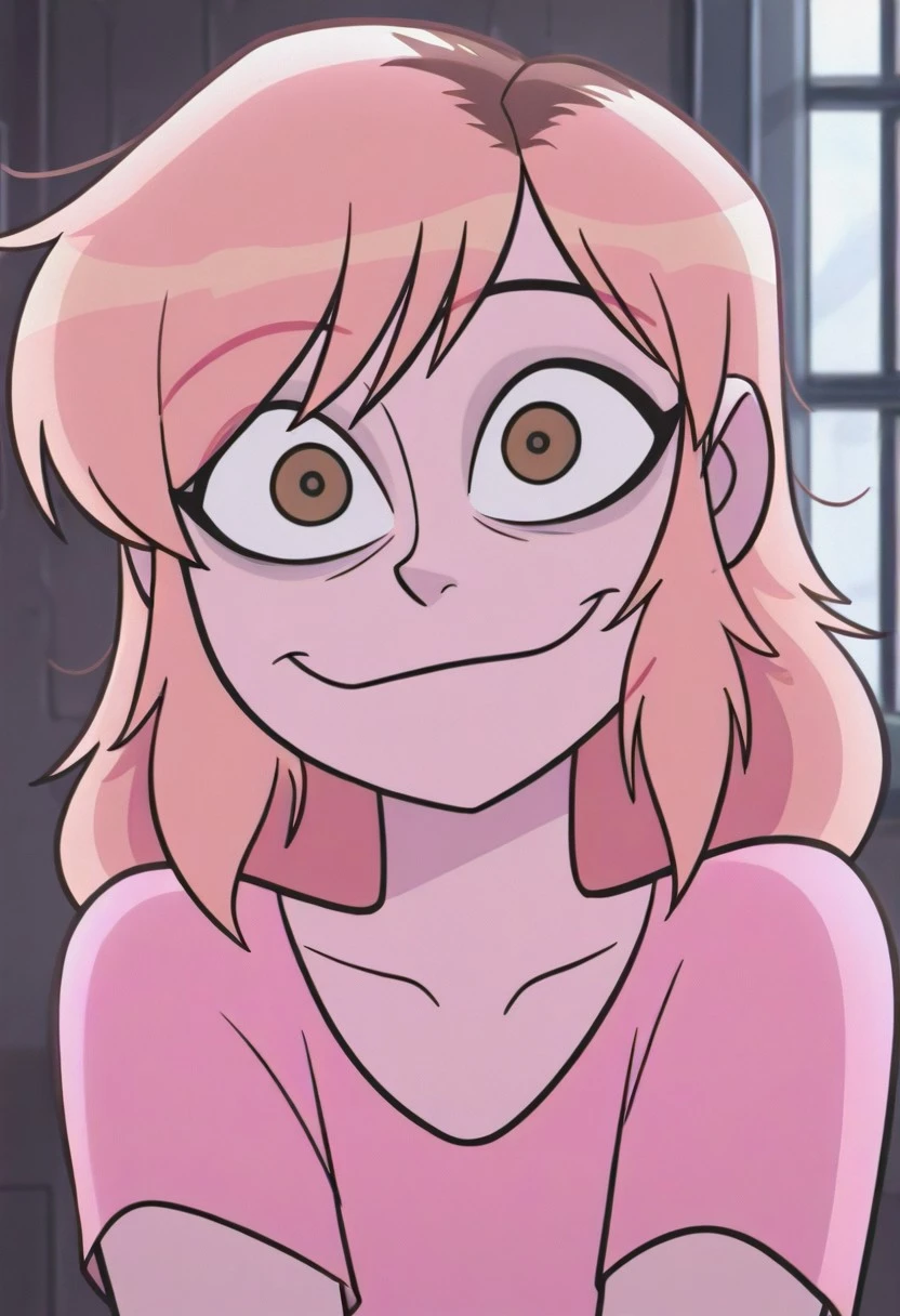 missheev1, 1girl,pink skin, medium hair, Light pink hair, brown roots, brown eyes