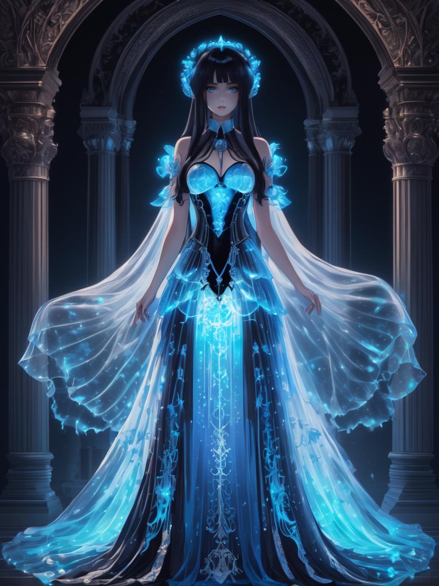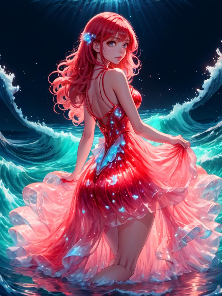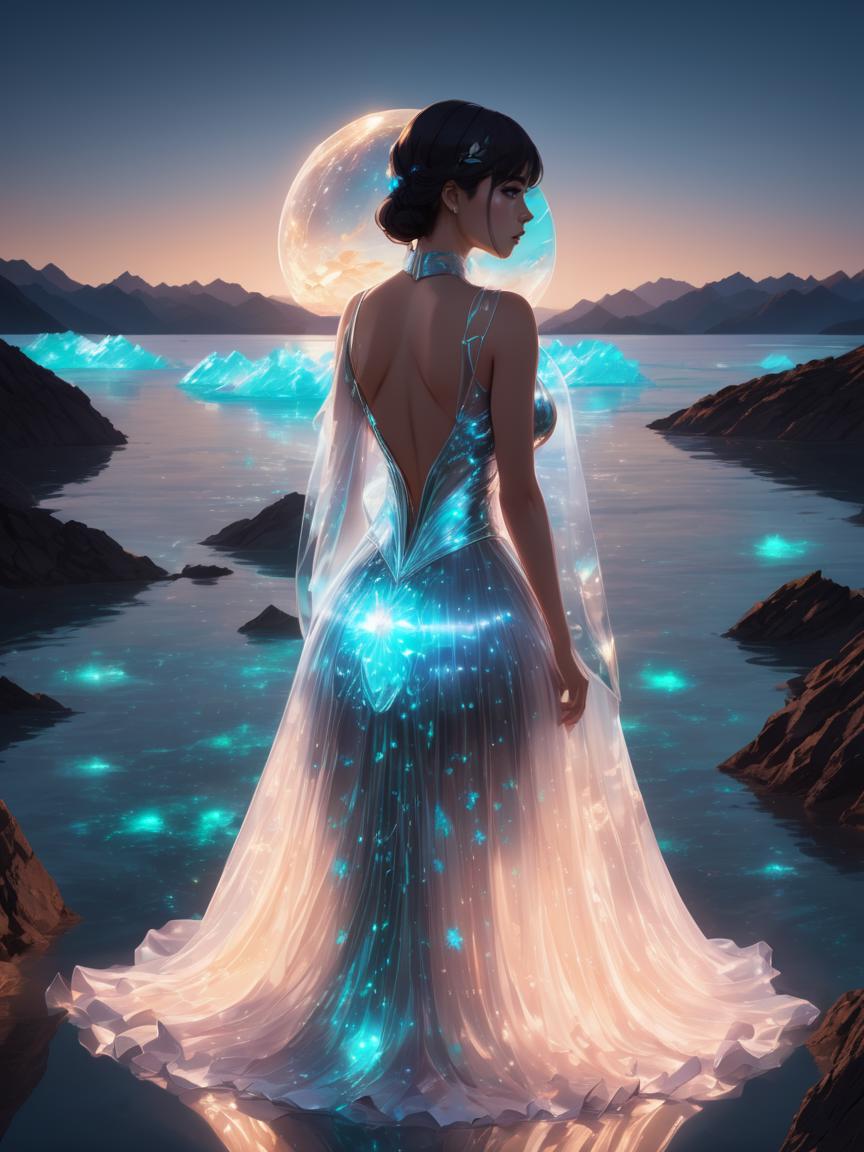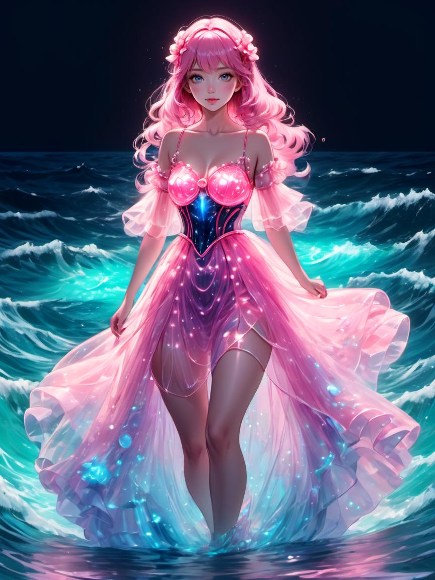 This LoRA produces outfits with a bioluminescent glow and a scyphozoan appeal. Due to bioluminescence requiring a low-light environment this LoRA has a tendency to overfit toward dark backgrounds but lowering the weight and strengthening contrary tags can help.