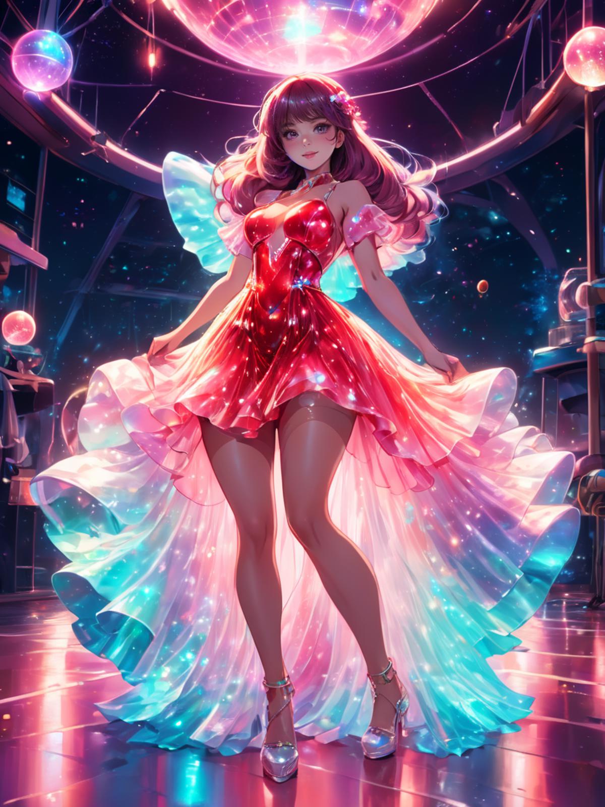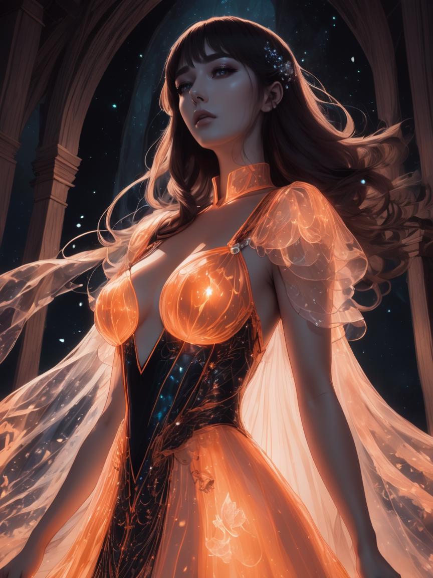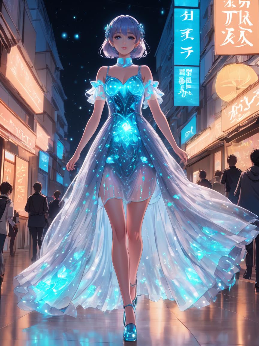This LoRA produces outfits with a bioluminescent glow and a scyphozoan appeal. Due to bioluminescence requiring a low-light environment this LoRA has a tendency to overfit toward dark backgrounds but lowering the weight and strengthening contrary tags can help.