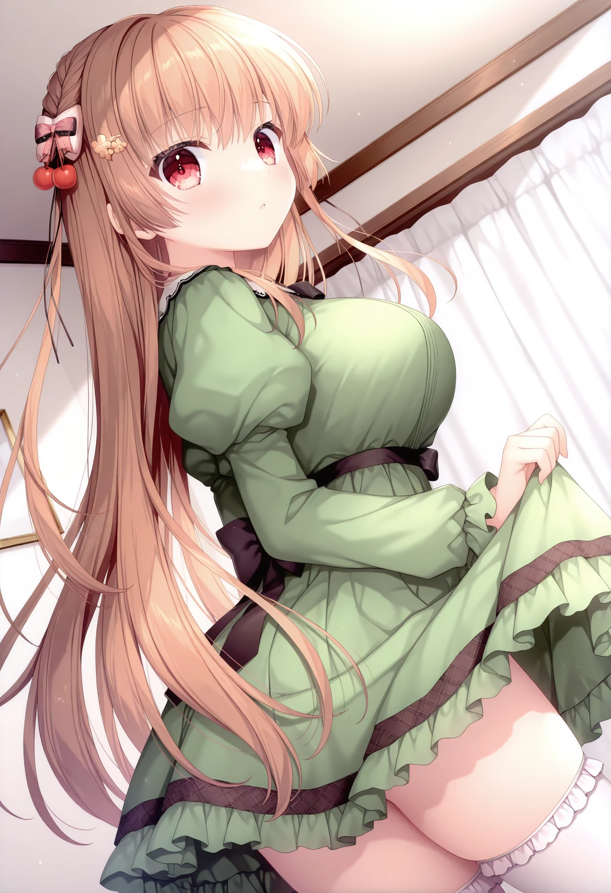 masterpiece, newest, absurdres, highres, 1girl, c-shirahane, very long hair, light brown hair, hair bow, cherry hair ornament, red eyes, dress shirt, red underbust, juliet sleeves, long sleeves, white frilled skirt, black bowtie, bow thighhighs, looking at viewer, indoors, dutch angle,Negative prompt ❌: