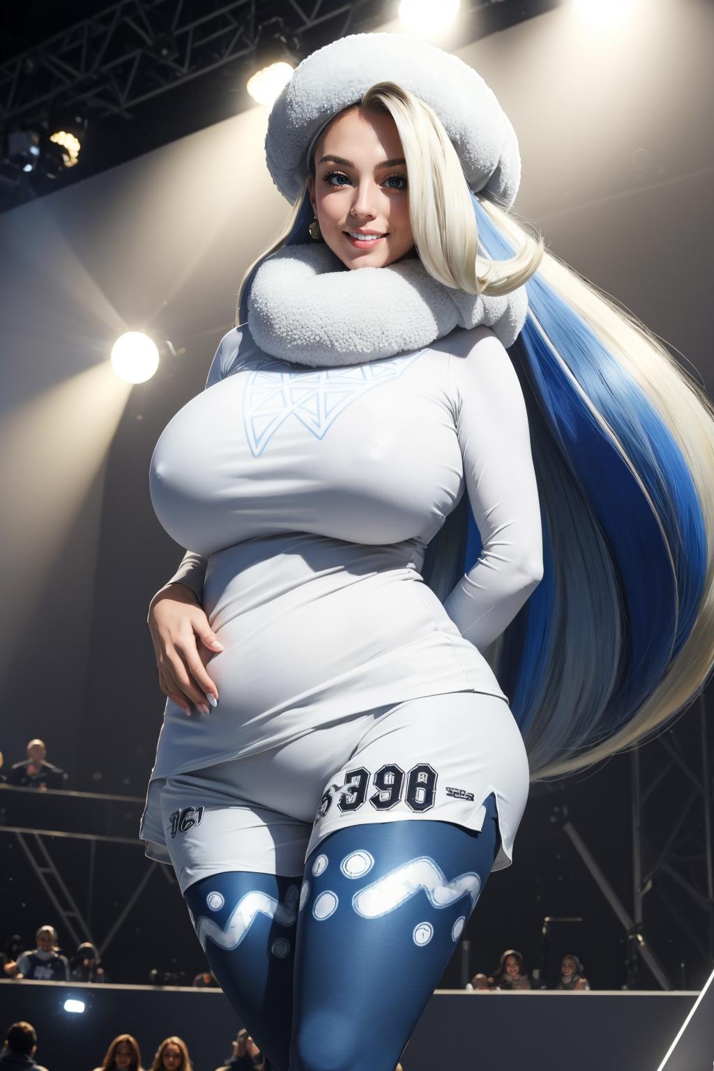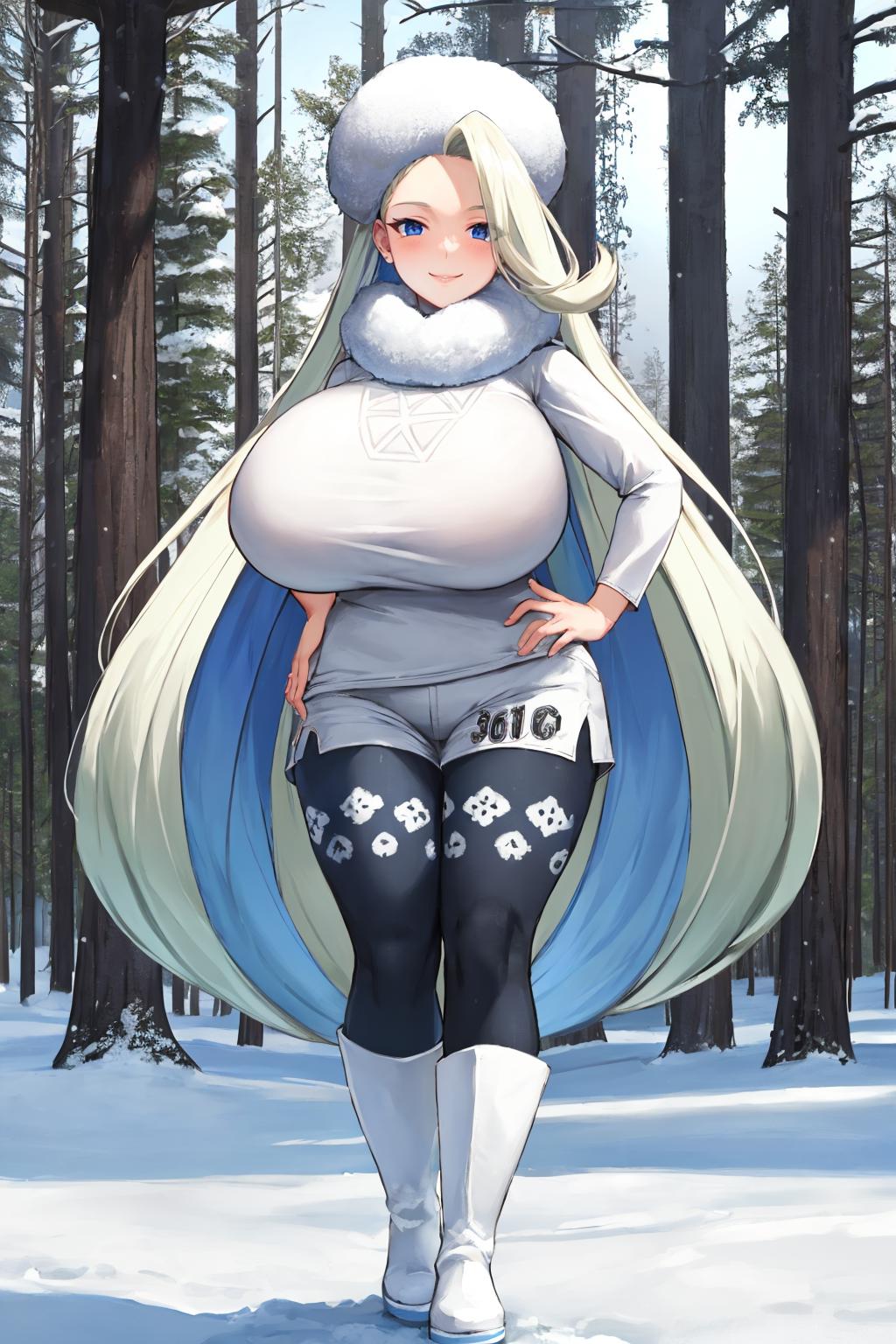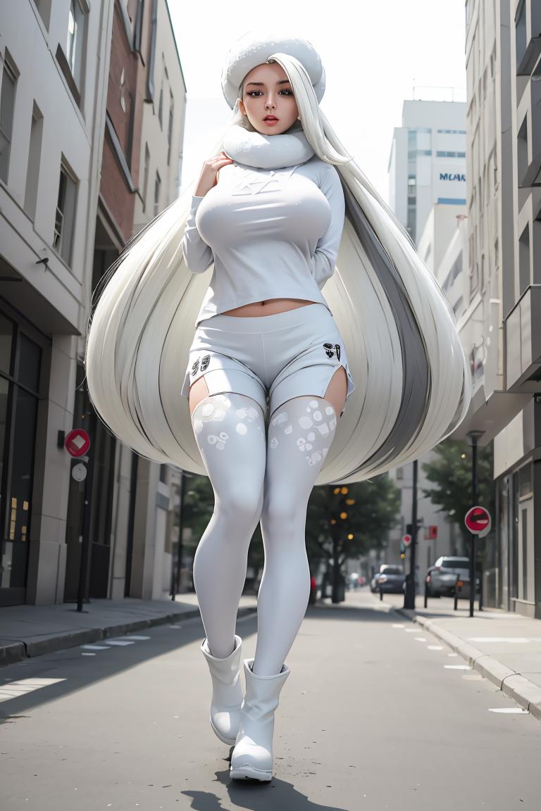 Add "fur hat, white scarf, white sweater, white shorts, leggings, white boots" for her typical look.