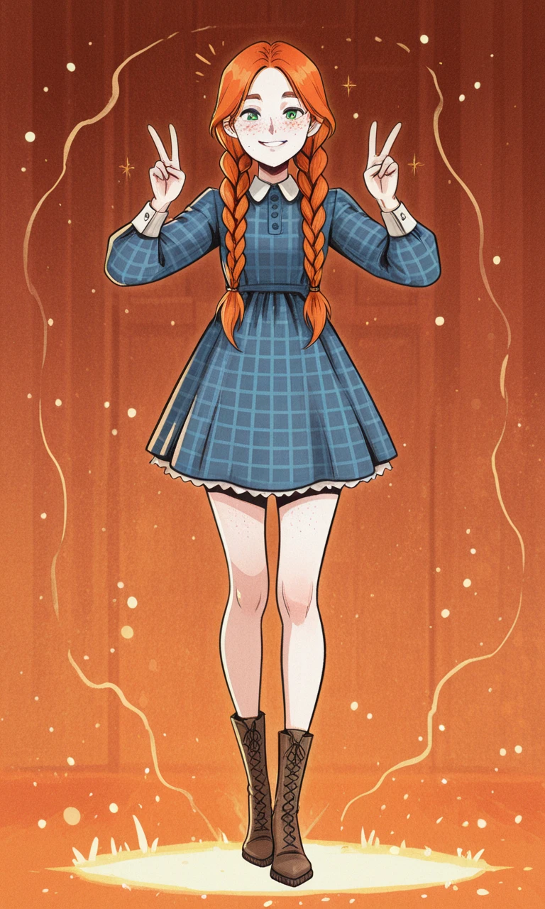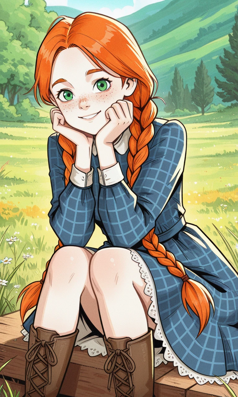 AnneSC, 1girl, orange hair, green eyes, freckles, twin braids