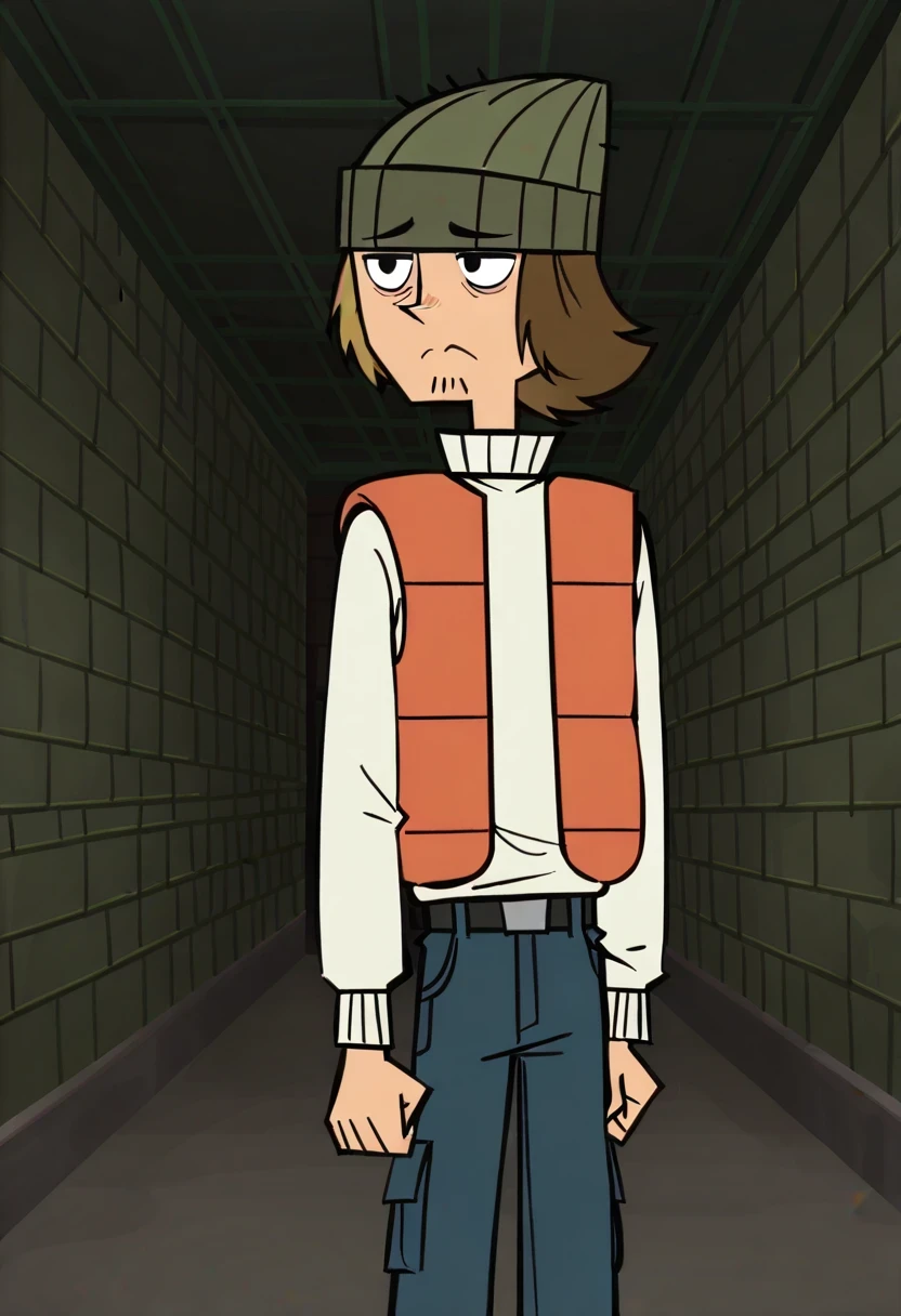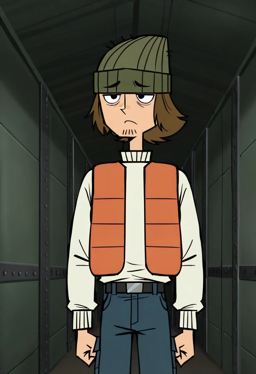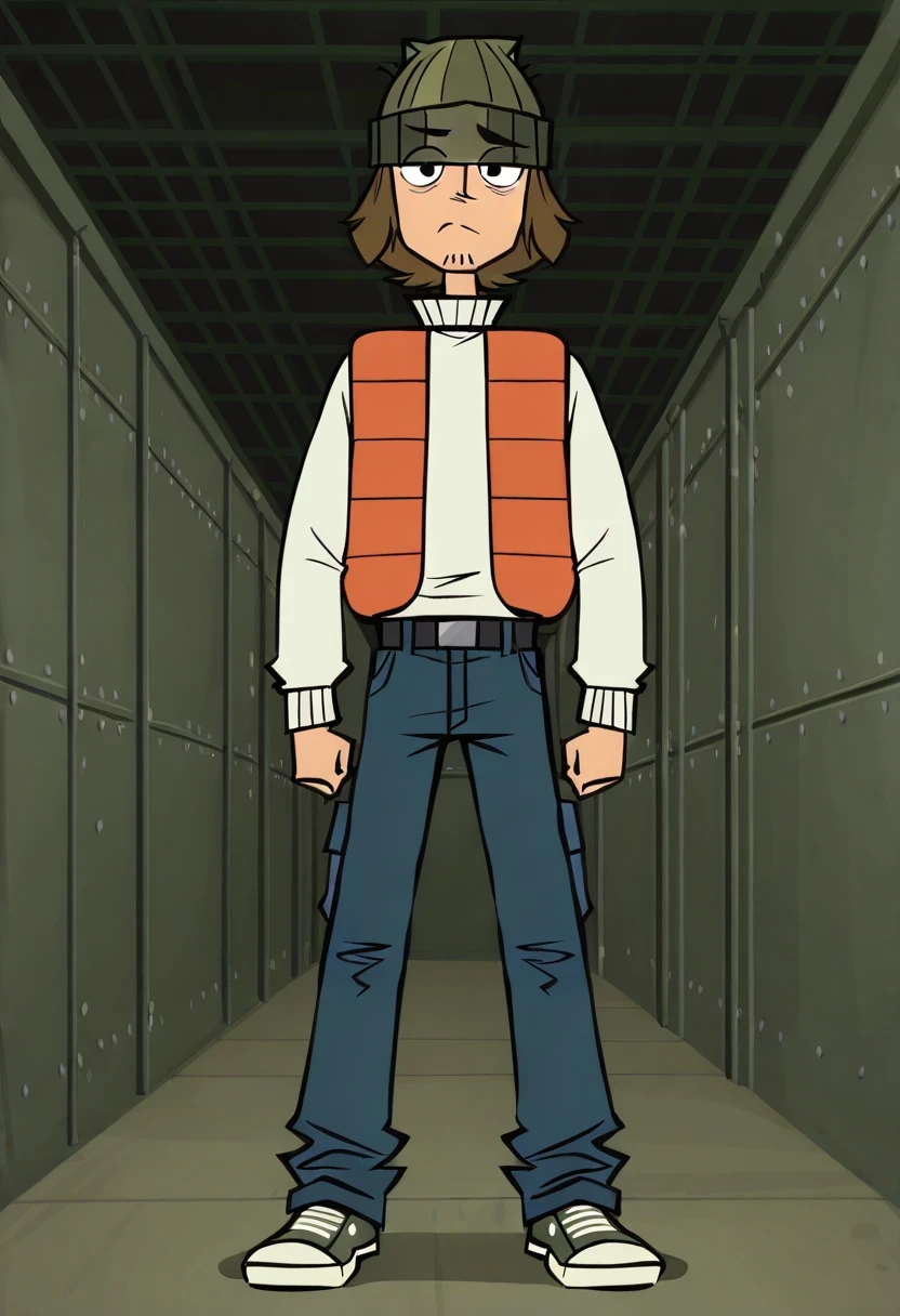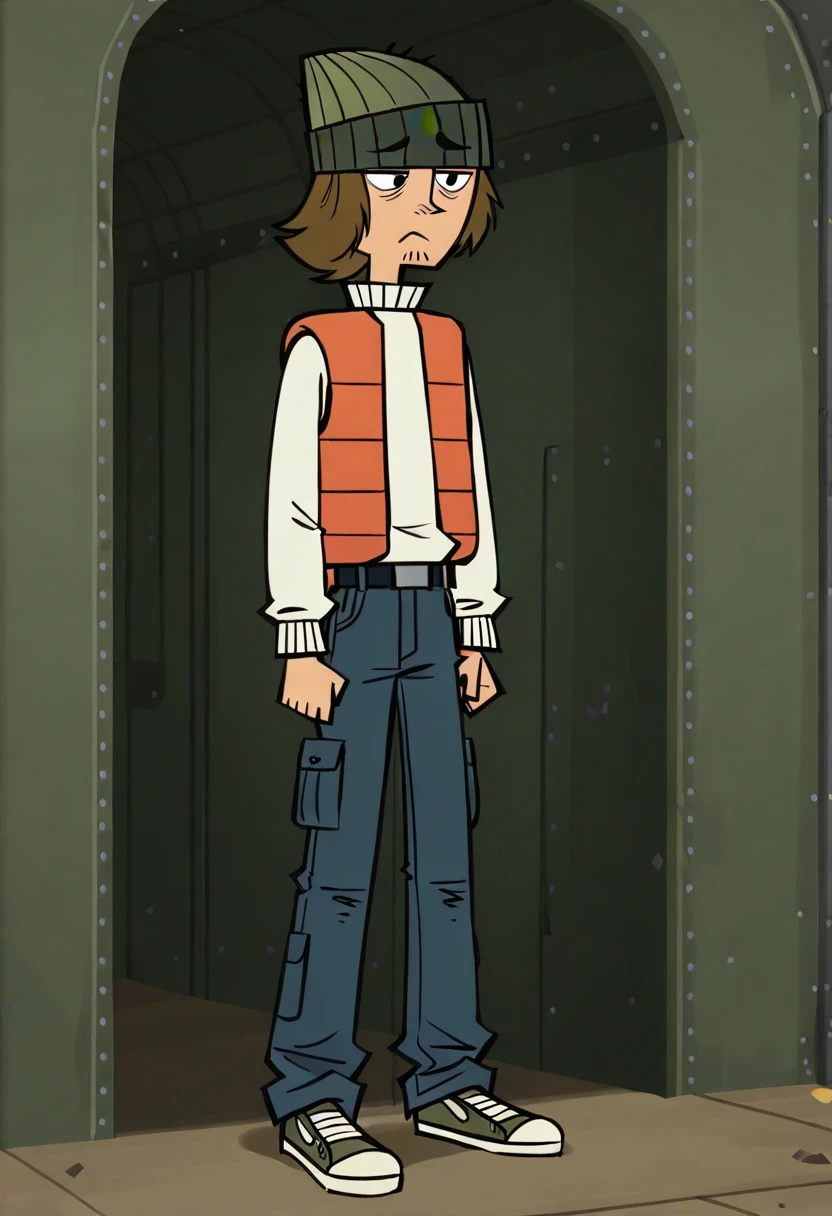 ShawnTDPI, 1boy, olive green beanie, brown hair, brown stubble, cream colored sweater, high collar, orange vest, blue cargo pants, black belt, dark green-beige sneakers, black eyes,