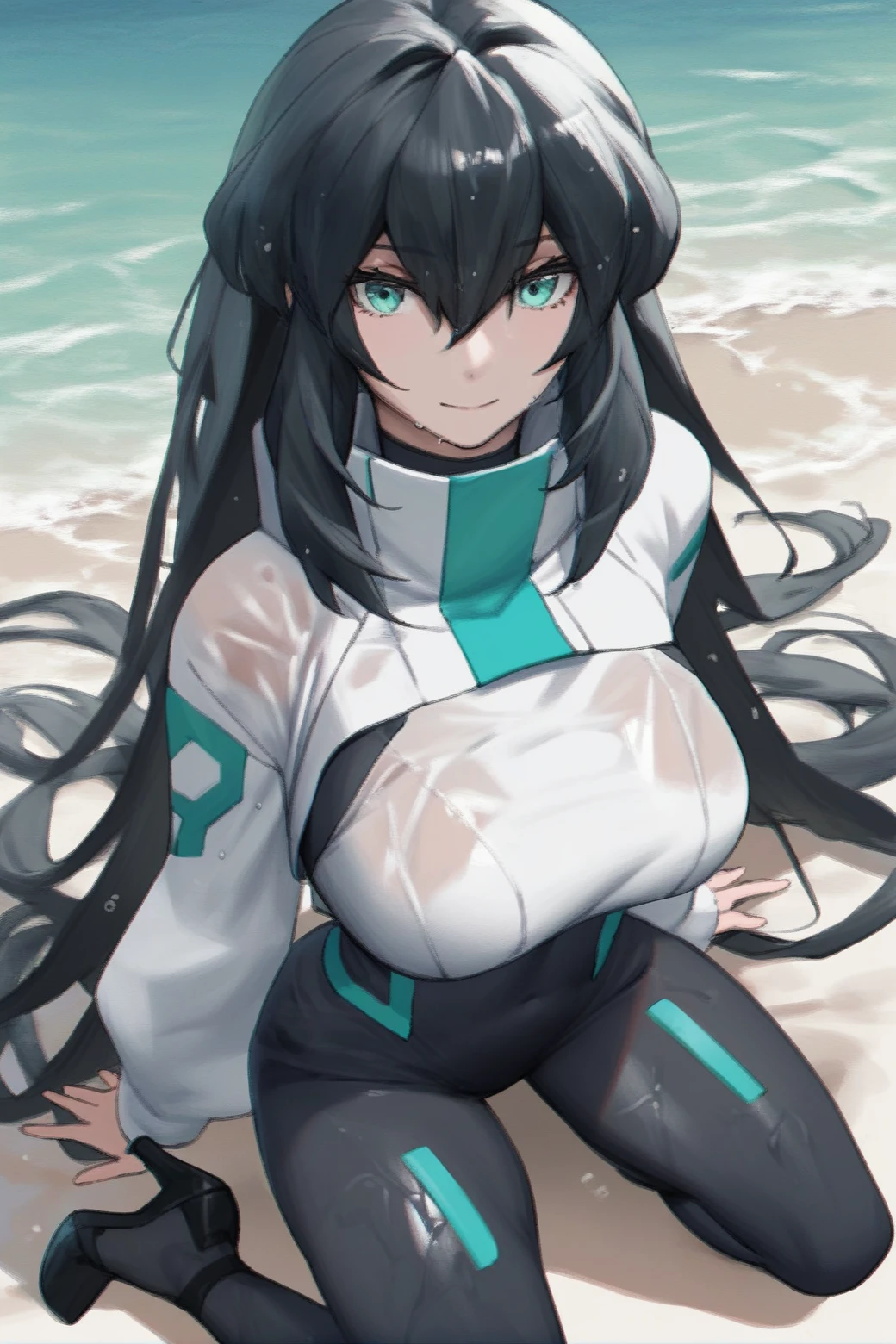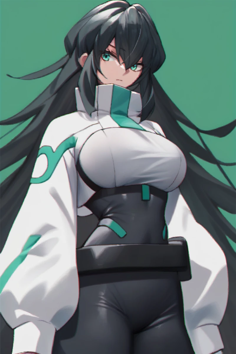 gbd_may, 1girl, aqua eyes, long hair, black hair, very long hair, bangs, large breasts, green eyes, shrug (clothing), white breast black bodysuit