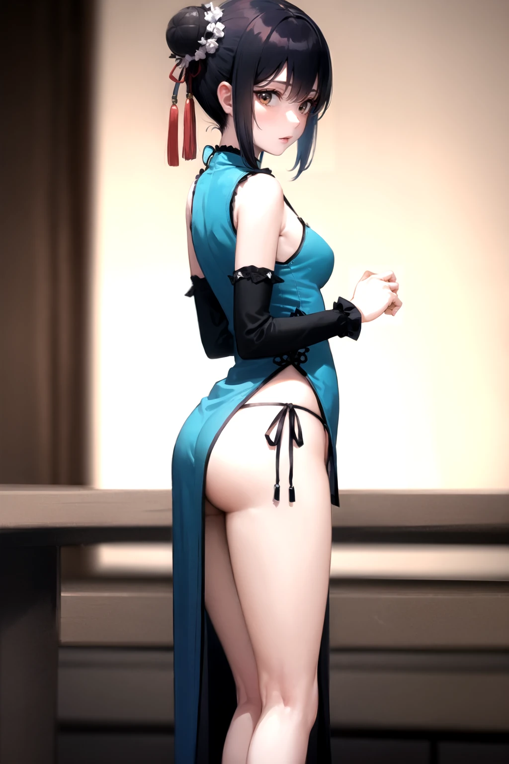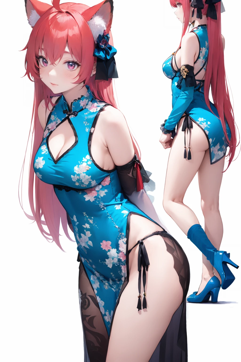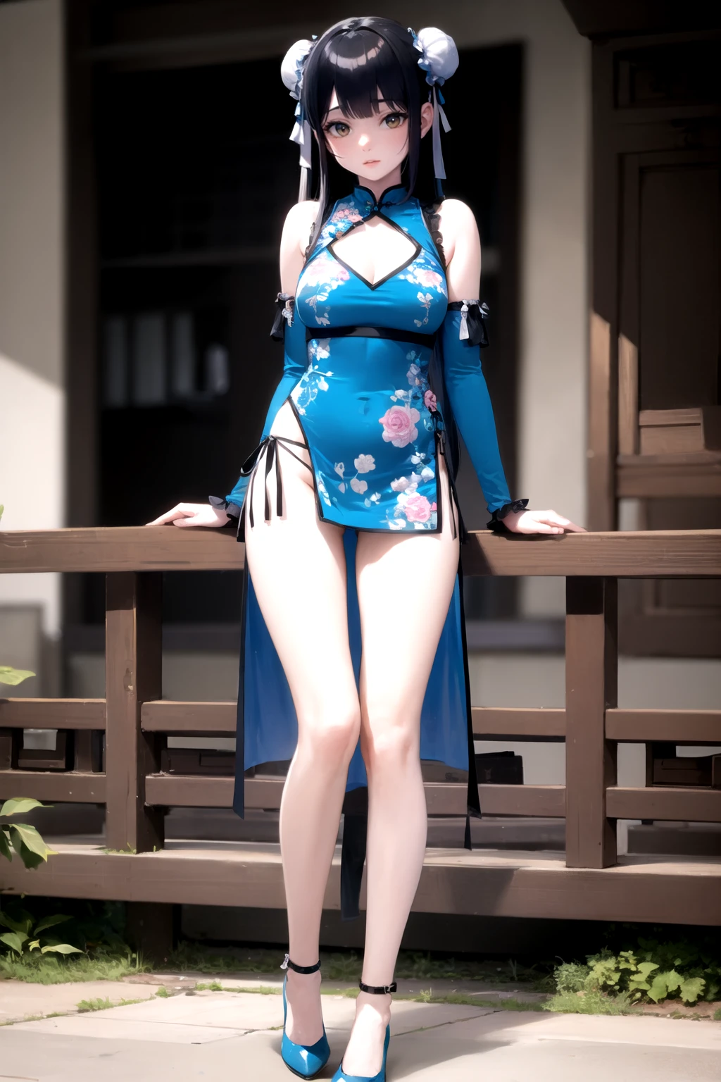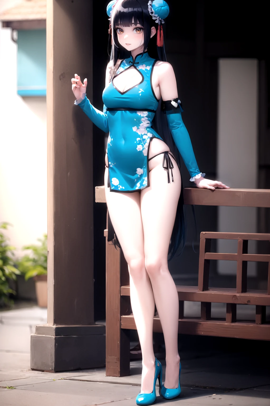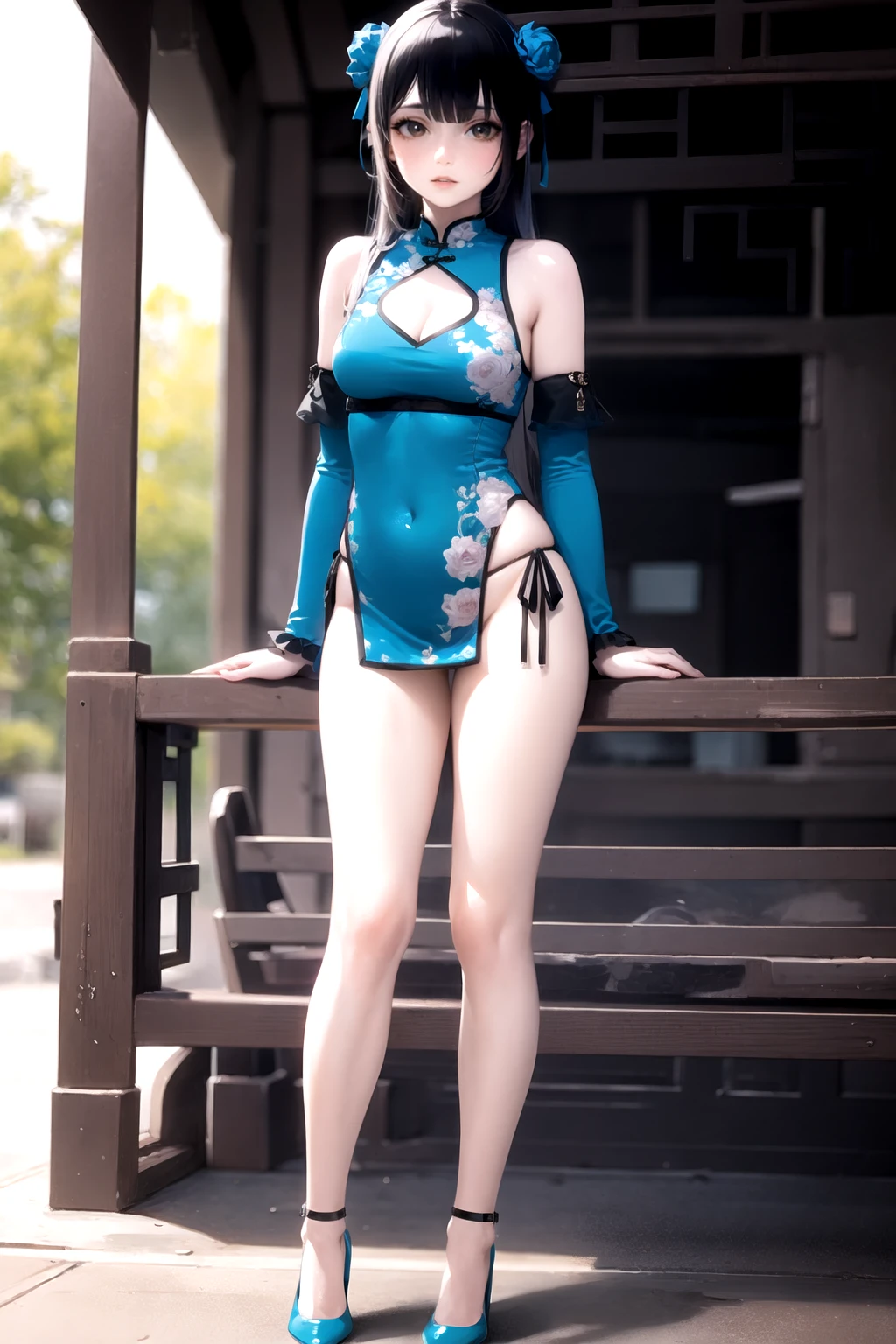 • 触发词(Trigger word):1girl,solo,high heels,dress,chinese clothes,china dress,detached sleeves,blue footwear,blue dress,cleavage cutout,single thighhigh,side - tie panties,