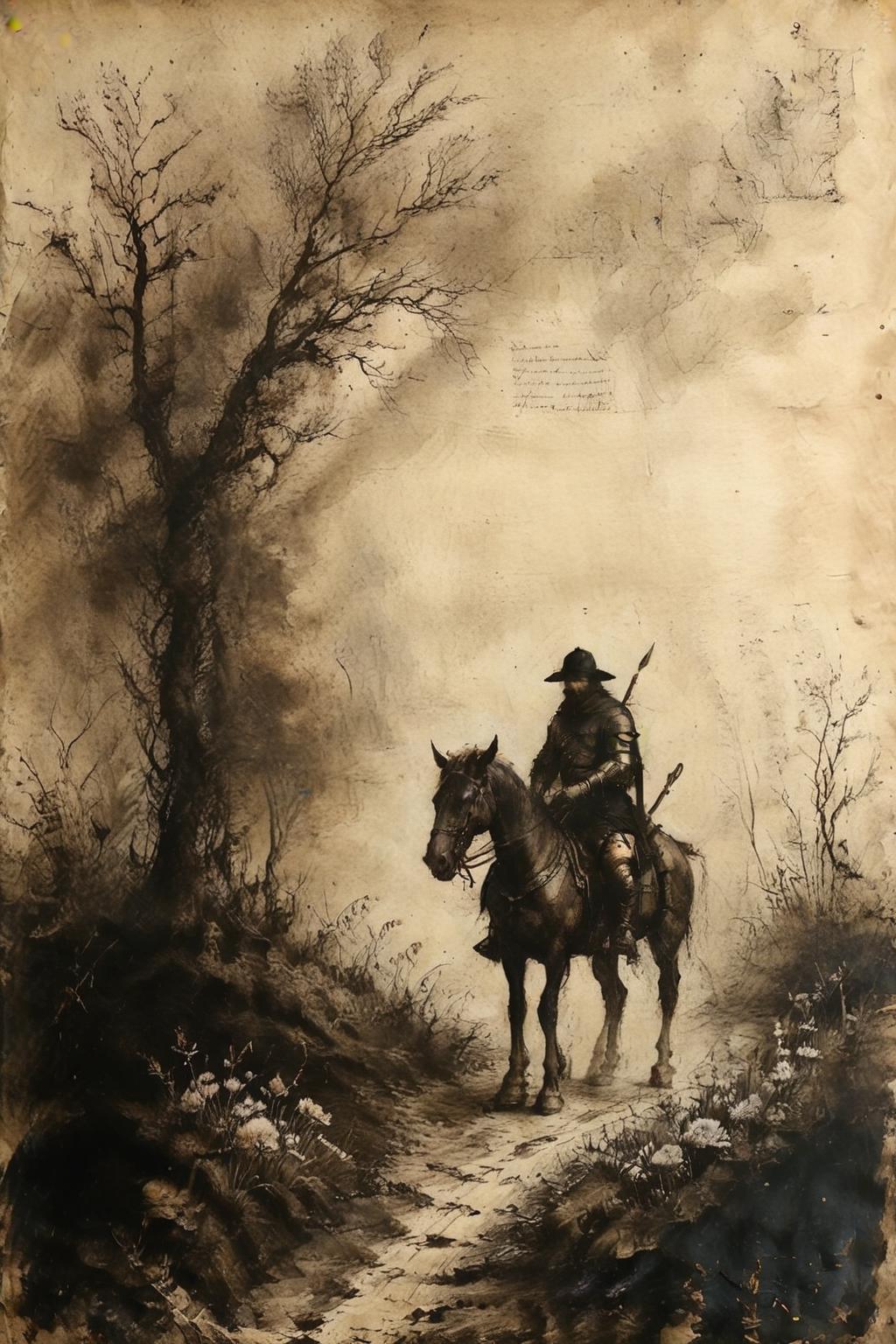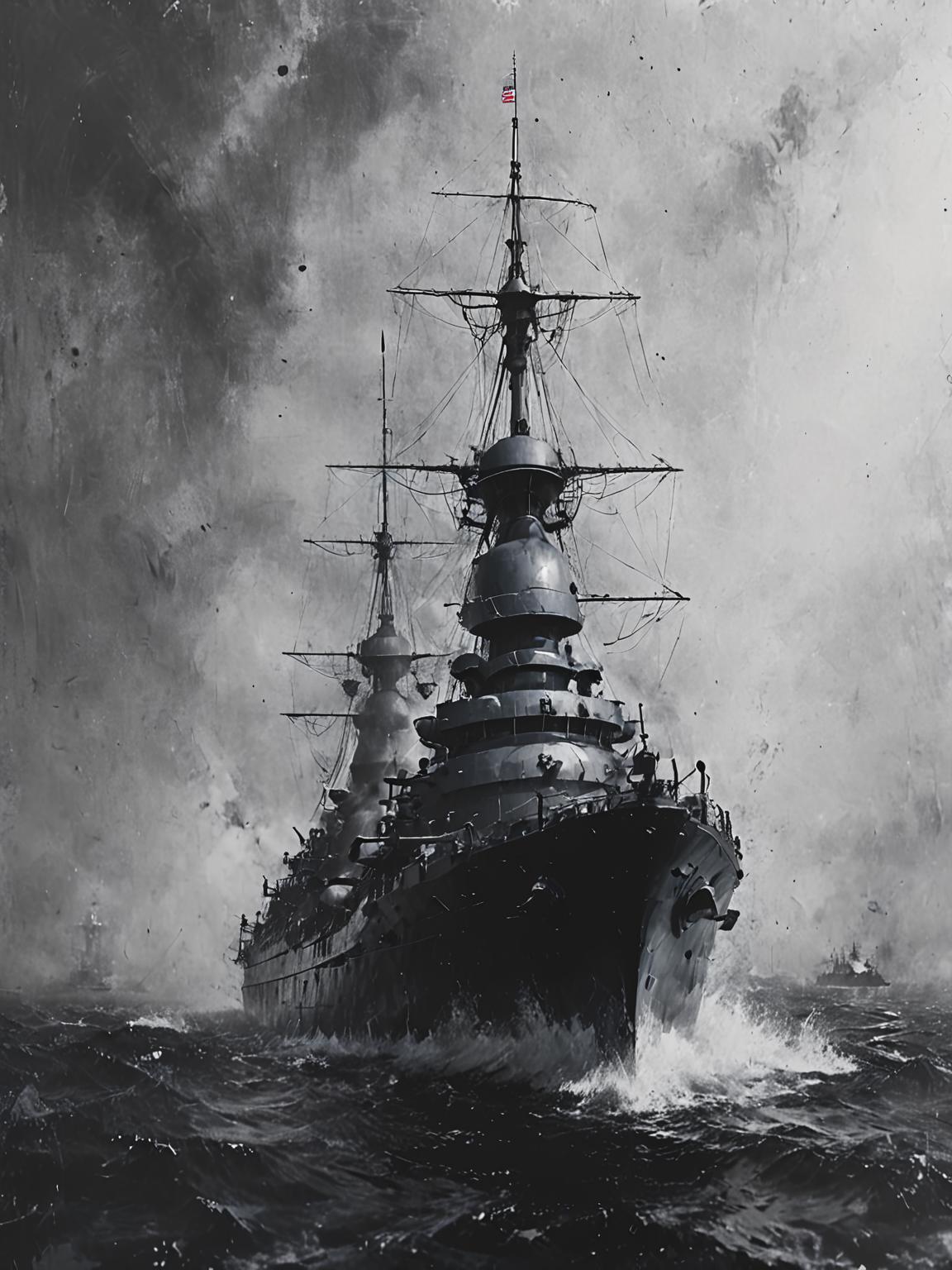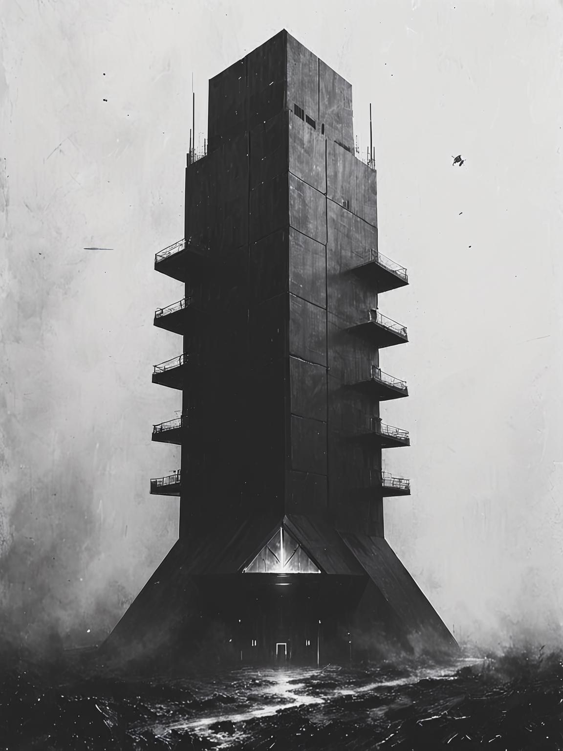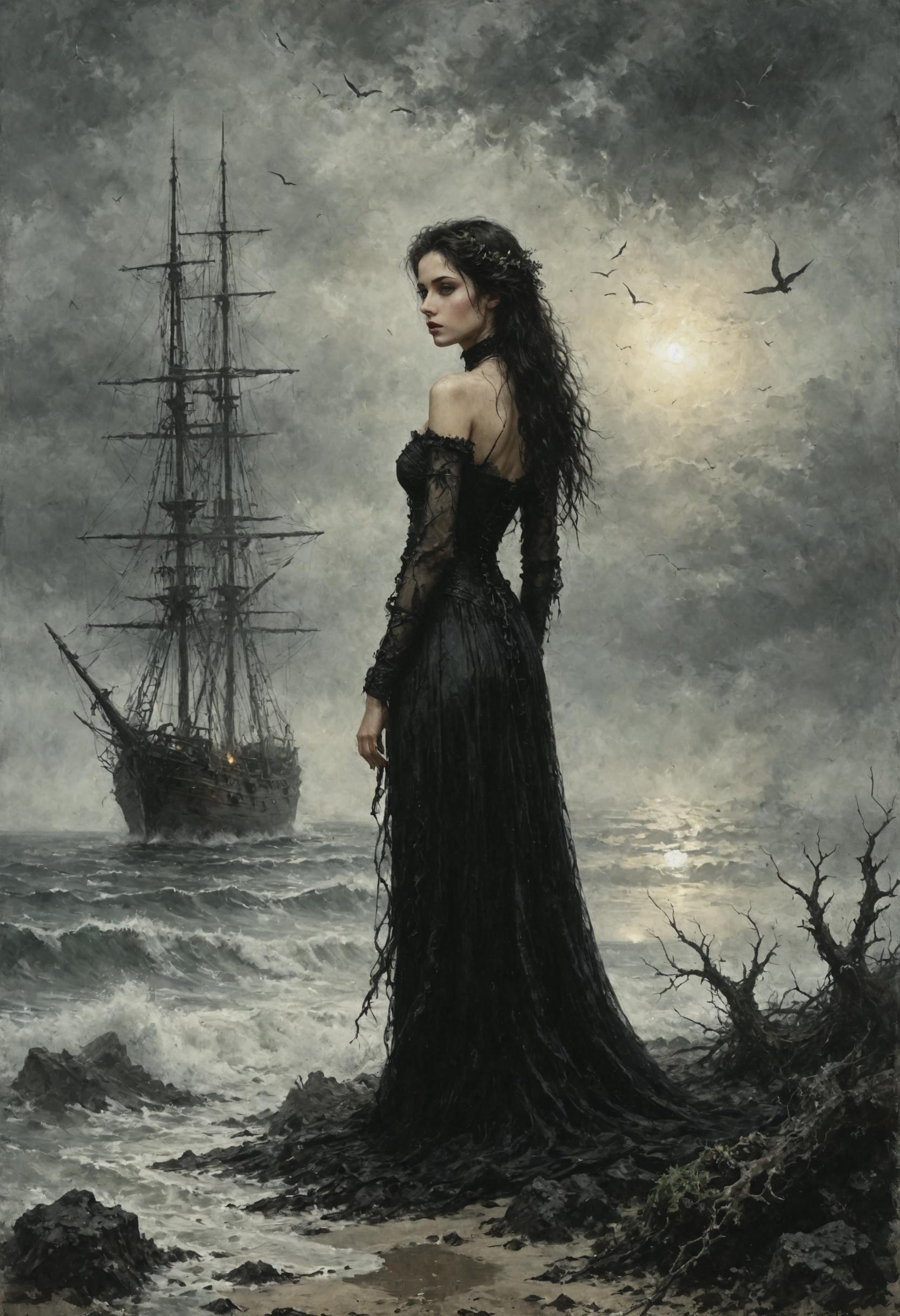 The style is monochromatic, predominantly using shades of black, white, and gray to create a high-contrast, atmospheric scene. This style is often associated with a moody and mysterious ambiance, emphasizing silhouettes and the interplay between light and shadow. Textures may appear to be accentuated, and the lack of color can focus the viewer's attention on composition, form, and the emotional content of the image. The style might draw on chiaroscuro techniques, where the stark contrasts between light and dark give a dramatic and sometimes theatrical effect. It is reminiscent of noir art styles, which are known for their dark, gritty, and cinematic qualities.