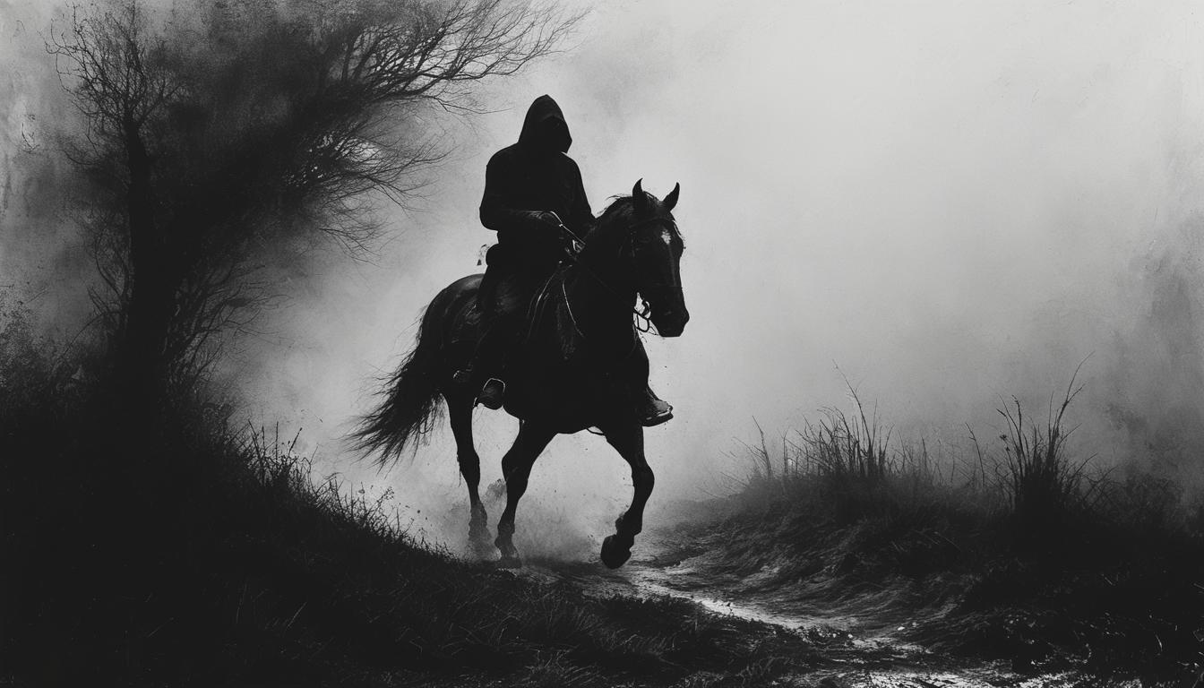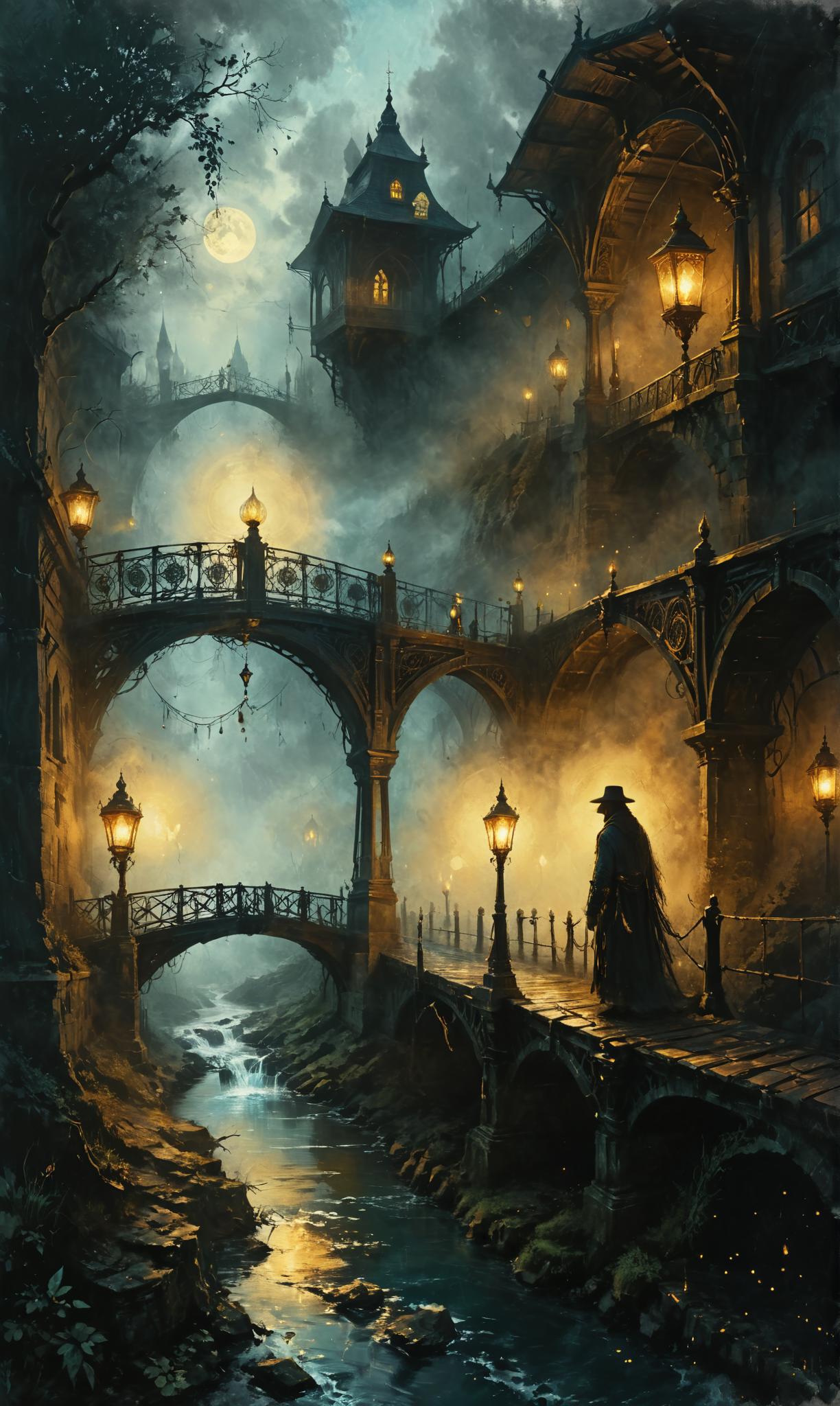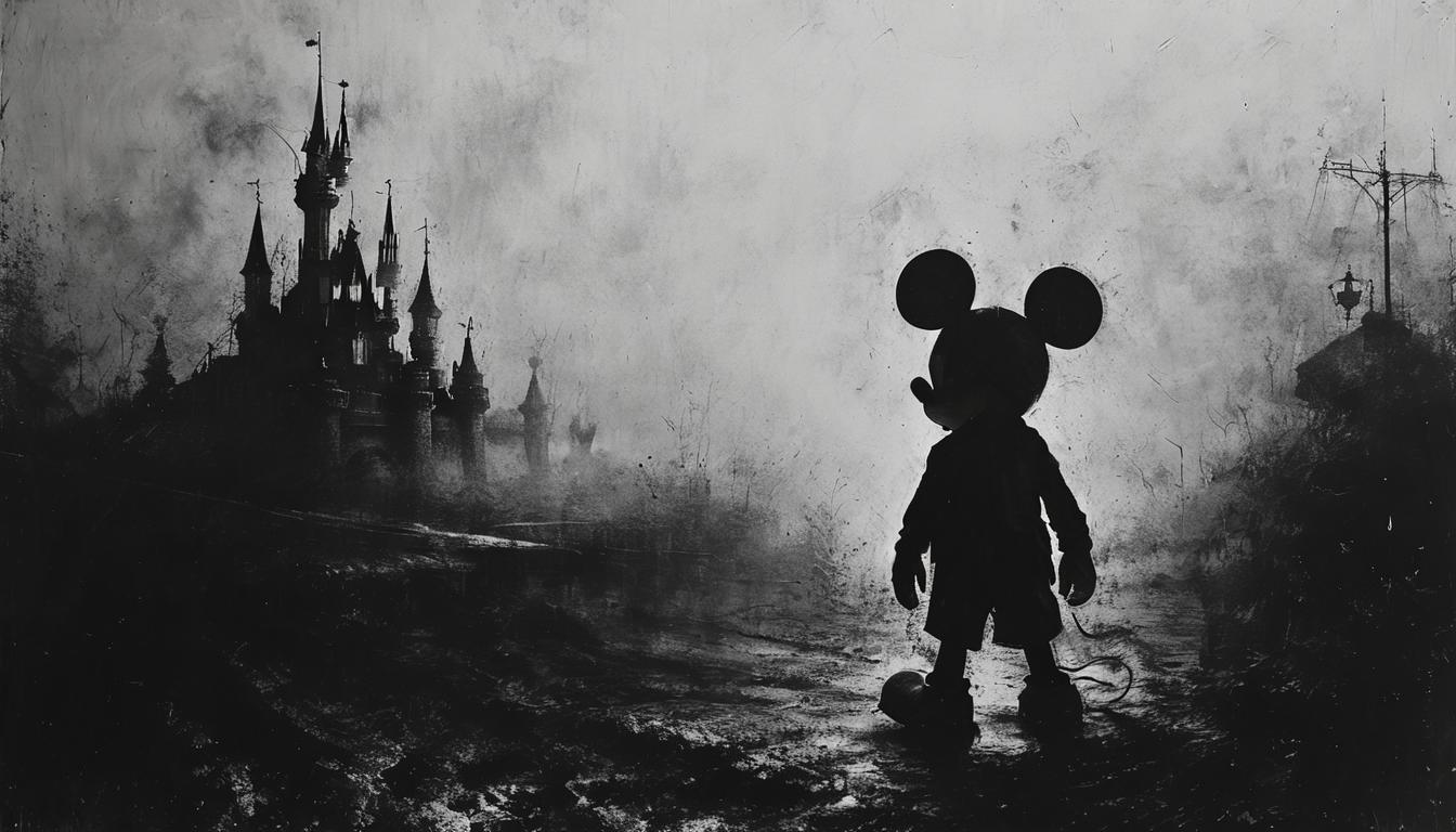 The style is monochromatic, predominantly using shades of black, white, and gray to create a high-contrast, atmospheric scene. This style is often associated with a moody and mysterious ambiance, emphasizing silhouettes and the interplay between light and shadow. Textures may appear to be accentuated, and the lack of color can focus the viewer's attention on composition, form, and the emotional content of the image. The style might draw on chiaroscuro techniques, where the stark contrasts between light and dark give a dramatic and sometimes theatrical effect. It is reminiscent of noir art styles, which are known for their dark, gritty, and cinematic qualities.