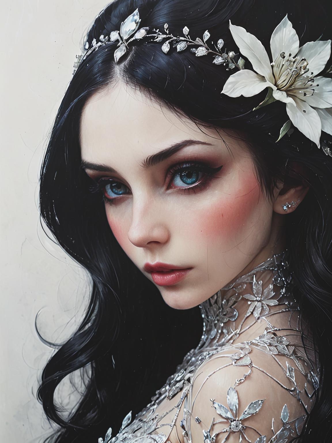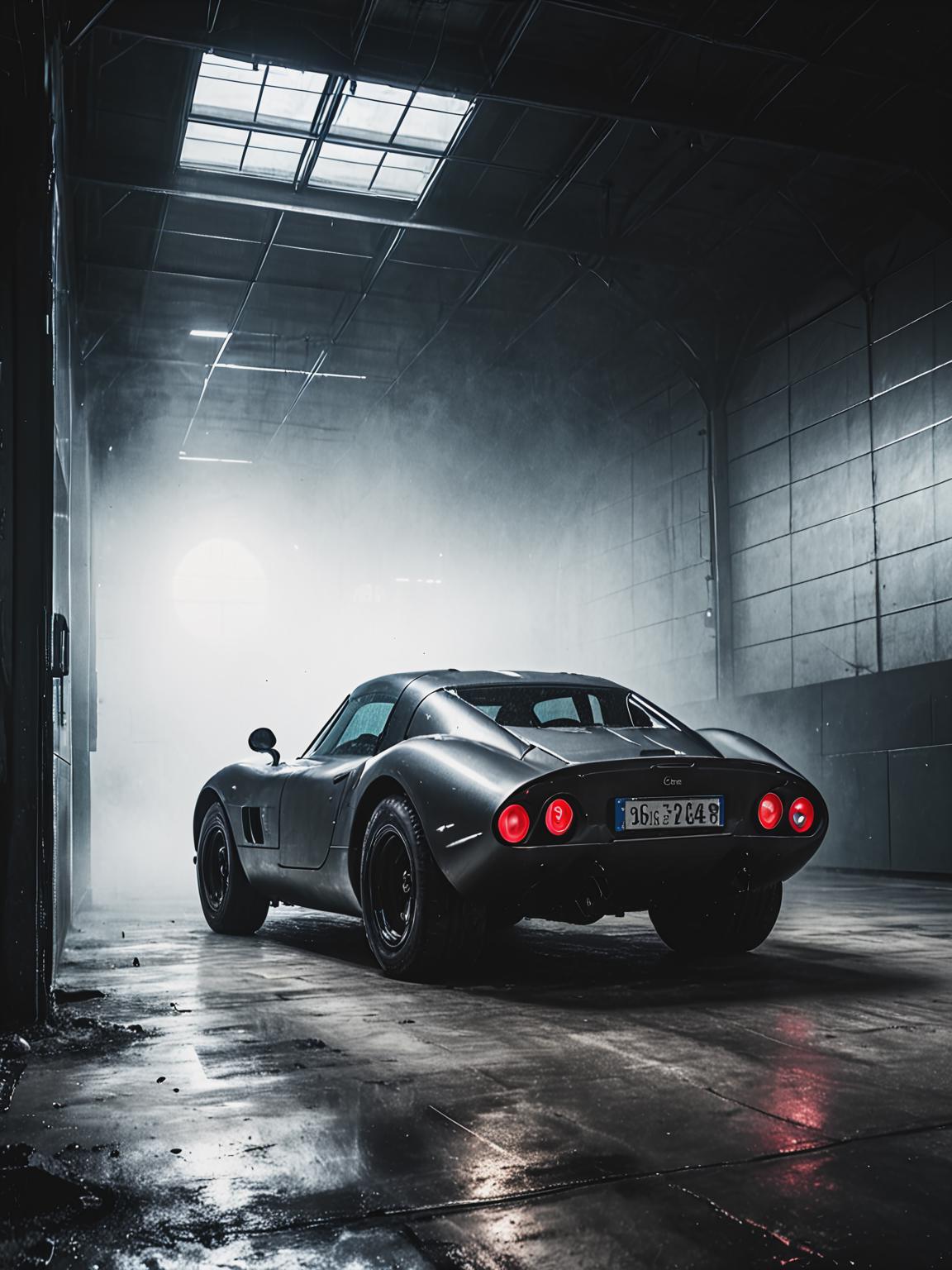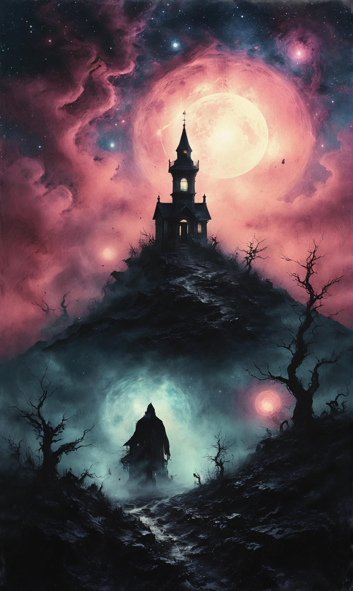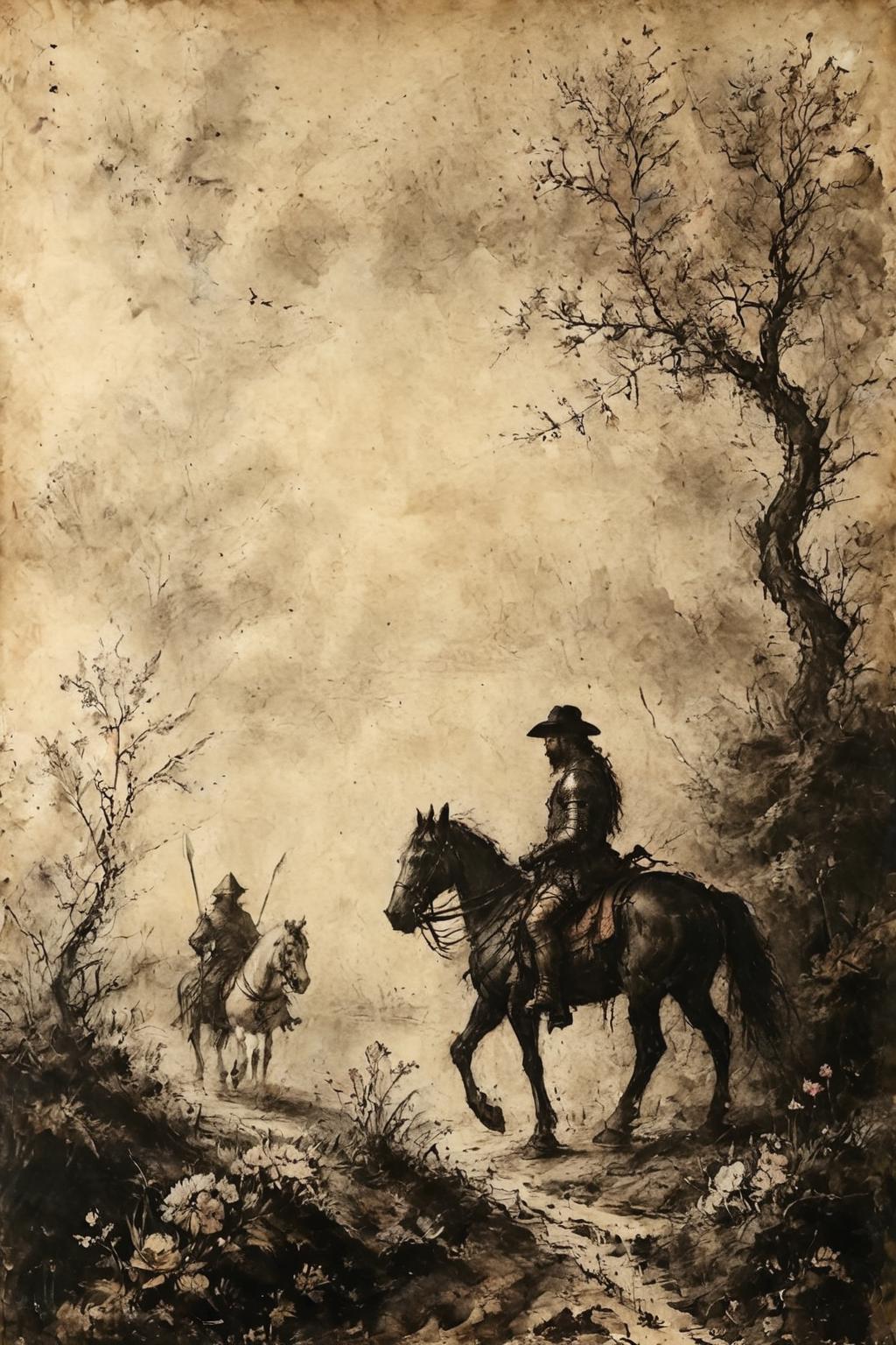 The style is monochromatic, predominantly using shades of black, white, and gray to create a high-contrast, atmospheric scene. This style is often associated with a moody and mysterious ambiance, emphasizing silhouettes and the interplay between light and shadow. Textures may appear to be accentuated, and the lack of color can focus the viewer's attention on composition, form, and the emotional content of the image. The style might draw on chiaroscuro techniques, where the stark contrasts between light and dark give a dramatic and sometimes theatrical effect. It is reminiscent of noir art styles, which are known for their dark, gritty, and cinematic qualities.