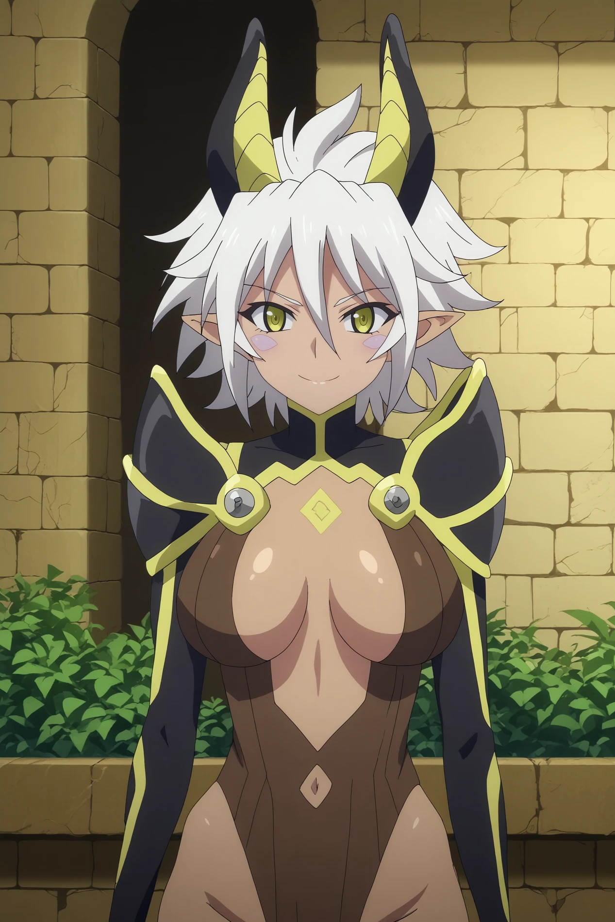 Triggers : zest,1girl,solo,pointy ears,horns,facial mark,short hair,dark-skinned female,dark skin,large breasts
