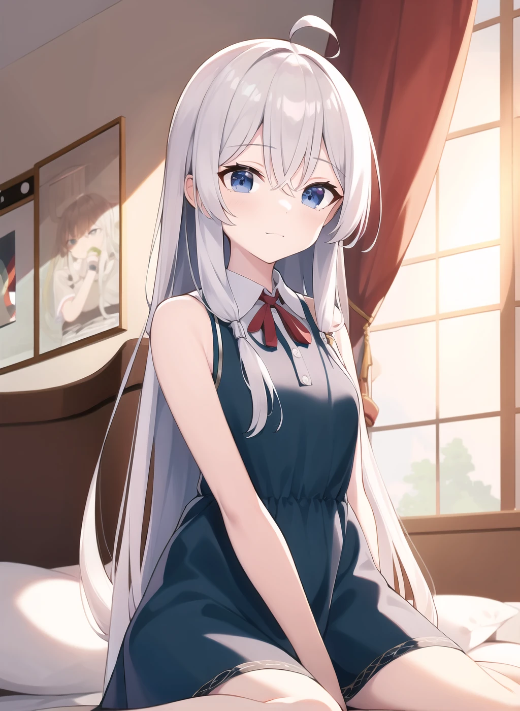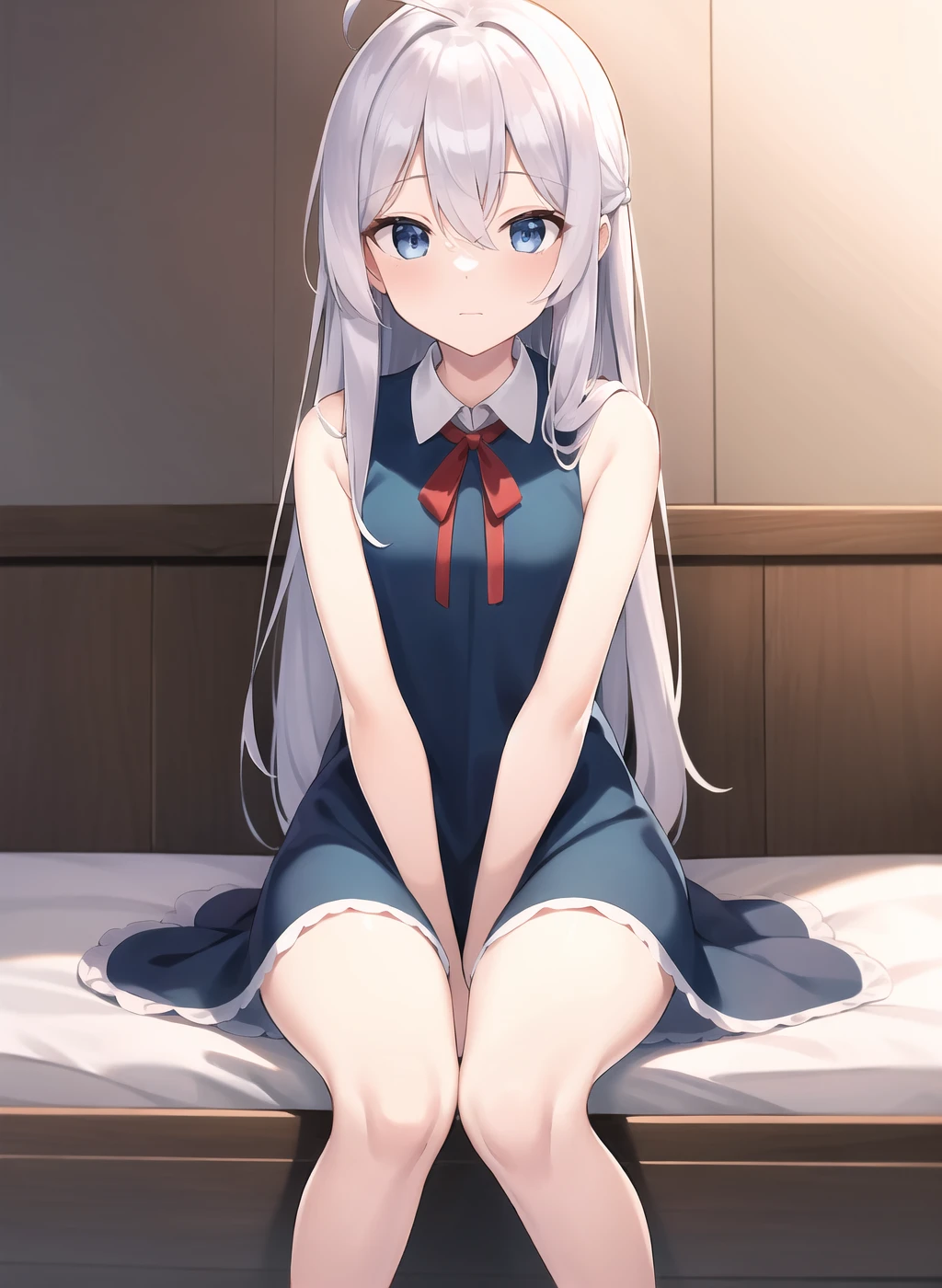 elaina, 1girl, long hair, blue eyes, dress, holding, hair between eyes, sitting, closed mouth, ahoge, white hair, sleeveless, red ribbon, neck ribbon, sleeveless dress, blue dress,