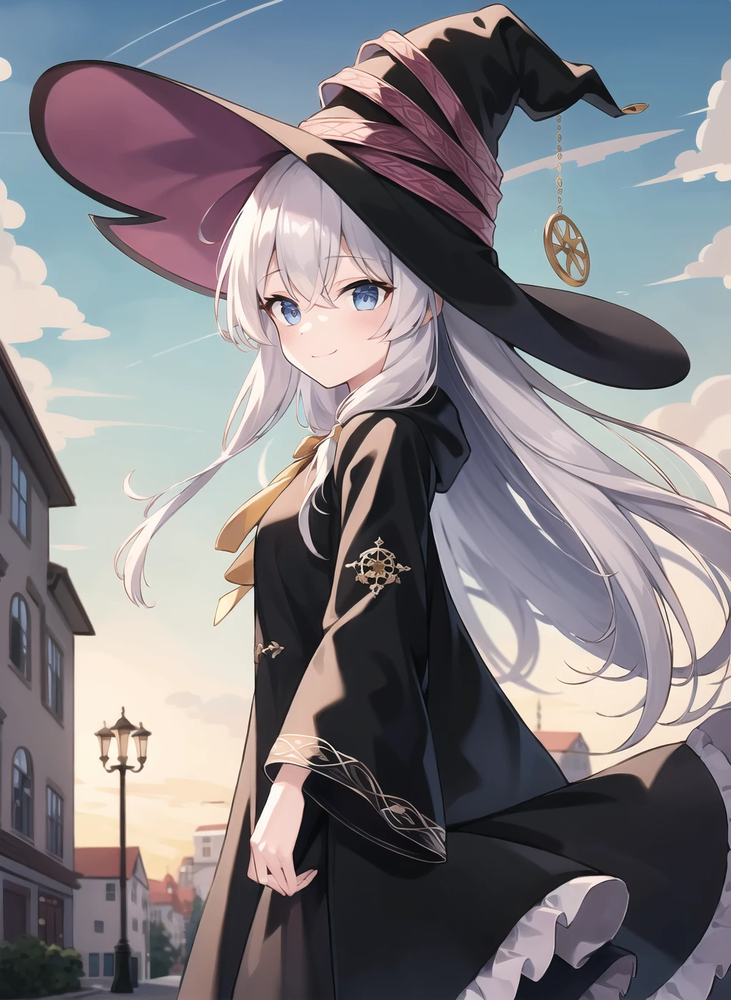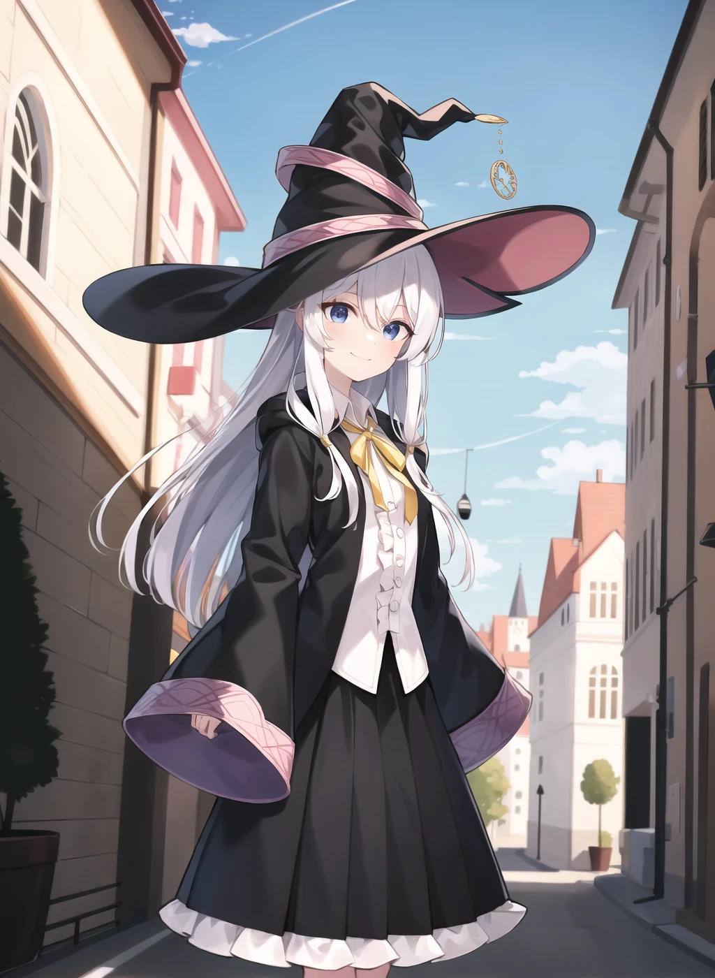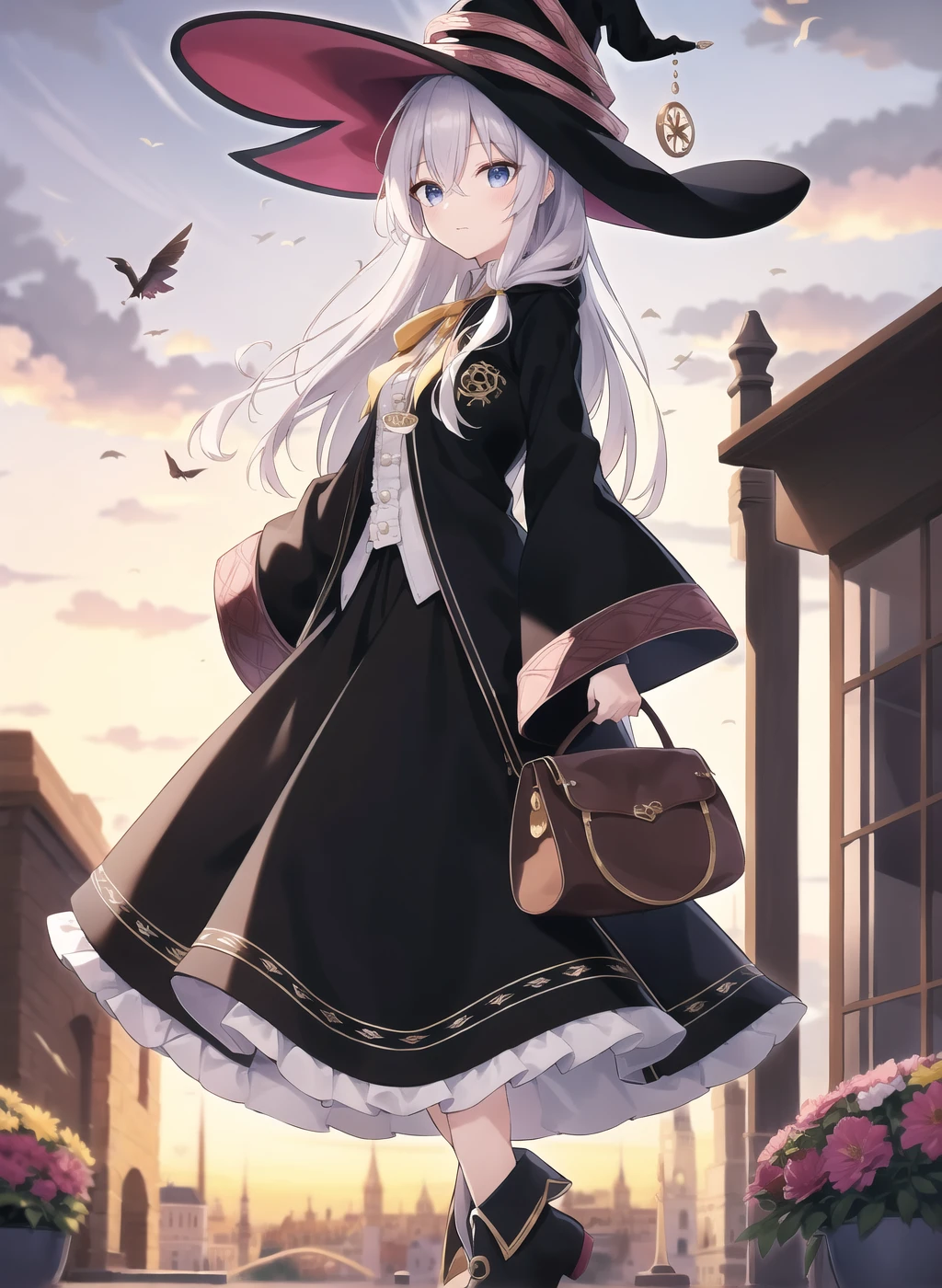 elaina, 1girl, solo, long hair, blue eyes, skirt, shirt, long sleeves, hat, bow, ribbon, hair between eyes, white shirt, white hair, boots, frills, wide sleeves, black skirt, bag, black footwear, black headwear, witch hat, frilled skirt, robe, yellow ribbon, witch, brown bag, black robe, open robe, pointy footwear
