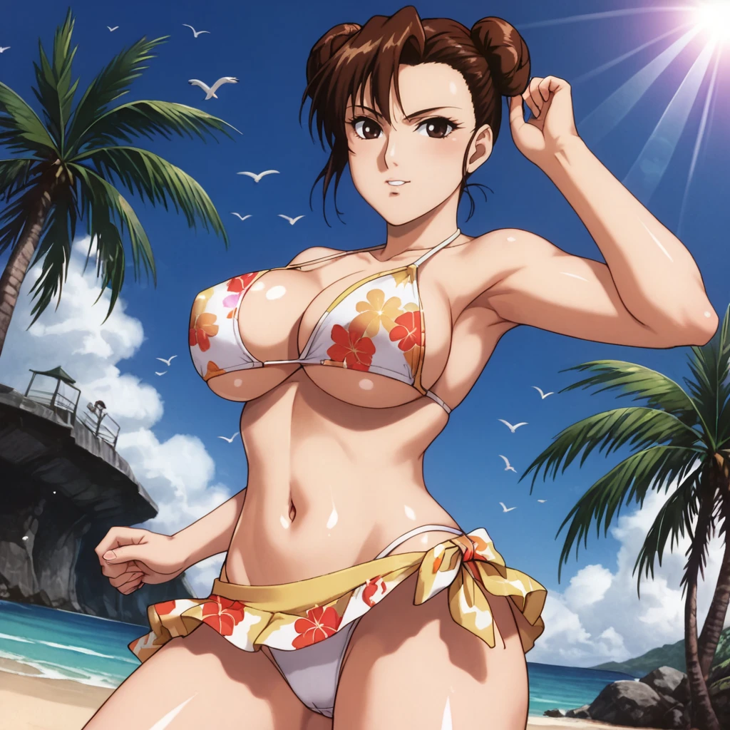 ChunLiMovieTowel, 1girl, towel on head, black hair, mature female, retro artstyle, large breasts, 1990s (style), brown eyes, cowboy shot