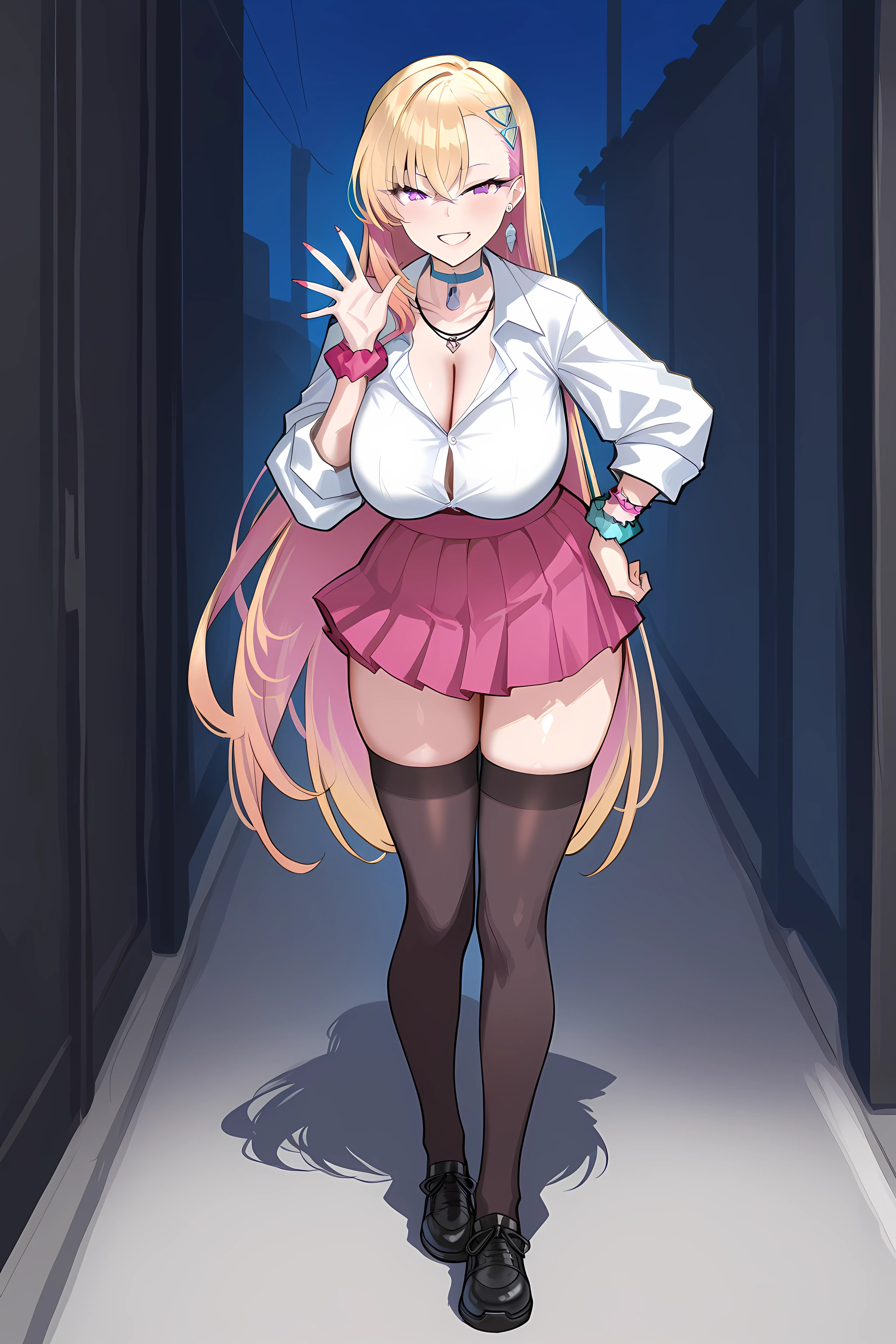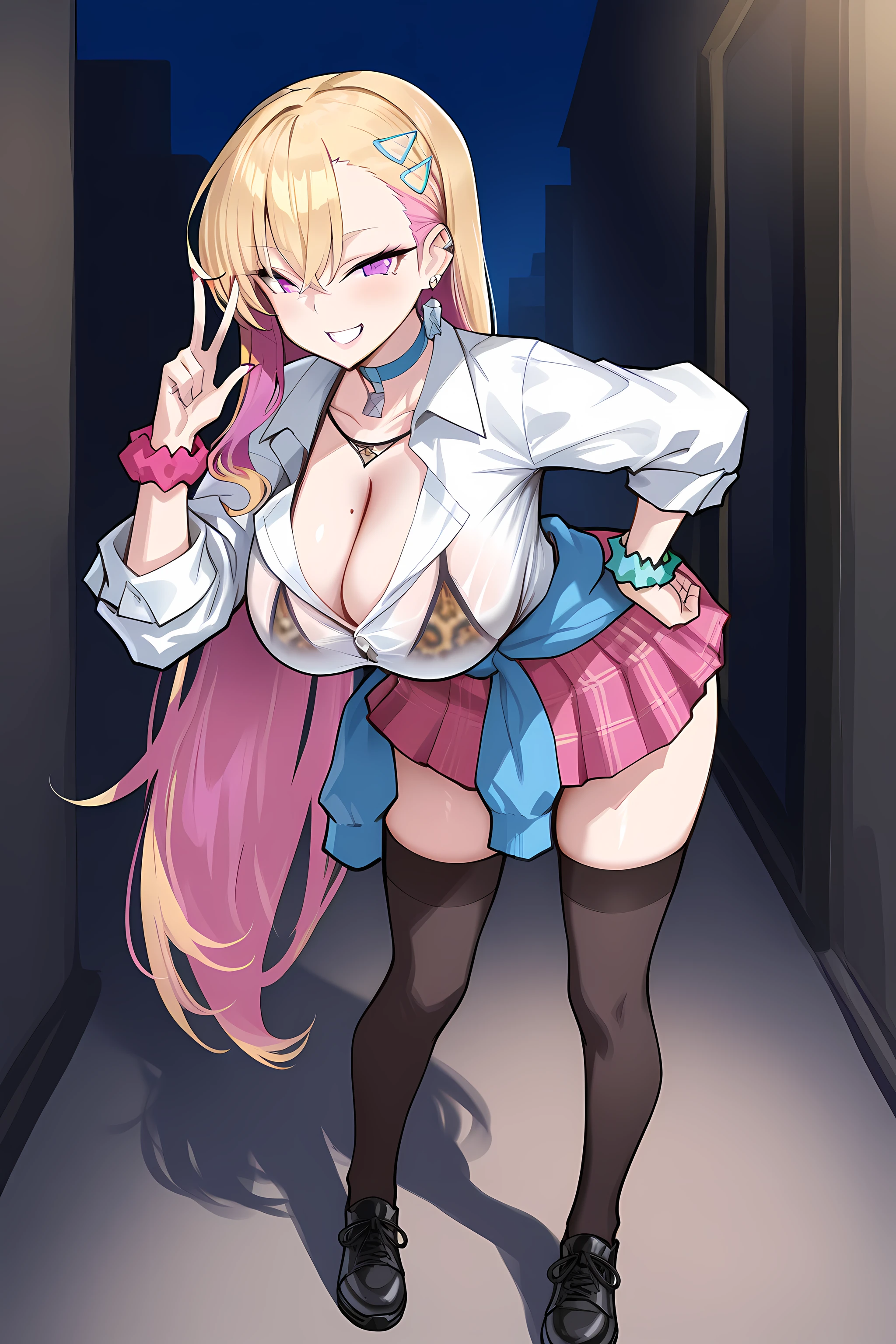 altoutfit, gyaru, pink pleated skirt, black thighhighs, kogal, very long hair, cleavage, see through, leopard print underwear, earrings, clothes around waist, wrist scrunchie, choker, white collared shirt, black shoes