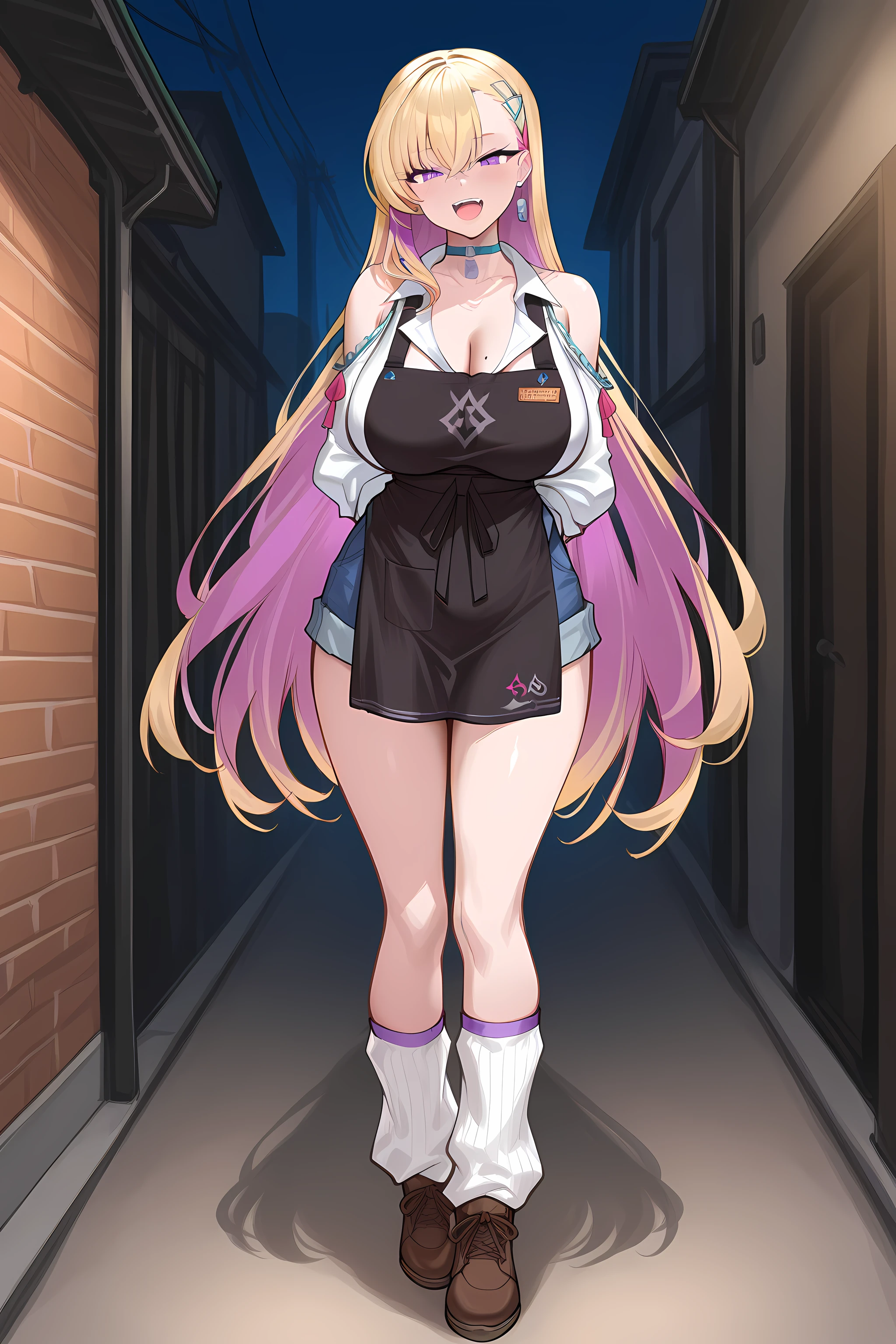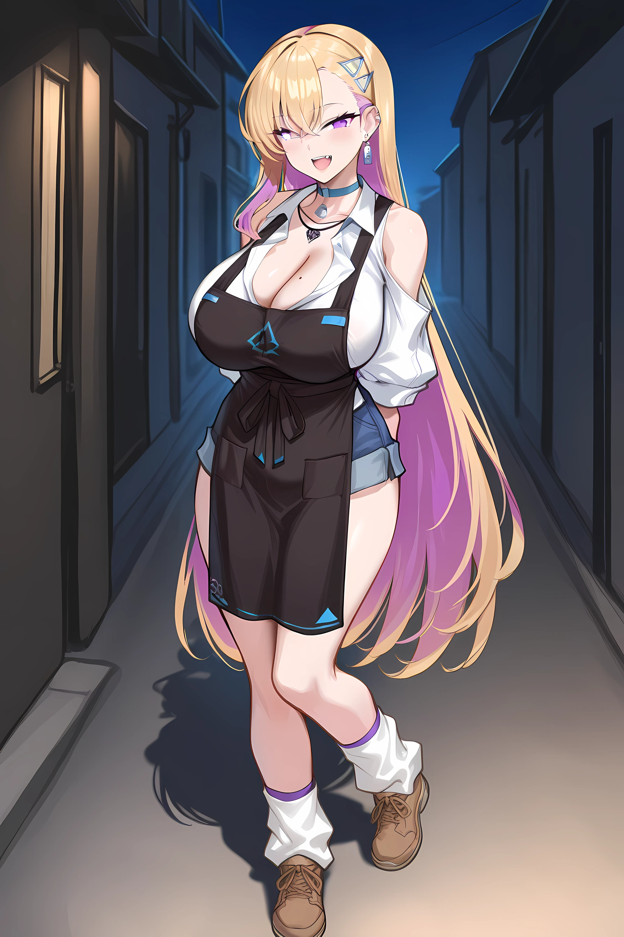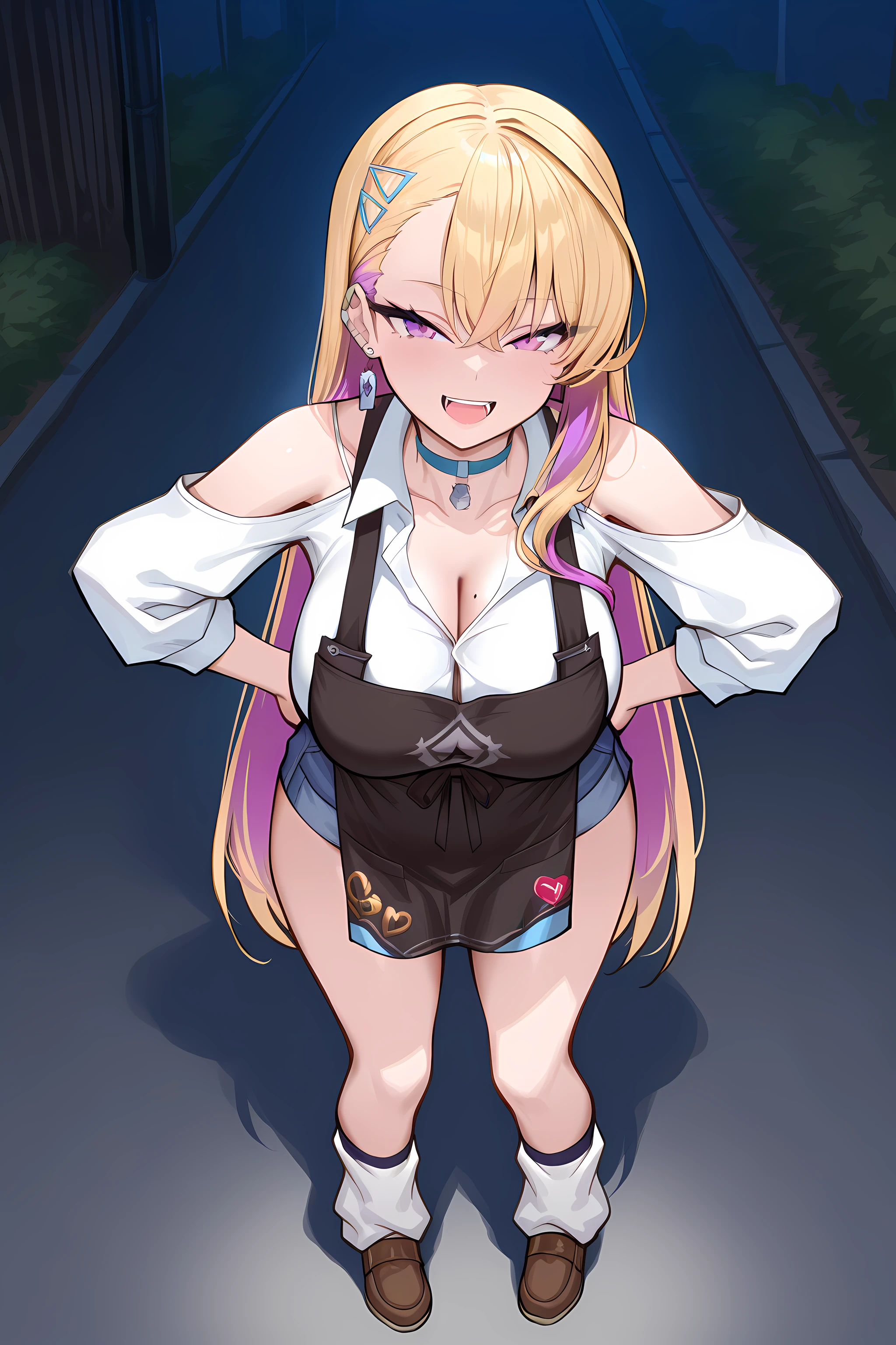 baseoutfit, choker, kogal, black apron, short blue pants, thighs, loose socks, brown footwear, collar, white shirt, shoulder cutout