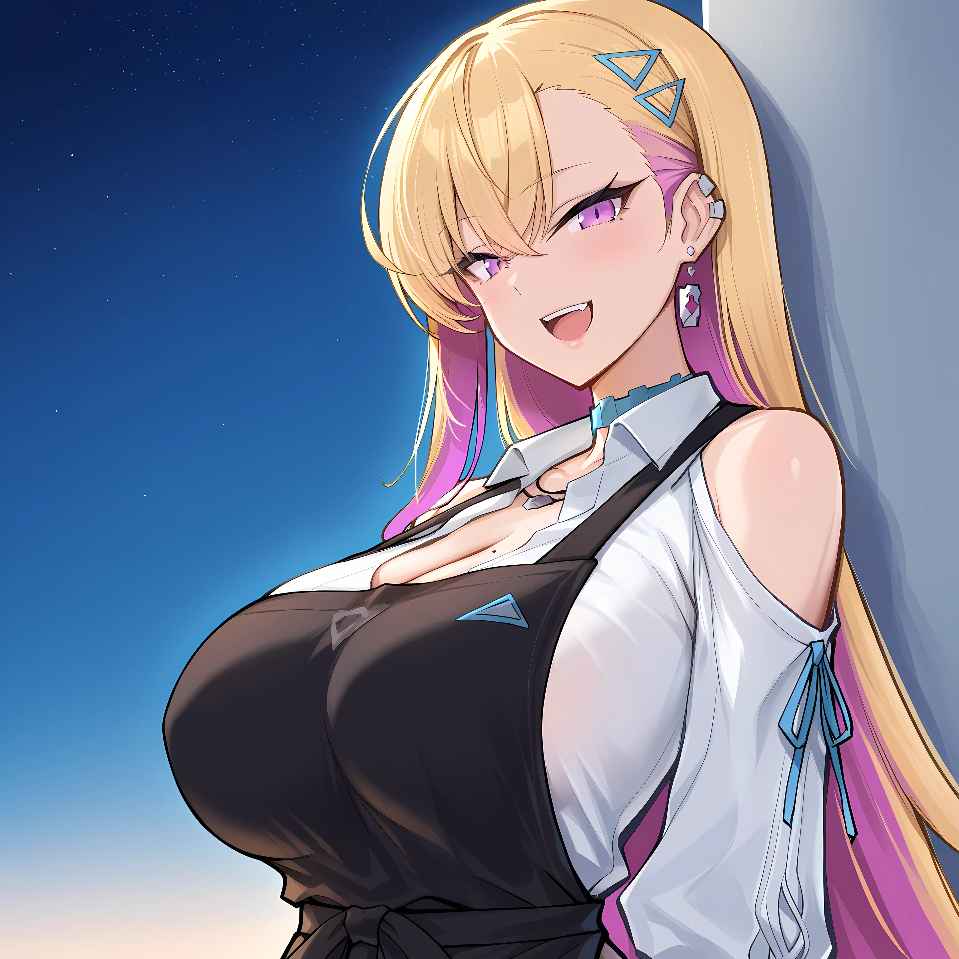 boryeon_ilxl, 1girl, blonde hair, purple eyes, jewelry, colored inner hair, multicolored hair, hair ornament, navel, pink hair, earrings, mole on breast,
