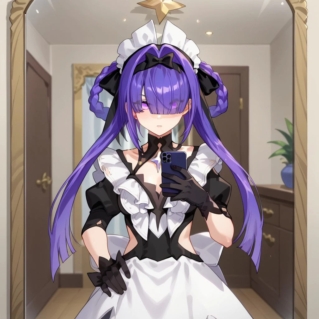 tnvt, purple hair, purple eyes, maid headdress, long hair, hairband, blunt bangs, braid, hair bow, black gloves, apron, hair rings, eyes visible through, hair over one eye, twintails, star (symbol)