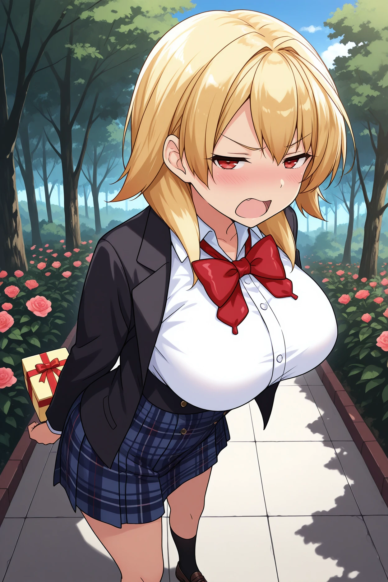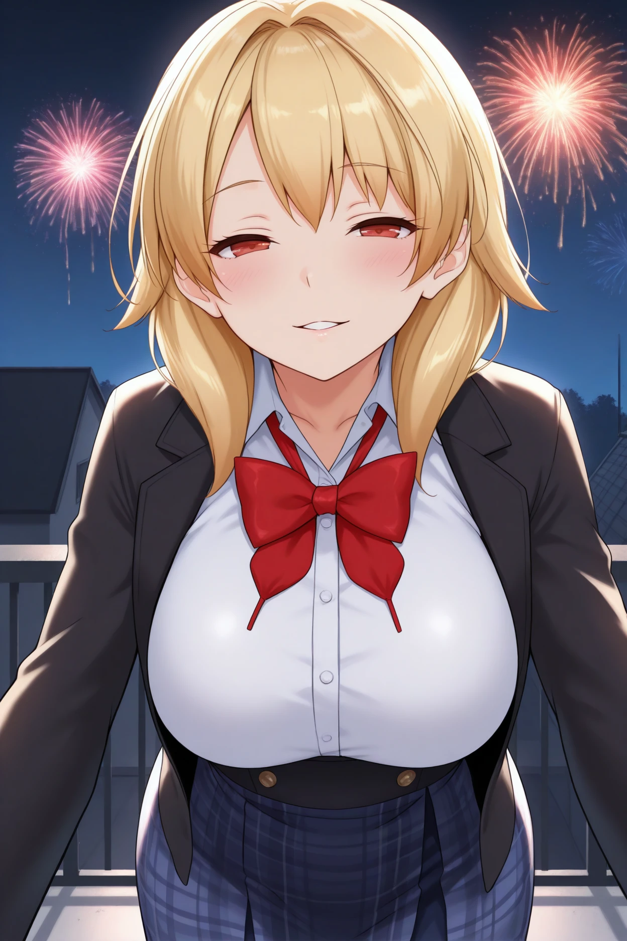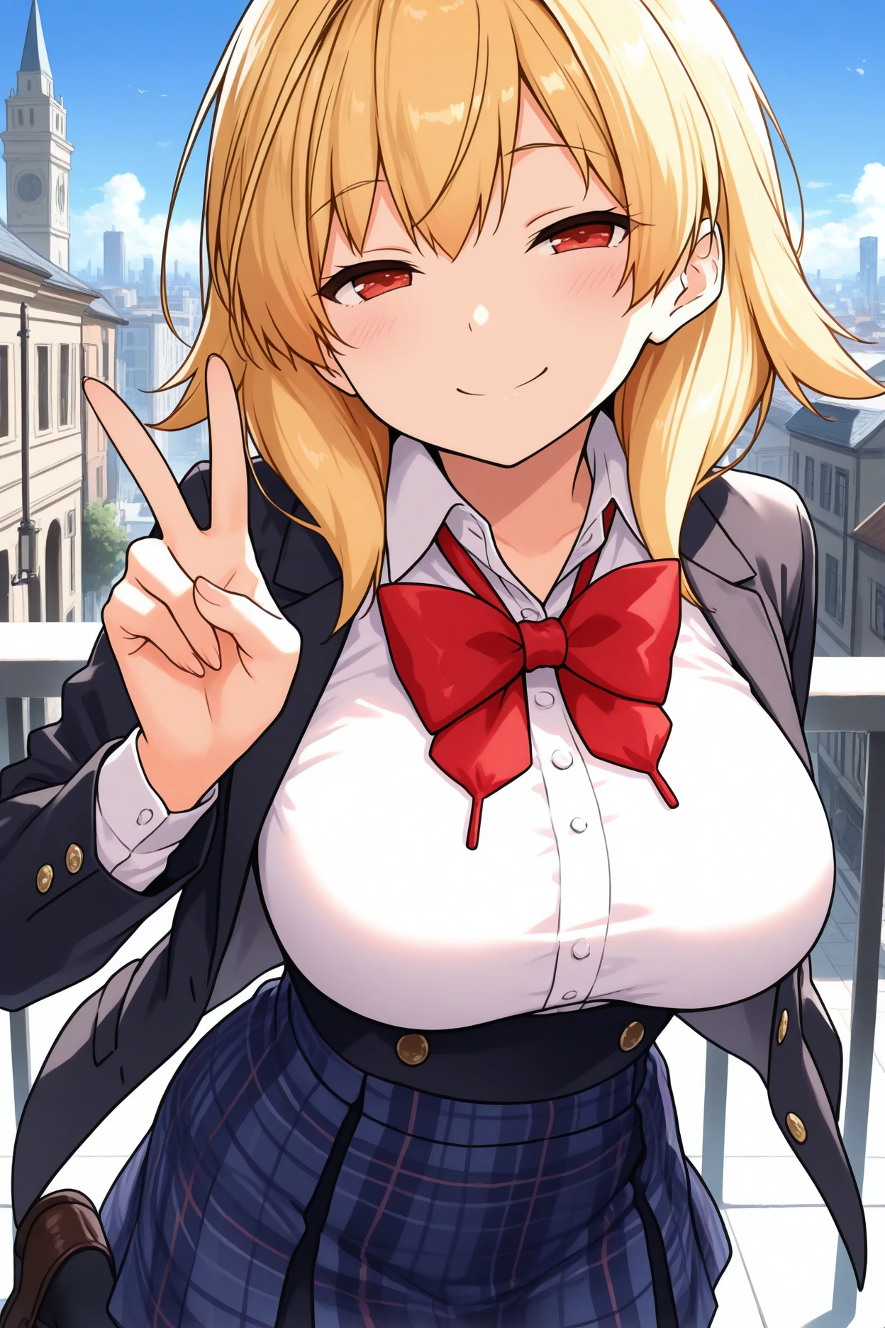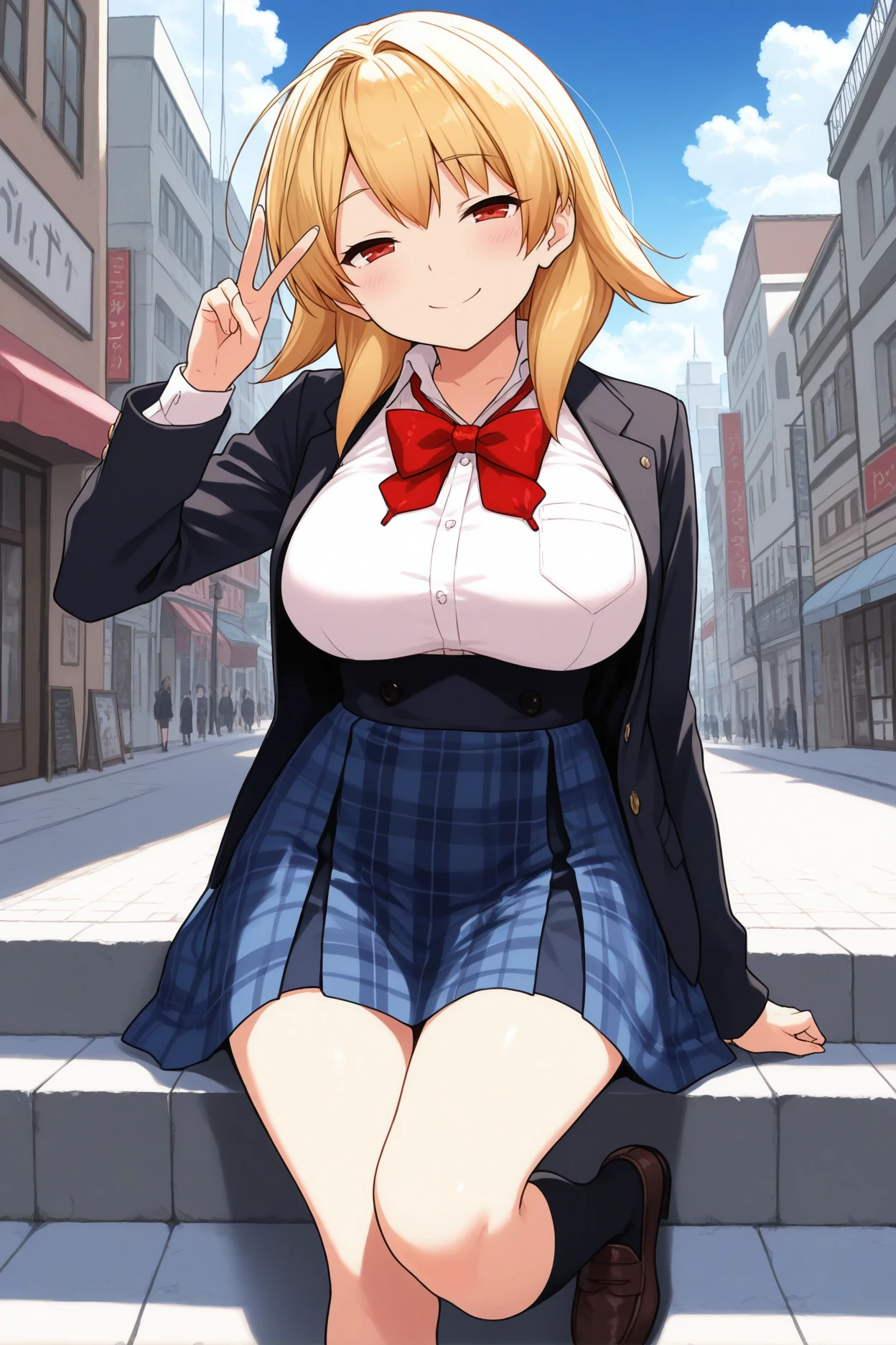 Add "red bowtie, white shirt, collared shirt, black blazer, plaid skirt, high-waist skirt, blue skirt, black socks, loafers" for her casual outfit.