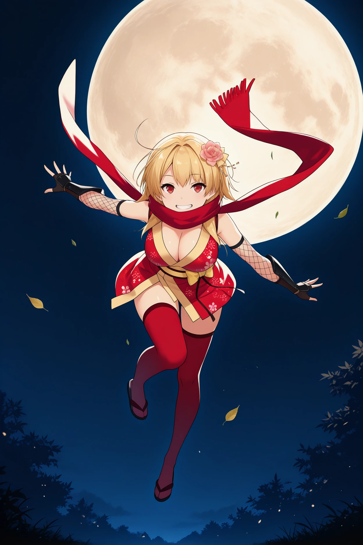 Add "hair ornament, hair flower, red kimono, cleavage, red scarf, sleeveless kimono, floral print, yellow sash, fishnets, fingerless gloves, arm guards, red thighhighs" for her ninja outfit.