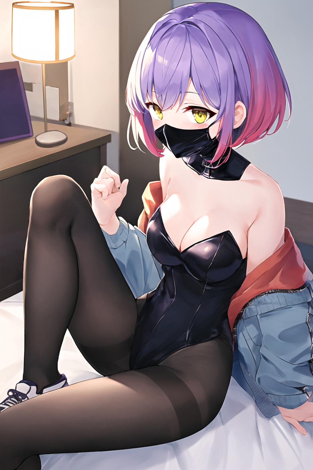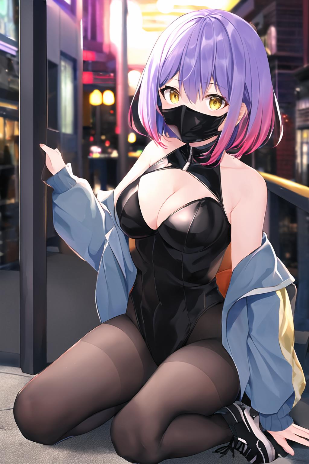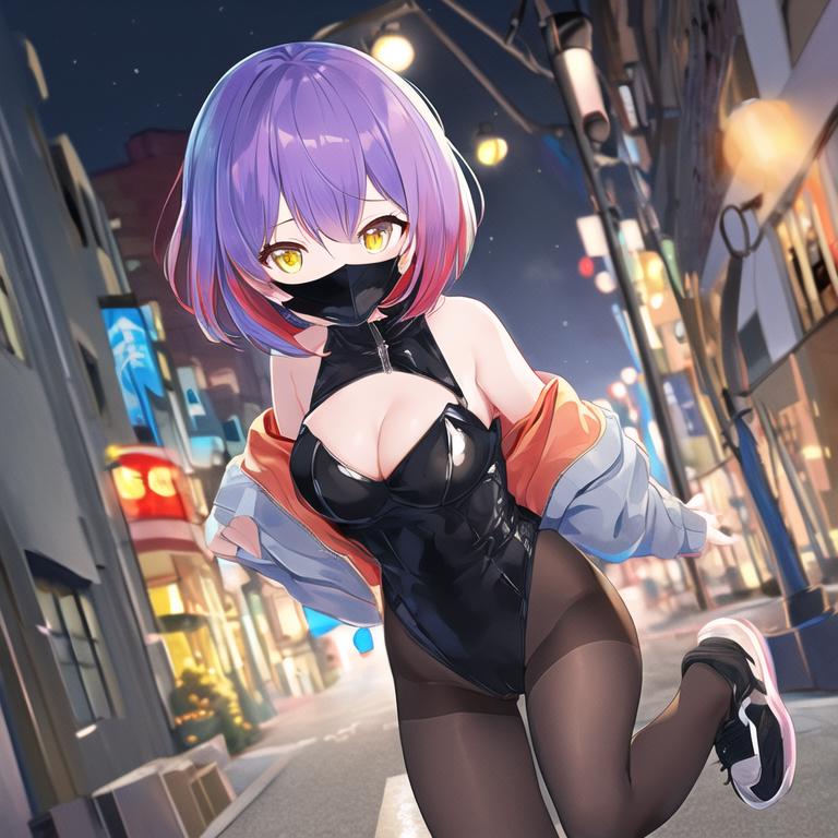 <lora:luna_(astrum_design):0.9>, (high quality:1.2), (high resolution:1.2), luna \(astrum design\),1girl, solo, purple hair, short hair, multicolored hair, yellow eyes, black leotard, jacket, black pantyhose, black sneakers, mouth maskDescription