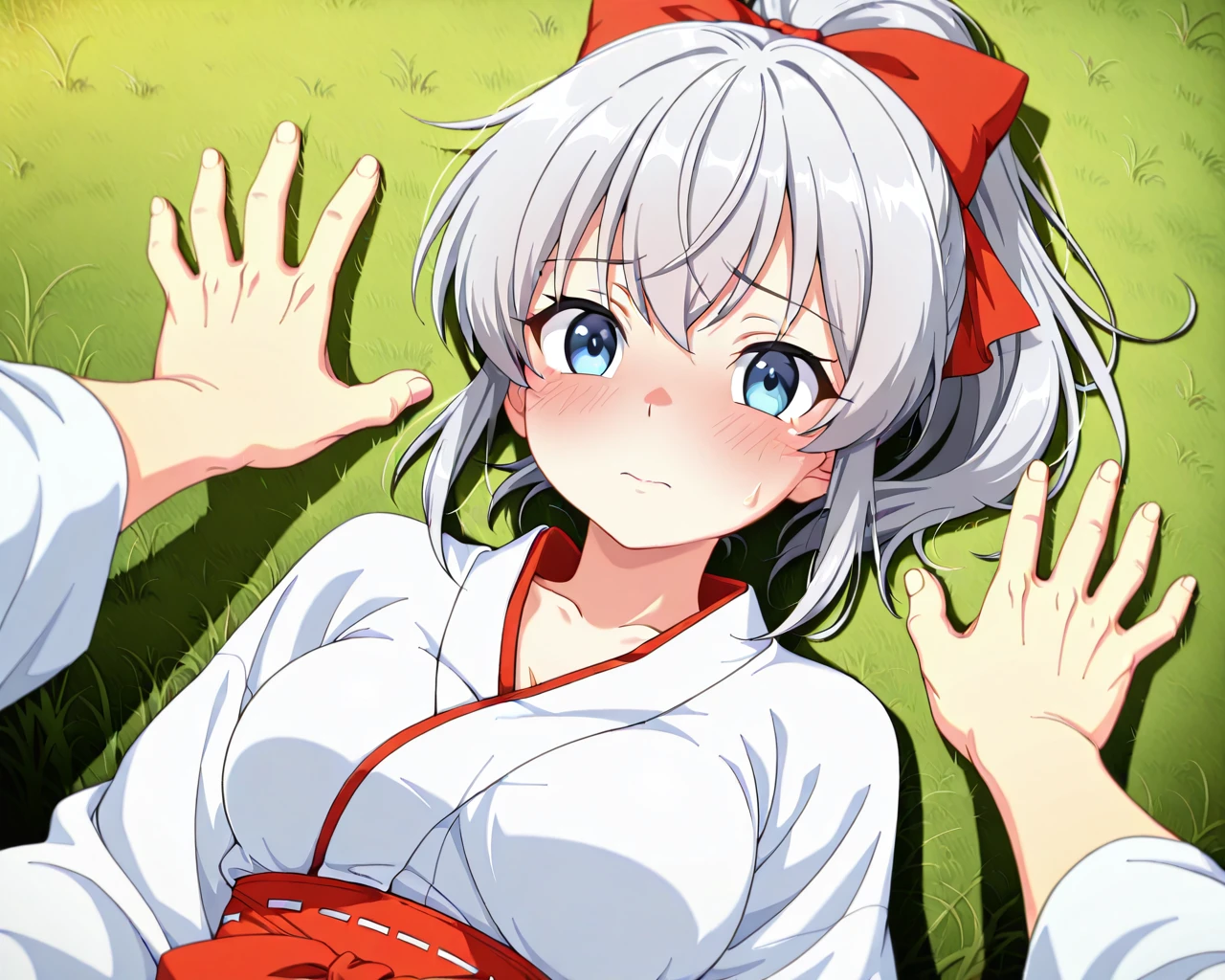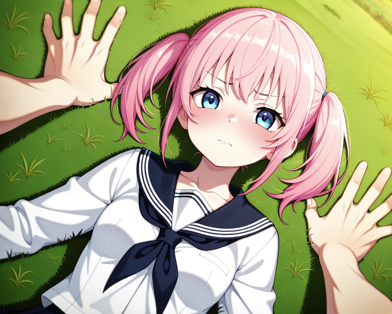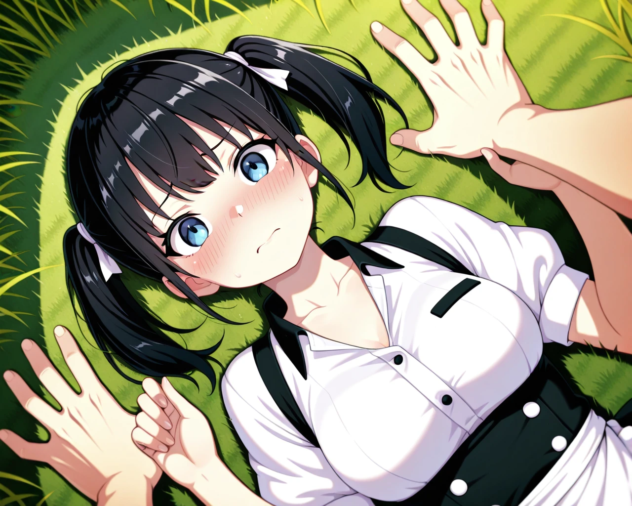 Diagonal lying-down yukadon (floor-pinning) / kabedon pose in a grassy field (one hand)