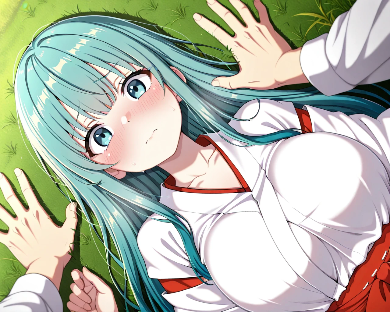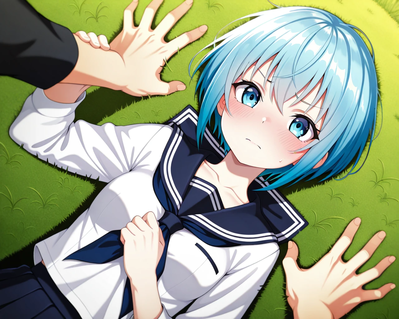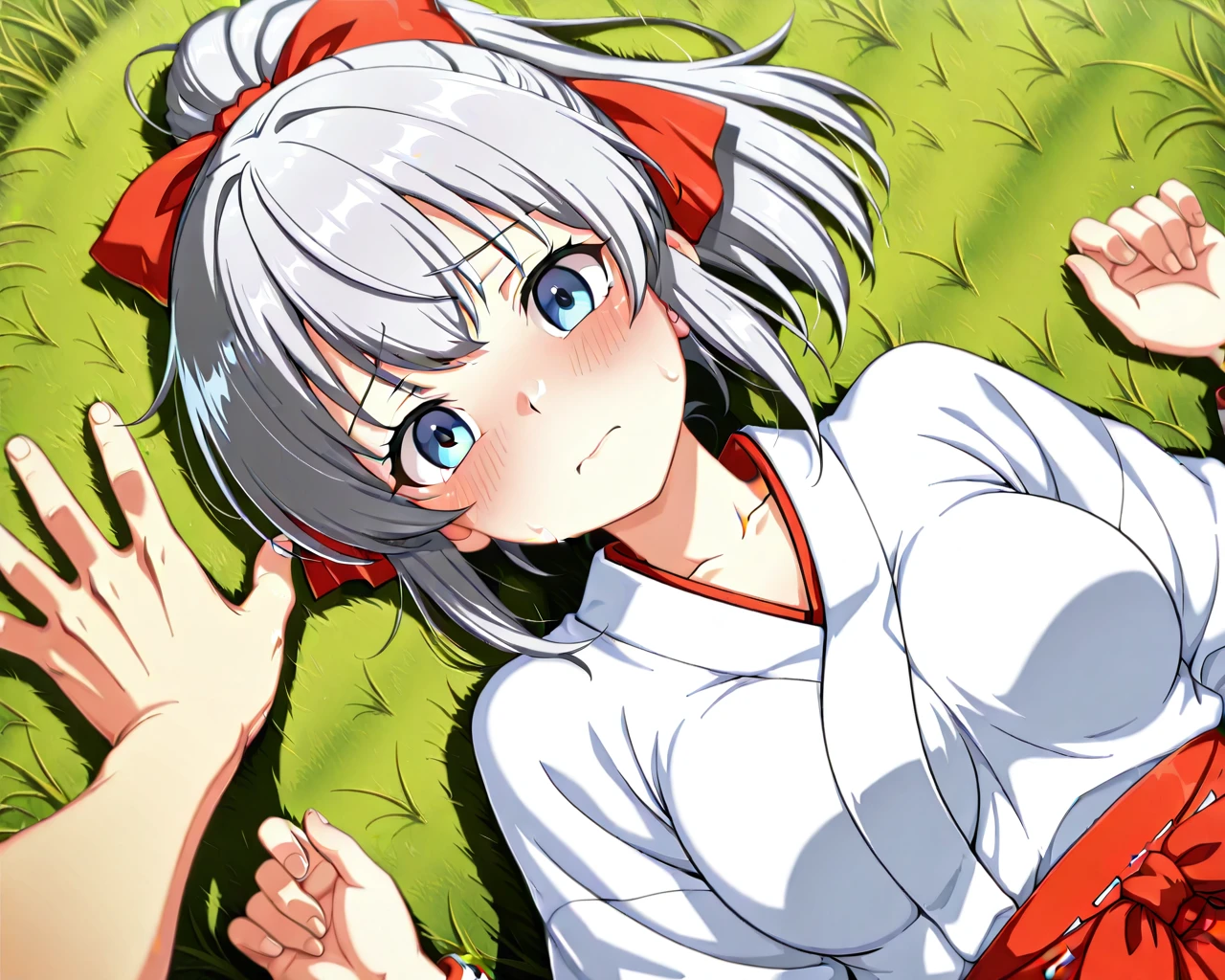 Diagonal lying-down yukadon (floor-pinning) / kabedon pose in a grassy field (one hand)