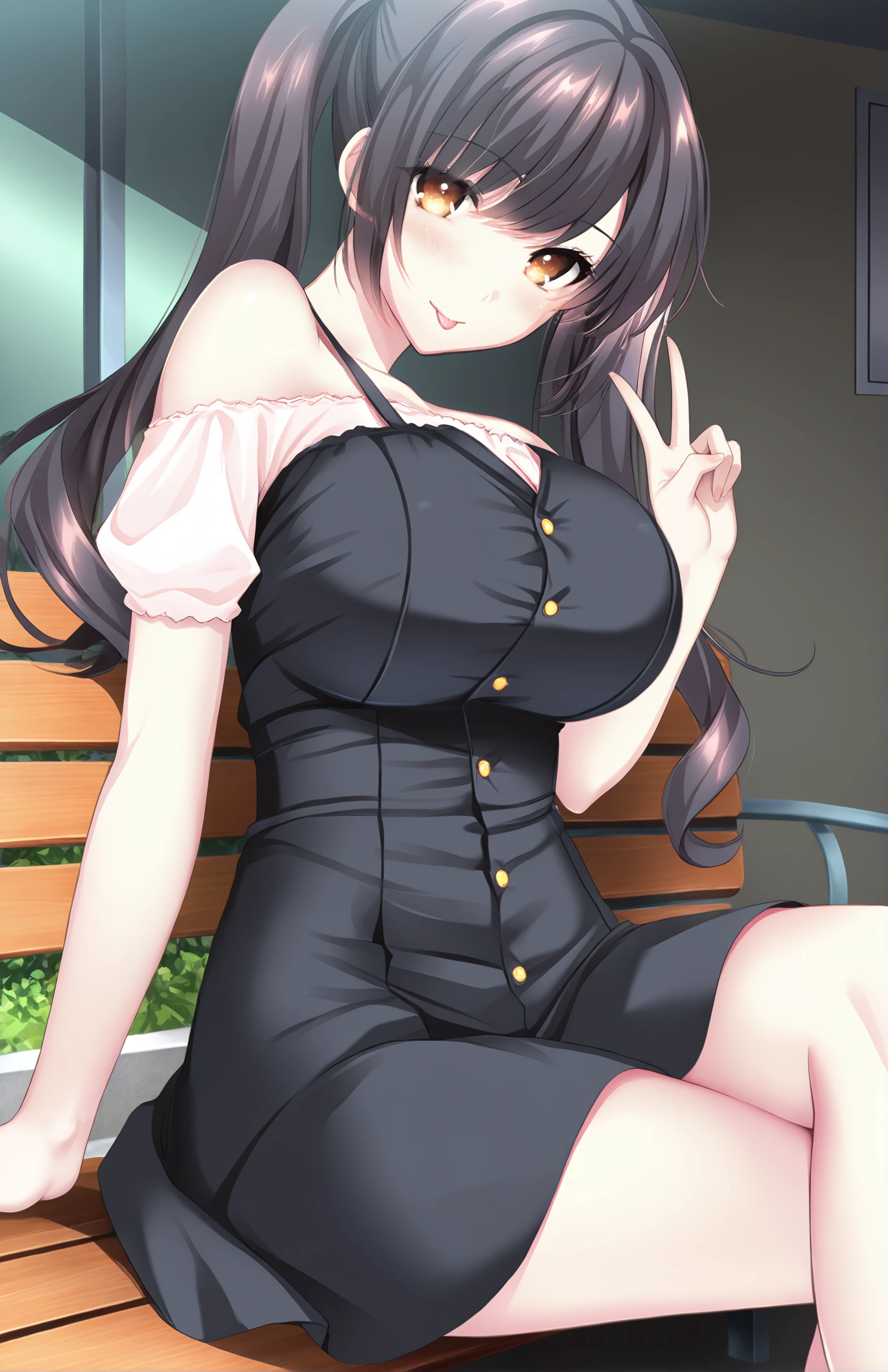 TsukimoriHina, long hair, breasts, bangs, yellow eyes, large breasts, shirt, black hair, bare shoulders, twintails, black dress, dress buttons, straps dress