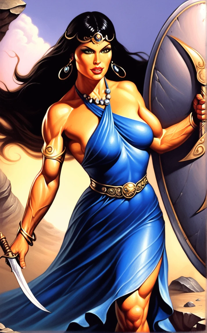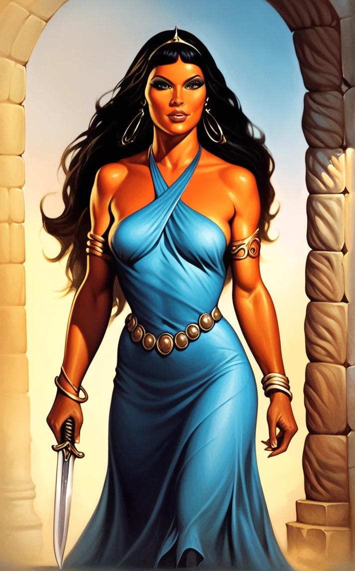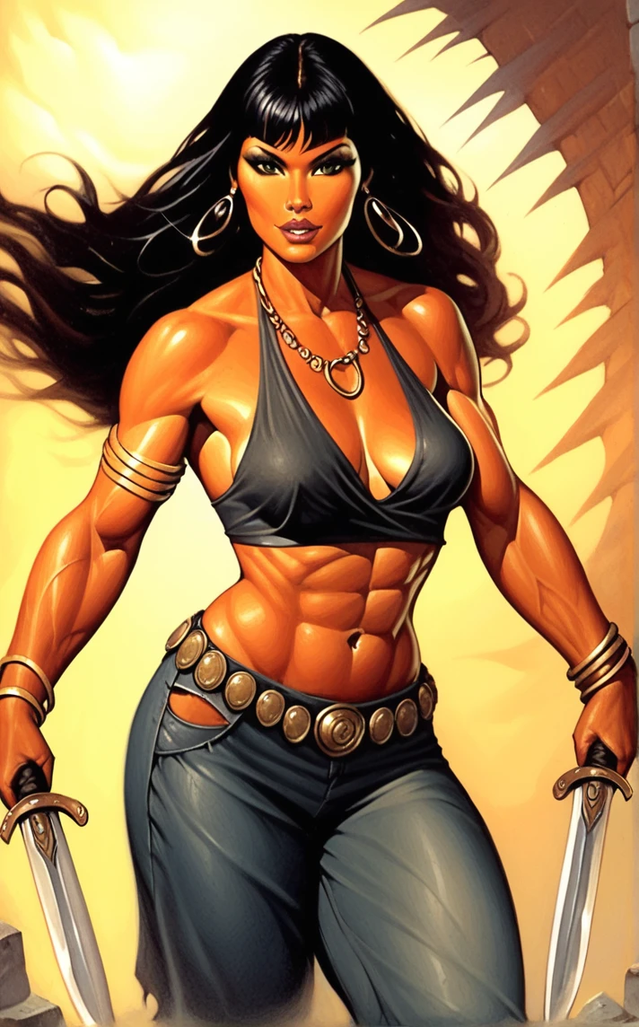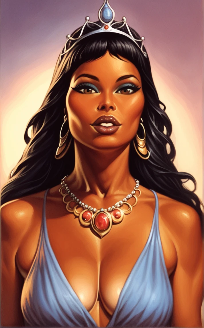 PONYXL_STYLE_kenkellyfantasyart_ownwaifu, 1girl, large breasts, black hair, navel, cleavage, jewelry, earrings, dark skin, necklace, dark-skinned female, crown, armlet, tiara, long hair, swimsuit, bikini, bracelet, strapless, makeup