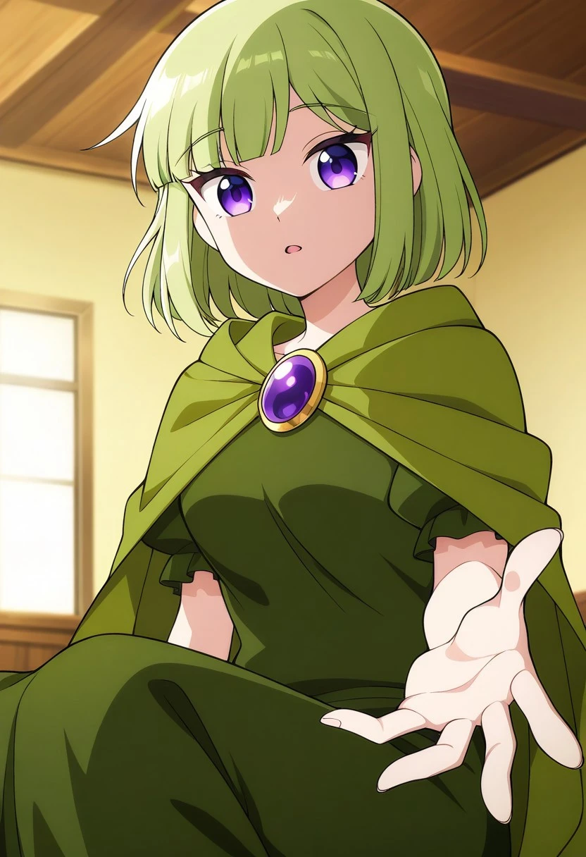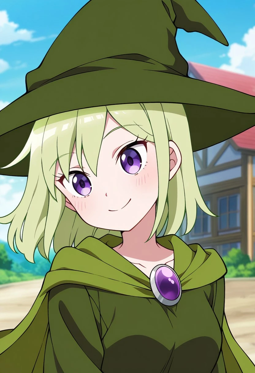 rsmy,light green hair,purple eyes,wearing a dark olive green dress,light olive green cloak green cape, purple gem,green witch hat