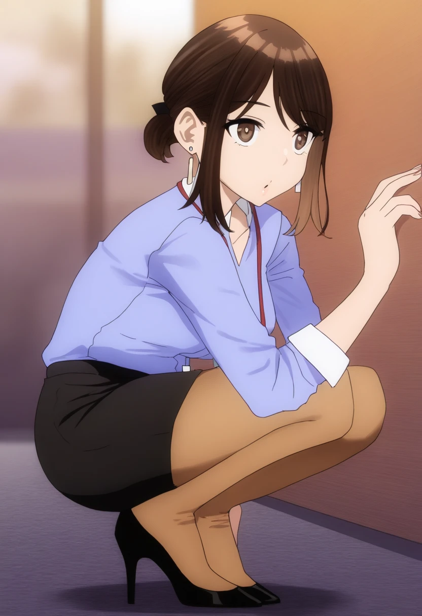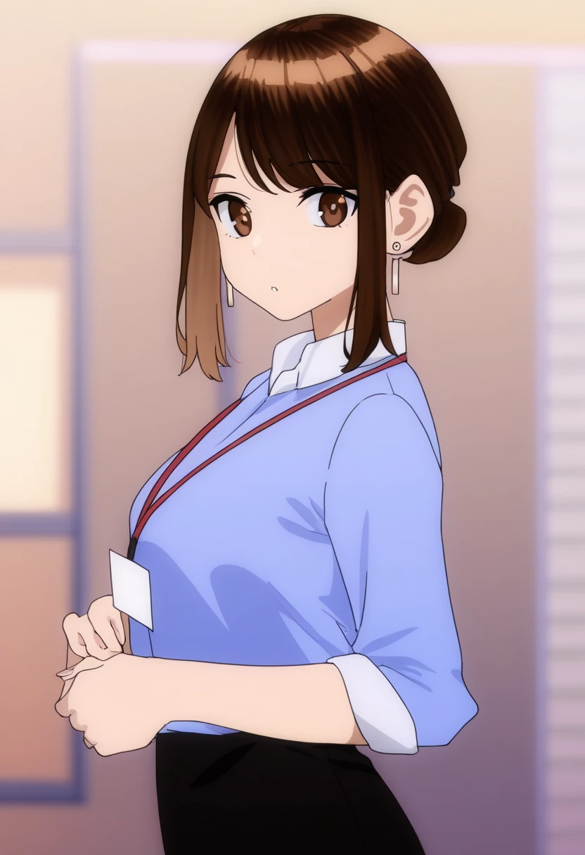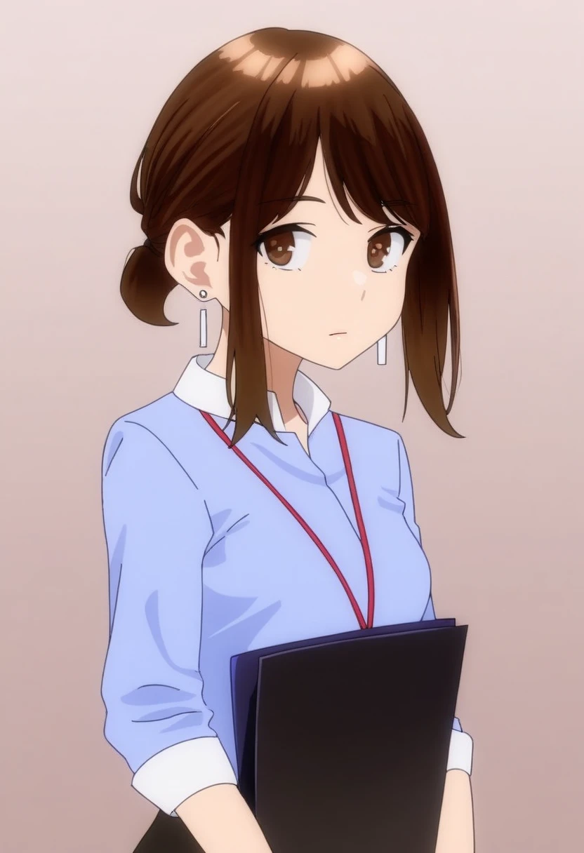 1girl, brown hair, brown eyes, sidelocks, earrings,