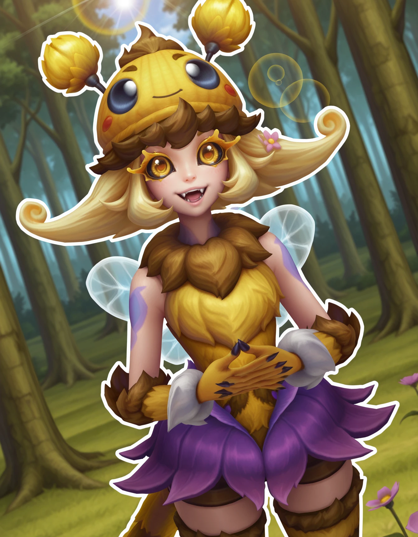 oms_beeko, 1girl, blonde, black sclera, yellow pupils, big eyes, thick eyelashes, yellow eyelashes, headwear, brown fur collar, yellow gloves, costume, flower skirt, brown shorts,bee wings, tail, thighhighs