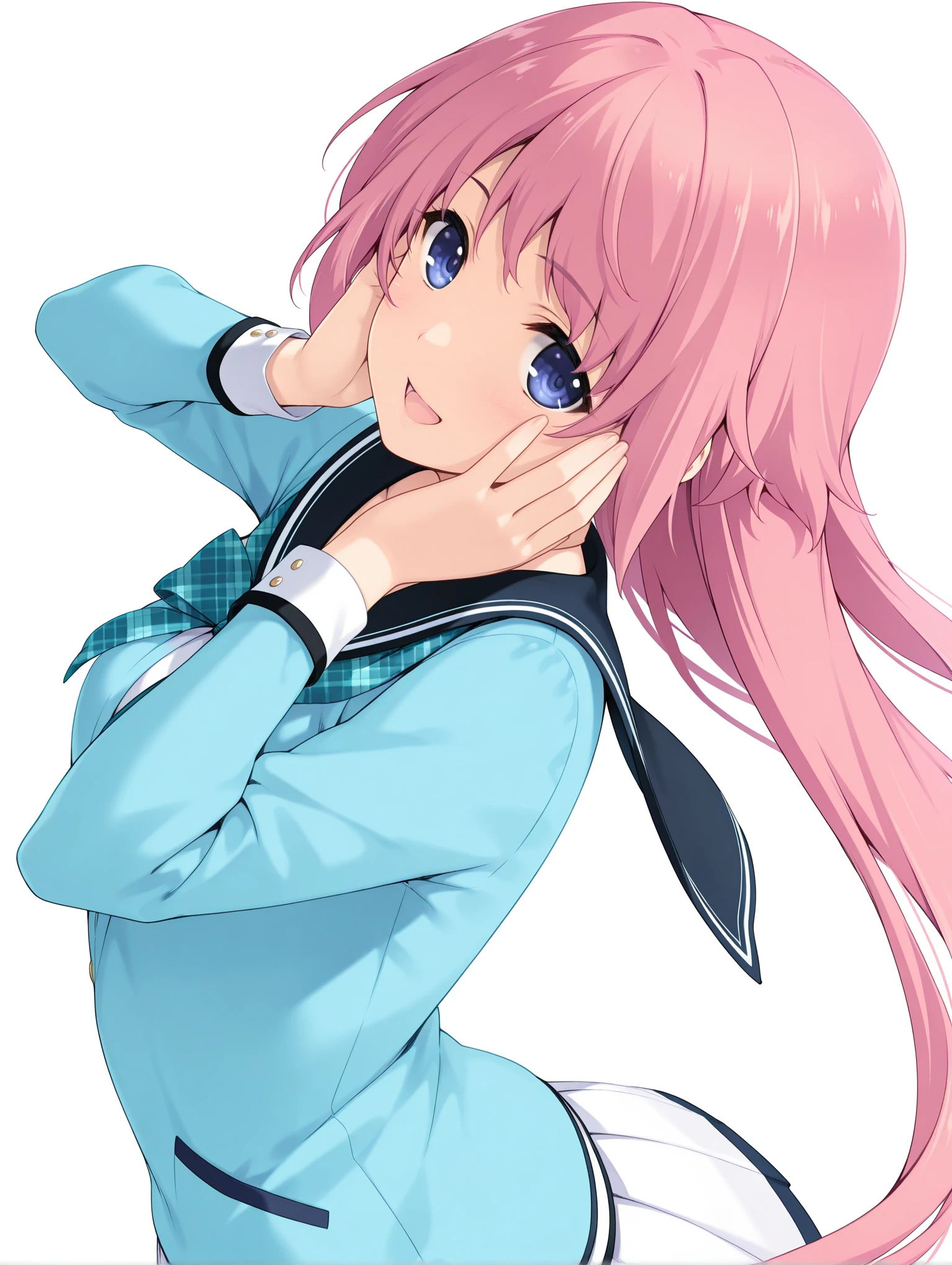 h_clothes,long_sleeves,light blue uniform,white pleated skirt,yellow socks,