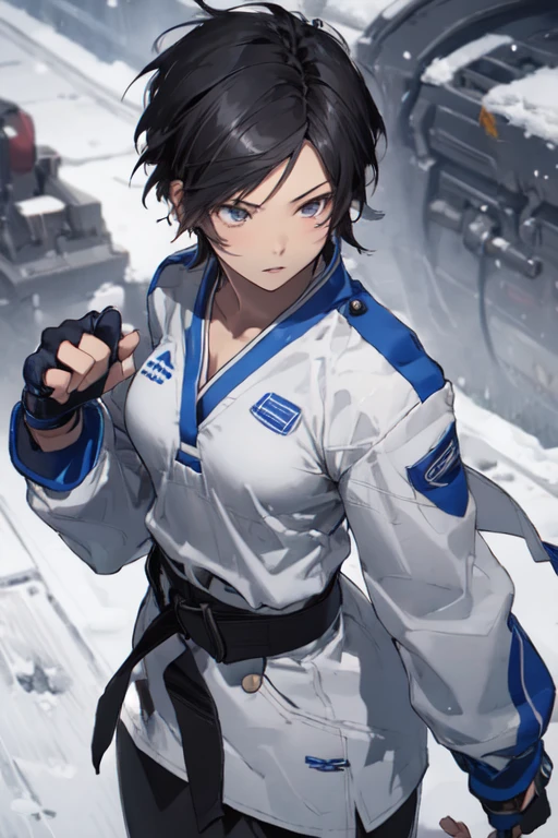 ChaeLim, 1girl, solo, short hair, black hair, white dougi, belt, fingerless gloves,