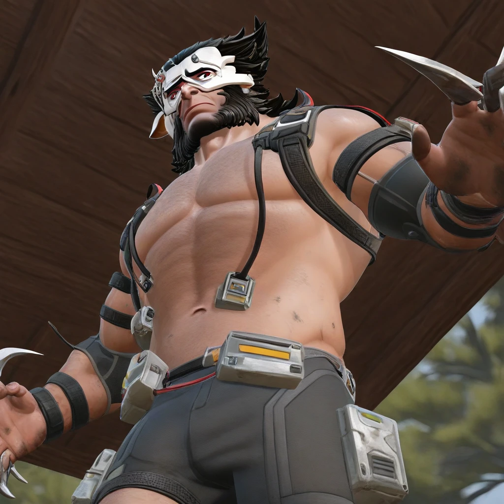Some words to trigger: weapon-x, muscular, facial hair, sideburns, beard, arm hair, body hair, cable, navel hair, chest hair, full beard, barefoot, harness, arm hair, mature male