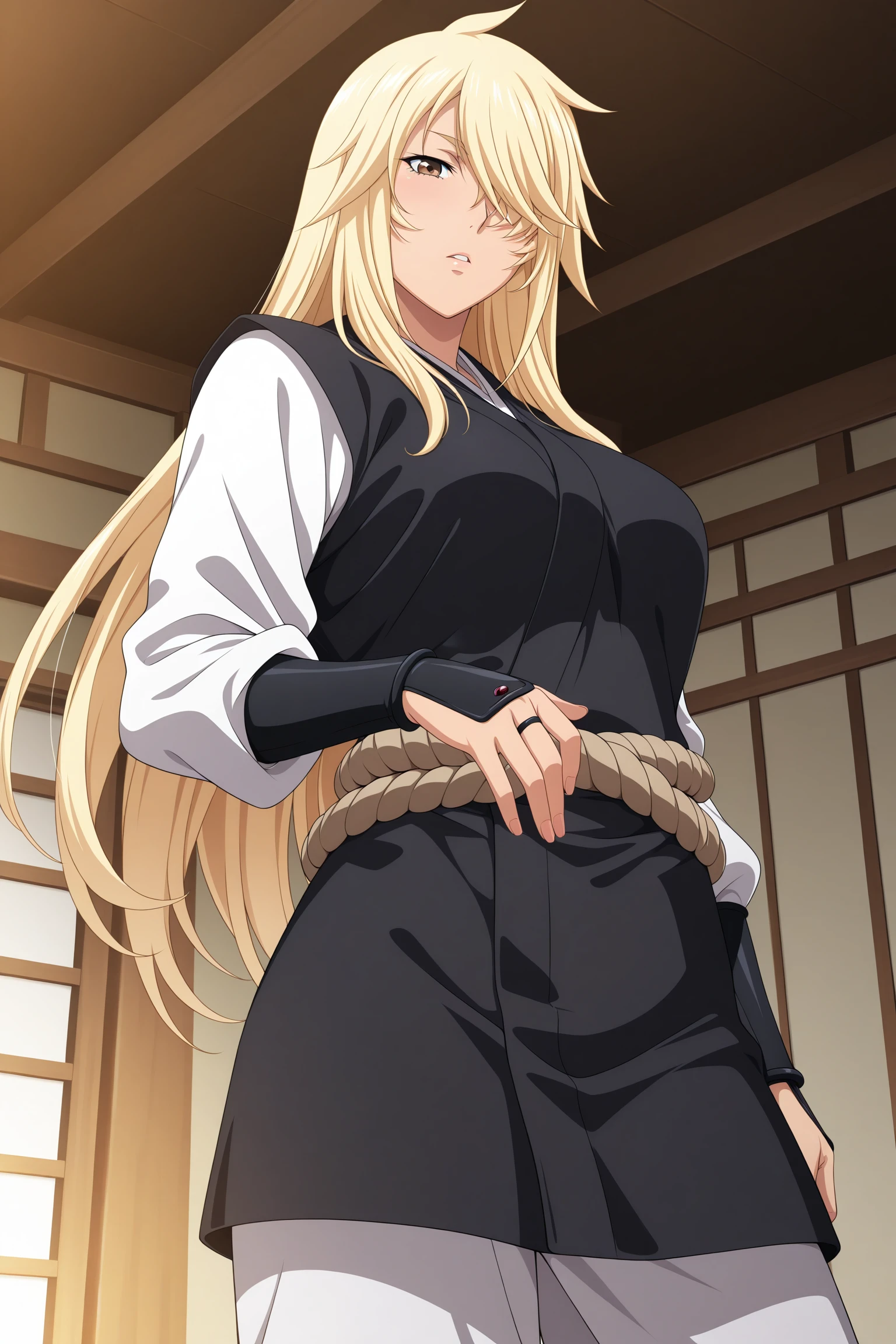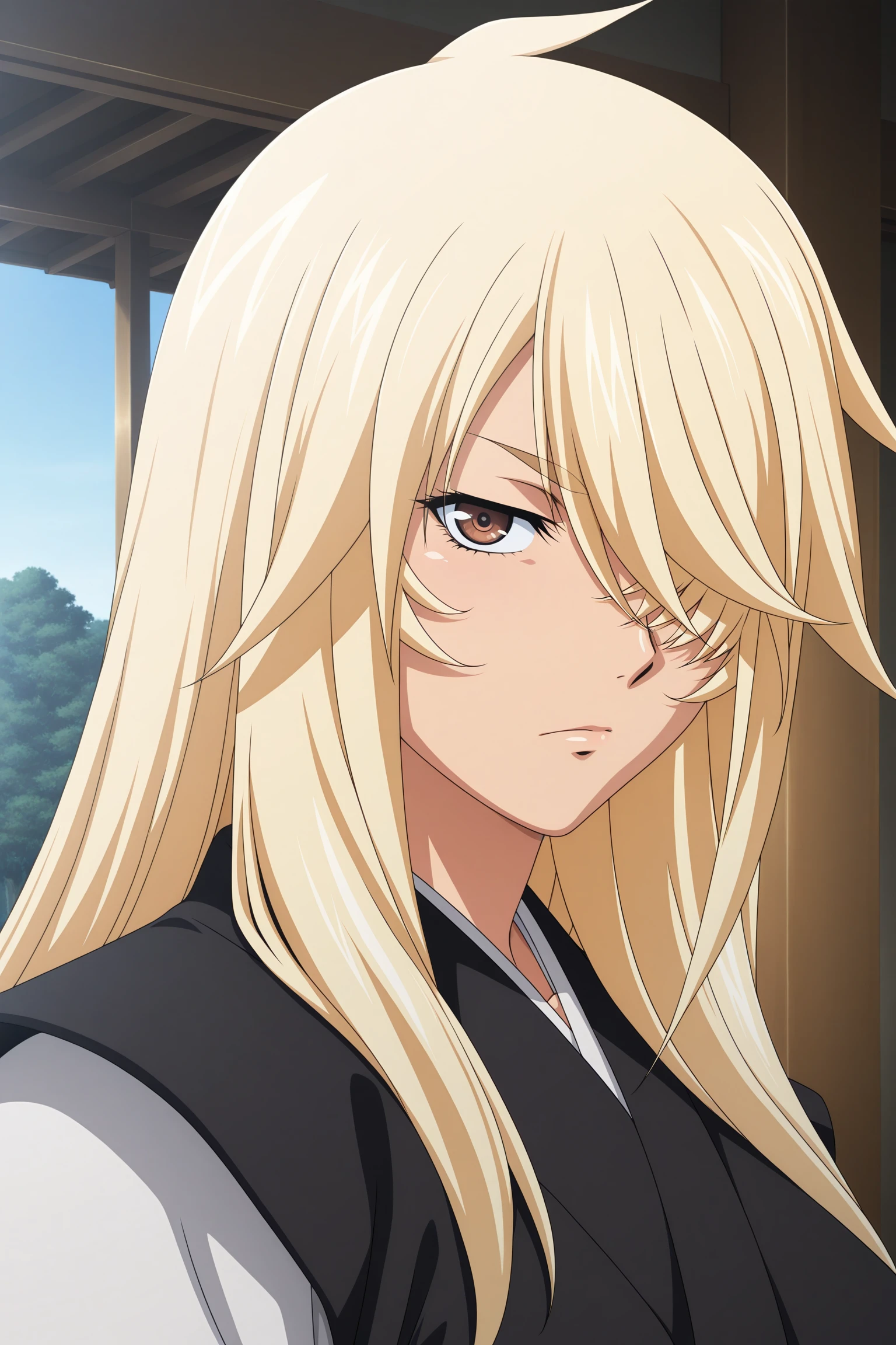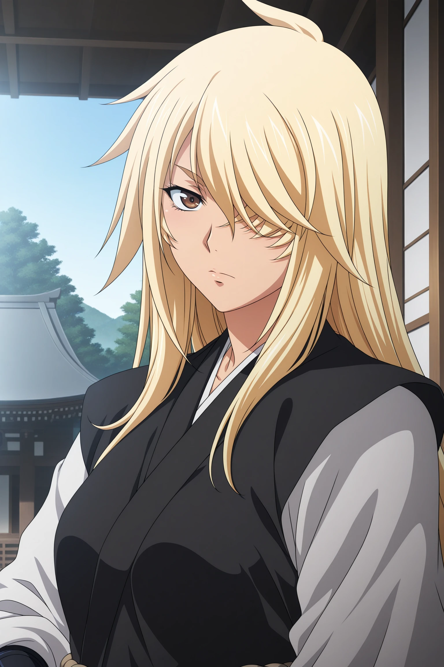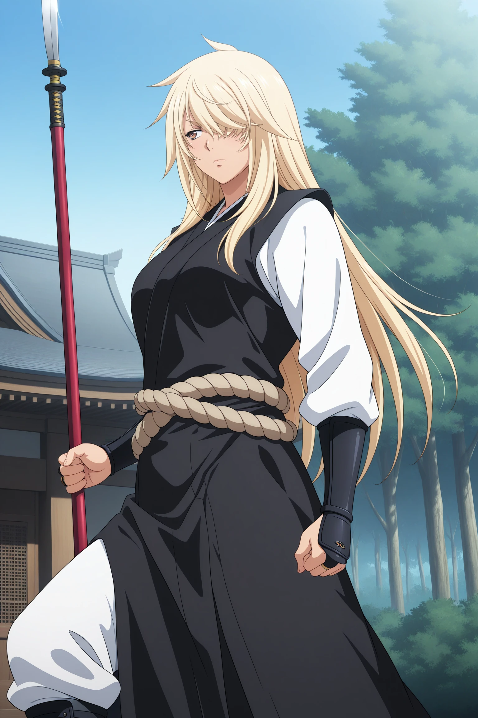 musashibou benkei, long hair, blonde hair, hair over one eye, sidelocks, brown eyes, long sleeves, white shirt, black kimono, sleeveless jacket, long jacket, wrist guards, bridal gauntlets, rope, rope around waist, white pants, shin guards, tabi, getaDescription