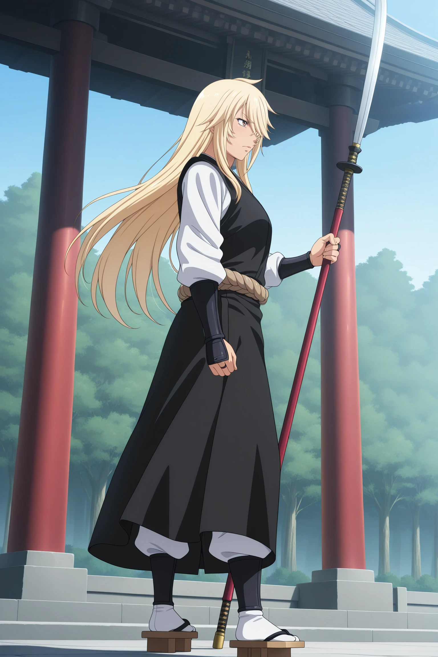 musashibou benkei, long hair, blonde hair, hair over one eye, sidelocks, brown eyes, long sleeves, white shirt, black kimono, sleeveless jacket, long jacket, wrist guards, bridal gauntlets, rope, rope around waist, white pants, shin guards, tabi, geta