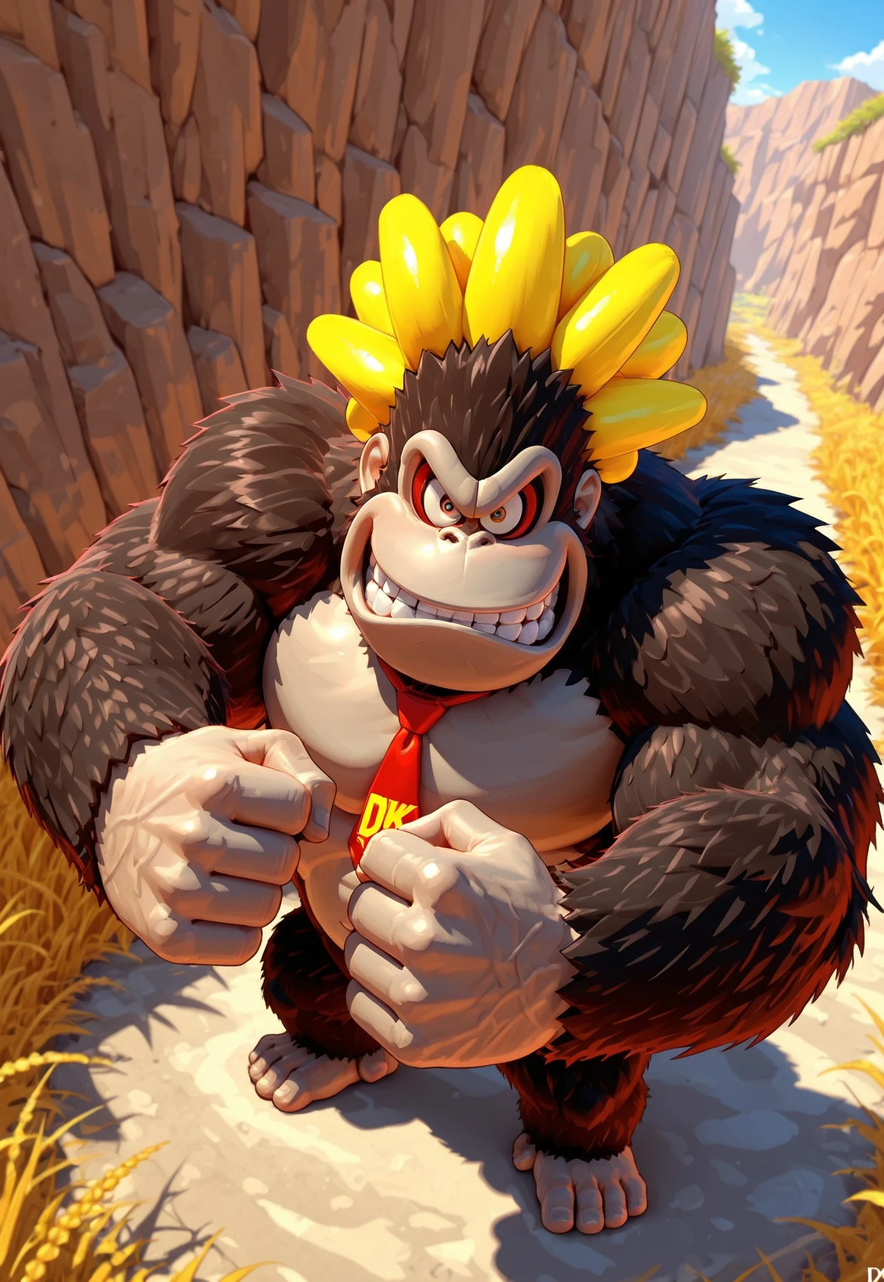 Donkey Kong, hairy body, red tie, tie says DK, banana crown, banana bracelets, gorilla, gritted teeth, big fists, red eye outlines, angry eye brows, gorilla feet, muscles, big mouth, white sclera, dark yellow eyes