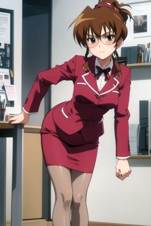 SaoriShikijou, 1girl, solo, skirt, brown hair, brown eyes, jacket, pantyhose, shoes, glasses, miniskirt, formal, suit, pencil skirt, skirt suit